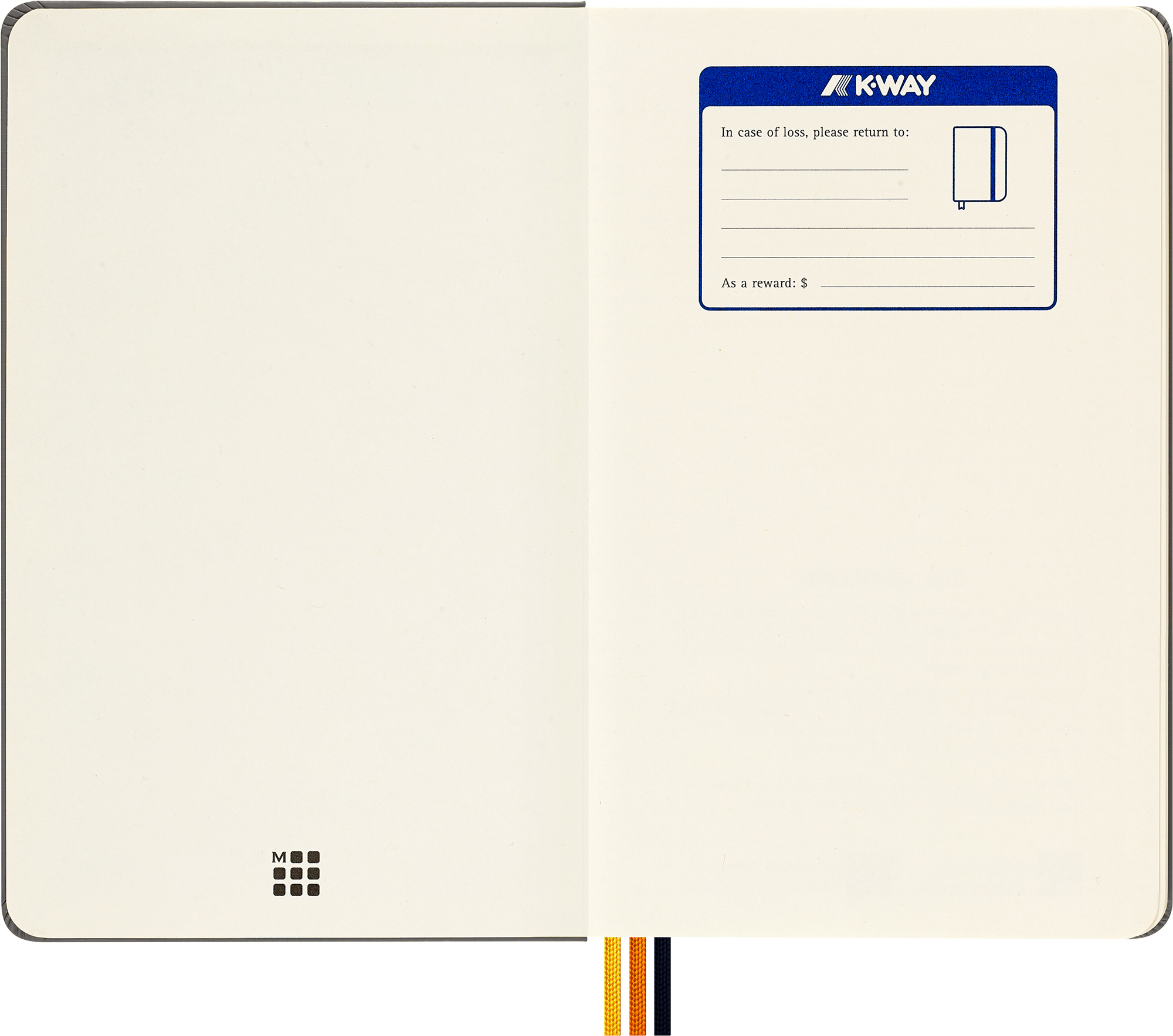Эта записная книжка в тканевой обложке воплощает классическое качество и функциональность K-Way в совокупности со свежим неброским чувством стиля этого бренда. Закрывающая ваши заметки застежка-резинка перекликается с фирменной застежкой-молнией, а три внутренние удобные ленты-закладки выполнены в этих же цветах. Форзацы ненавязчиво персонализированы логотипом K-Way на уведомлении «In case of loss» («В случае утери») и на раскладном кармашке сзади.