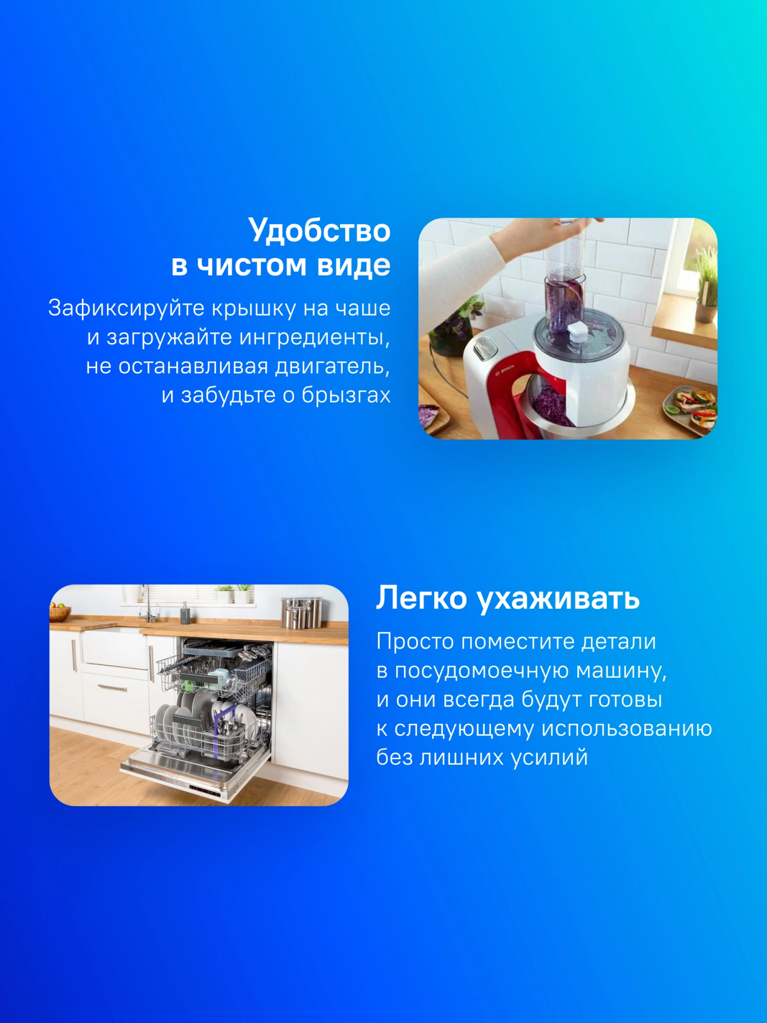 Простой и удобный в использовании благодаря функции автоматического поднятия рычага EasyArmLift. Функция автопарковки упрощает процесс смены насадок. Блендер тритан 1,25л. Прозрачная крышка с загрузочным отверстием.