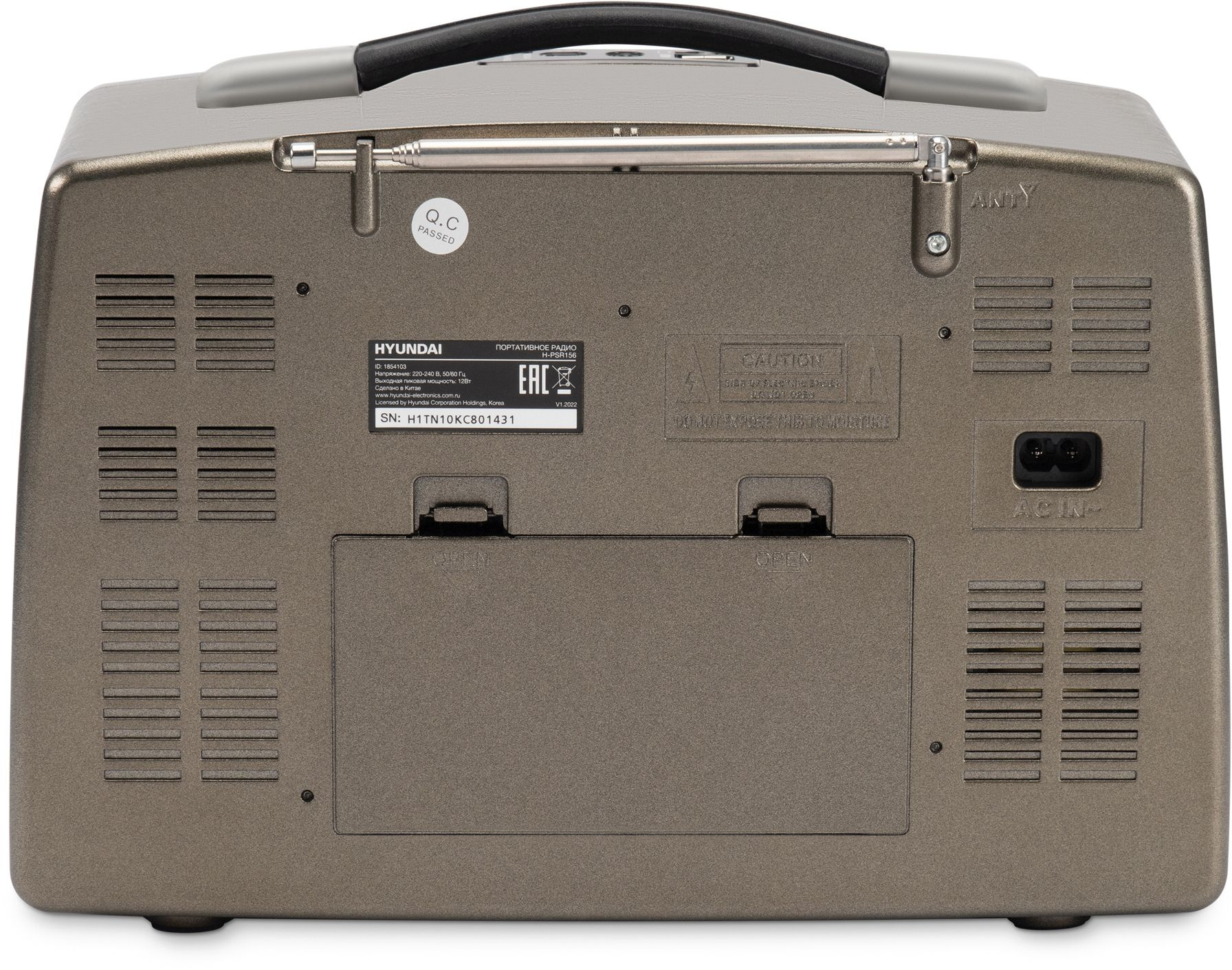 Устройство имеет оригинальный внешний вид, сочетающий ретро-элементы и хайтек. Корпус HYUNDAI H-PSR156 выполнен из лёгкого и прочного пластика, на его верхней части есть ручка для удобной переноски. Приёмник может питаться как от сети, так и от встроенного аккумулятора или 4 батареек D. В автономном режиме благодаря ёмкости установленного элемента питания 2400 мАч данная модель может работать до 10 часов.