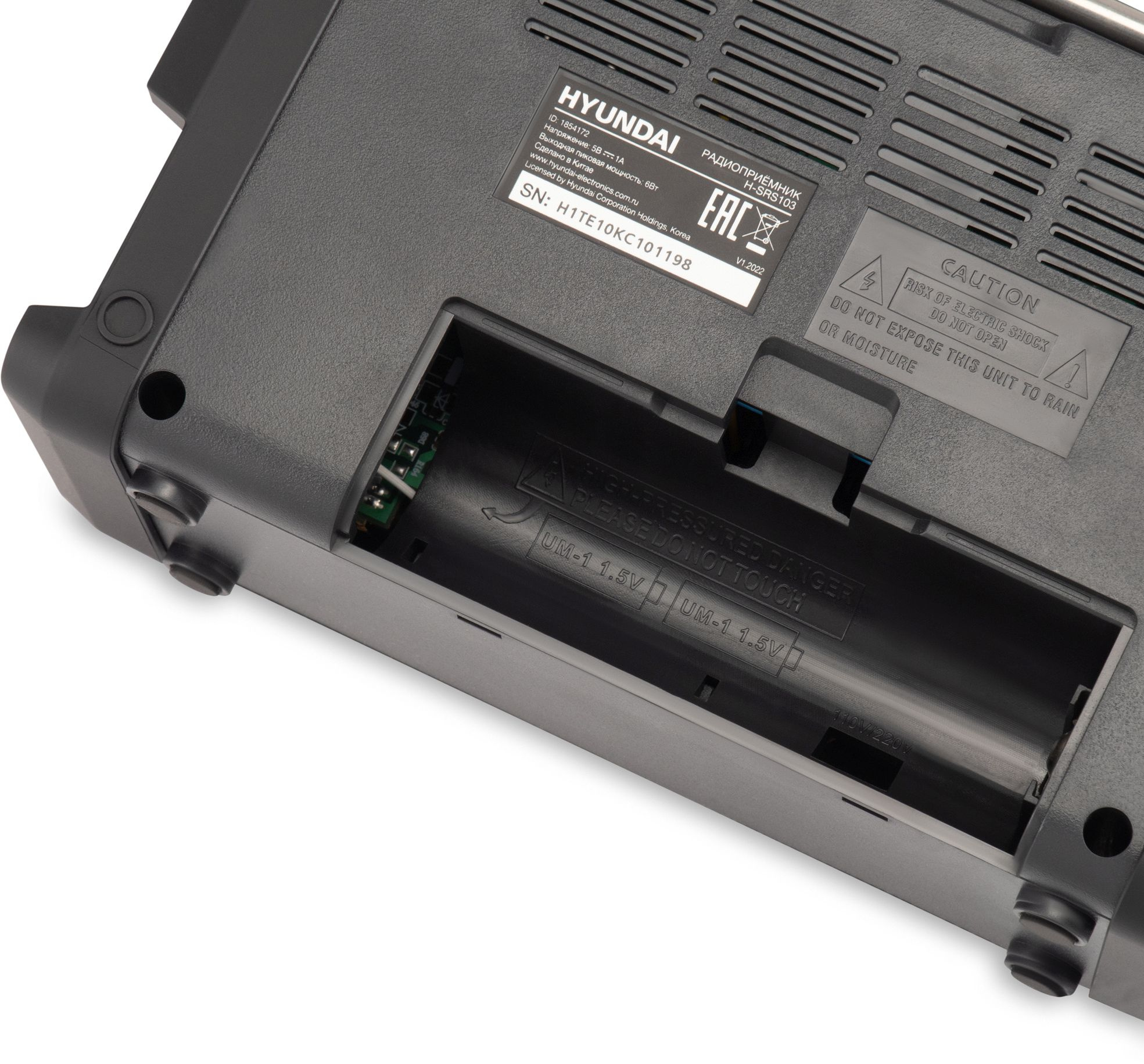 HYUNDAI H-SRS103 может питаться от сети или от двух батареек питания типа D. Время автономной работы устройства достигает 5 часов. Аналоговый тюнер устройства имеет широкий охват – он работает в расширенном FM-диапазоне, ловит частоты AM и SW. Для усиления приёма в приборе используется классическая раскладная антенна с телескопической конструкцией.