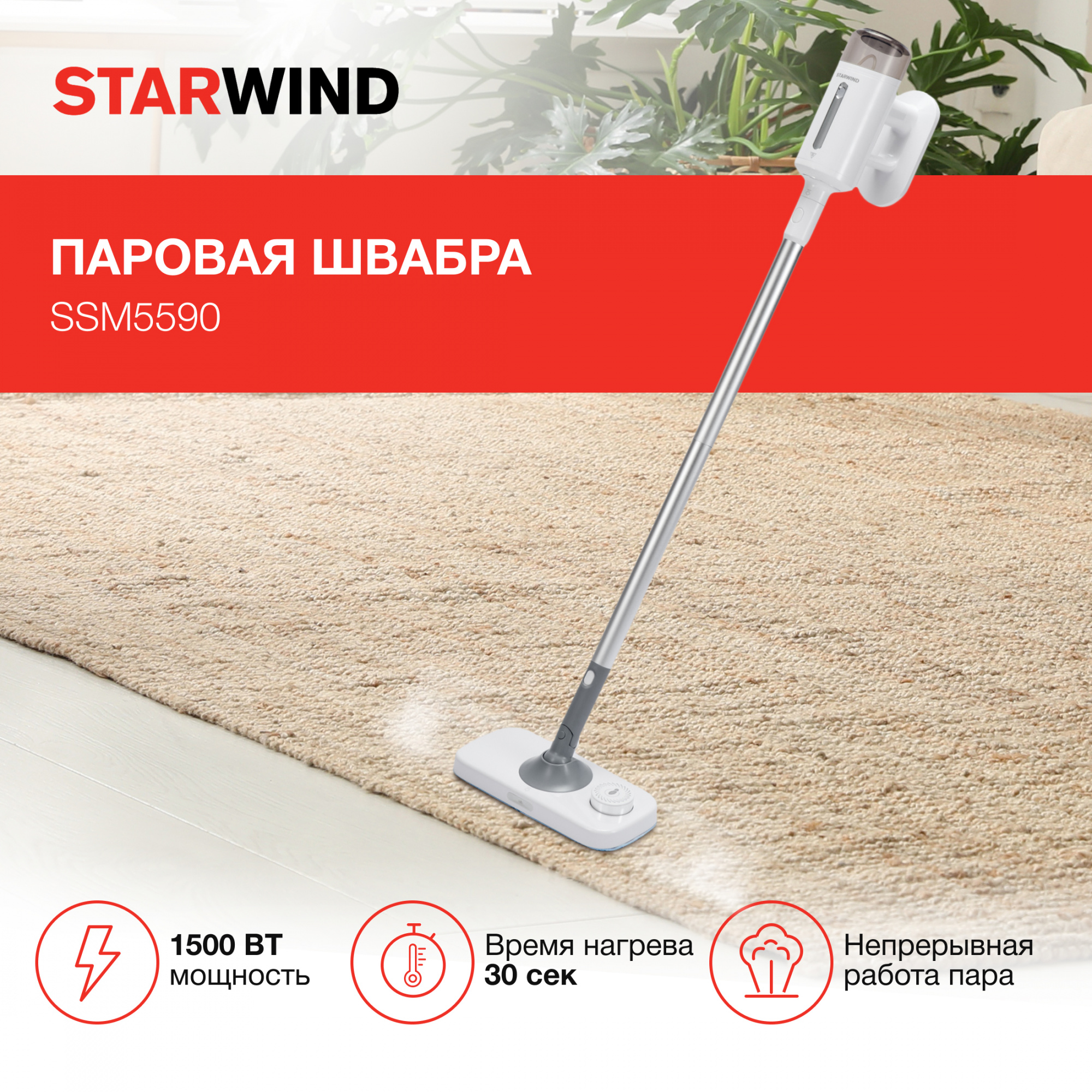 Пар – одно из самых лучших эффективных средств против любых видов загрязнений. Имея мощность 1500 Вт, Starwind SSM5590 выпускает его под давлением по вертикали и горизонтали, воздействуя на пятна и быстро удаляя их. Регулировать направление подачи можно ногой, радиус действия достигает 6 метров. Устройство быстро справляется с любыми видами грязи. До рабочей температуры Starwind SSM5590 нагревается менее, чем за 30 секунд. При этом швабра может работать непрерывно до 20 минут.