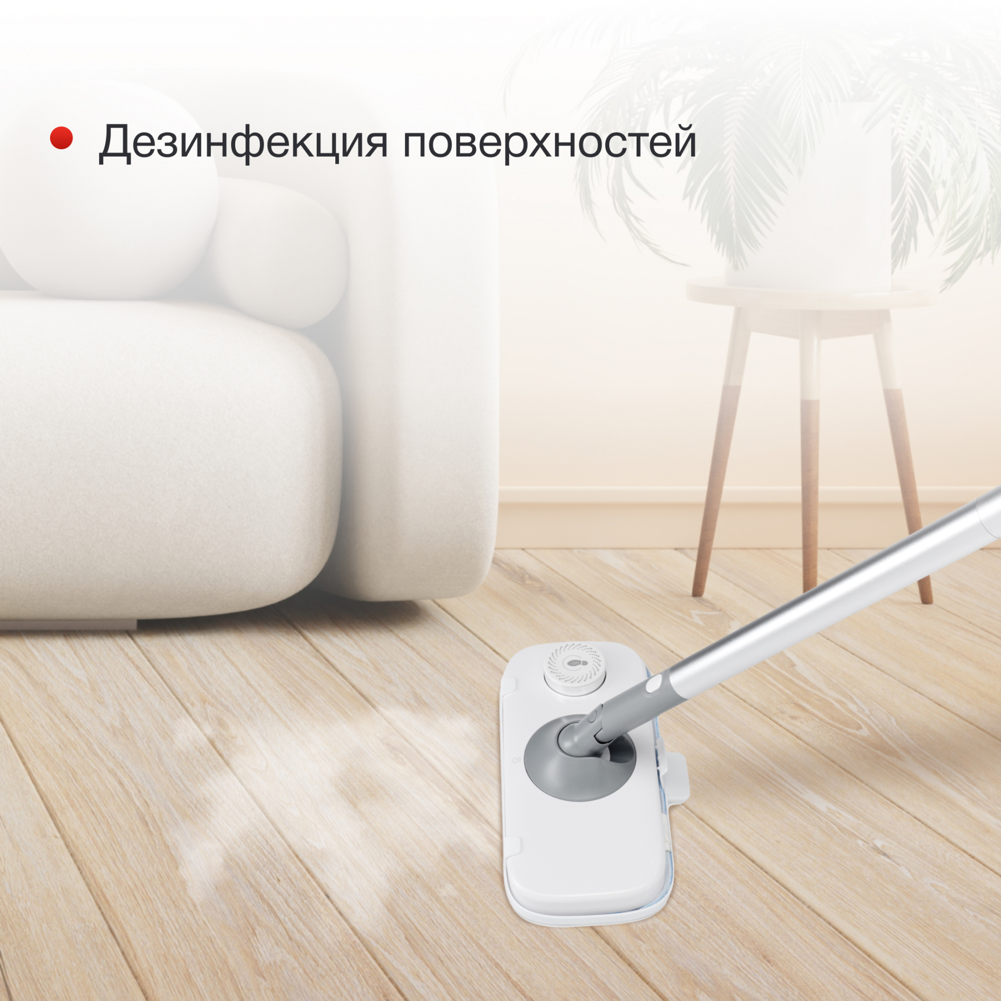 Данная модель не только очищает, но и дезинфицирует поверхности. В период простудных заболеваний эта функция особенно актуальна, потому что позволяет отказаться от использования какой-либо бытовой химии, но проводить регулярную обеззараживающую уборку. Для генерации пара прибору необходима только вода в объёме всего 0,4 л. Когда она заканчивается, устройство отключается автоматически. Прибор защищен от перегрева.