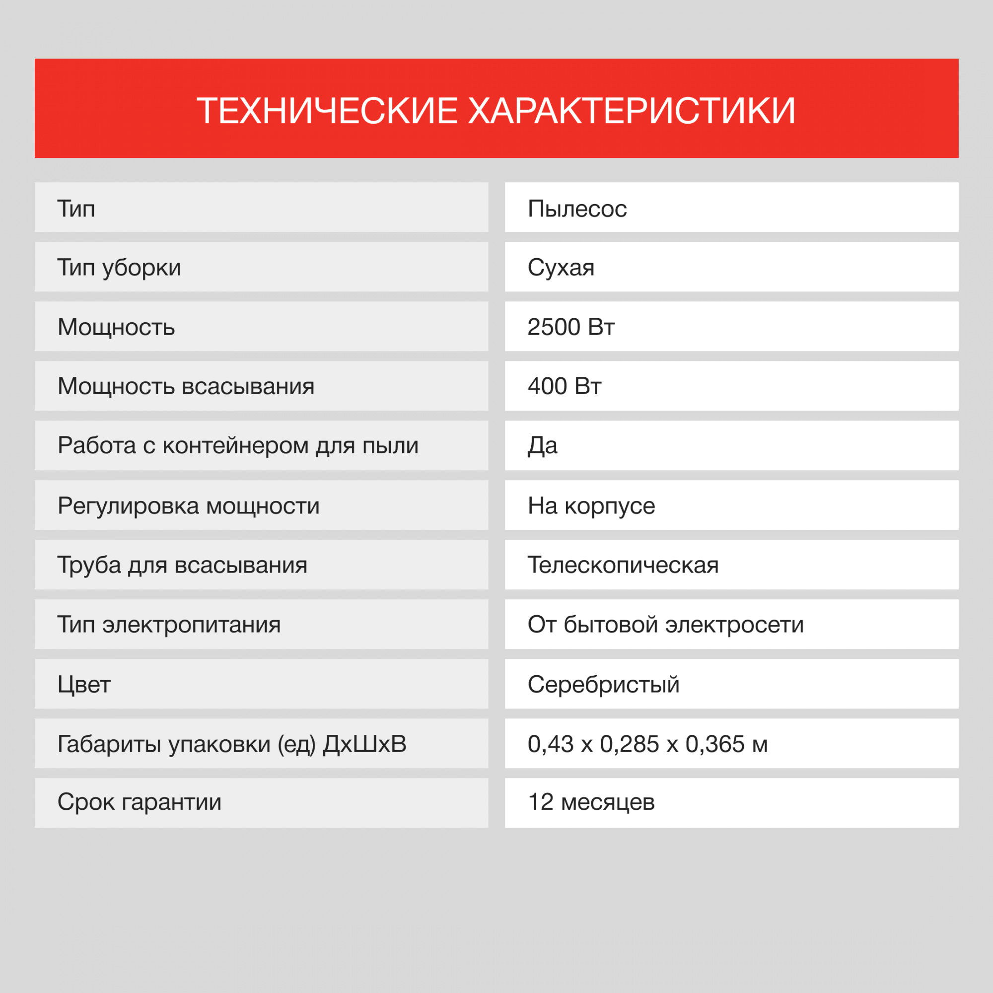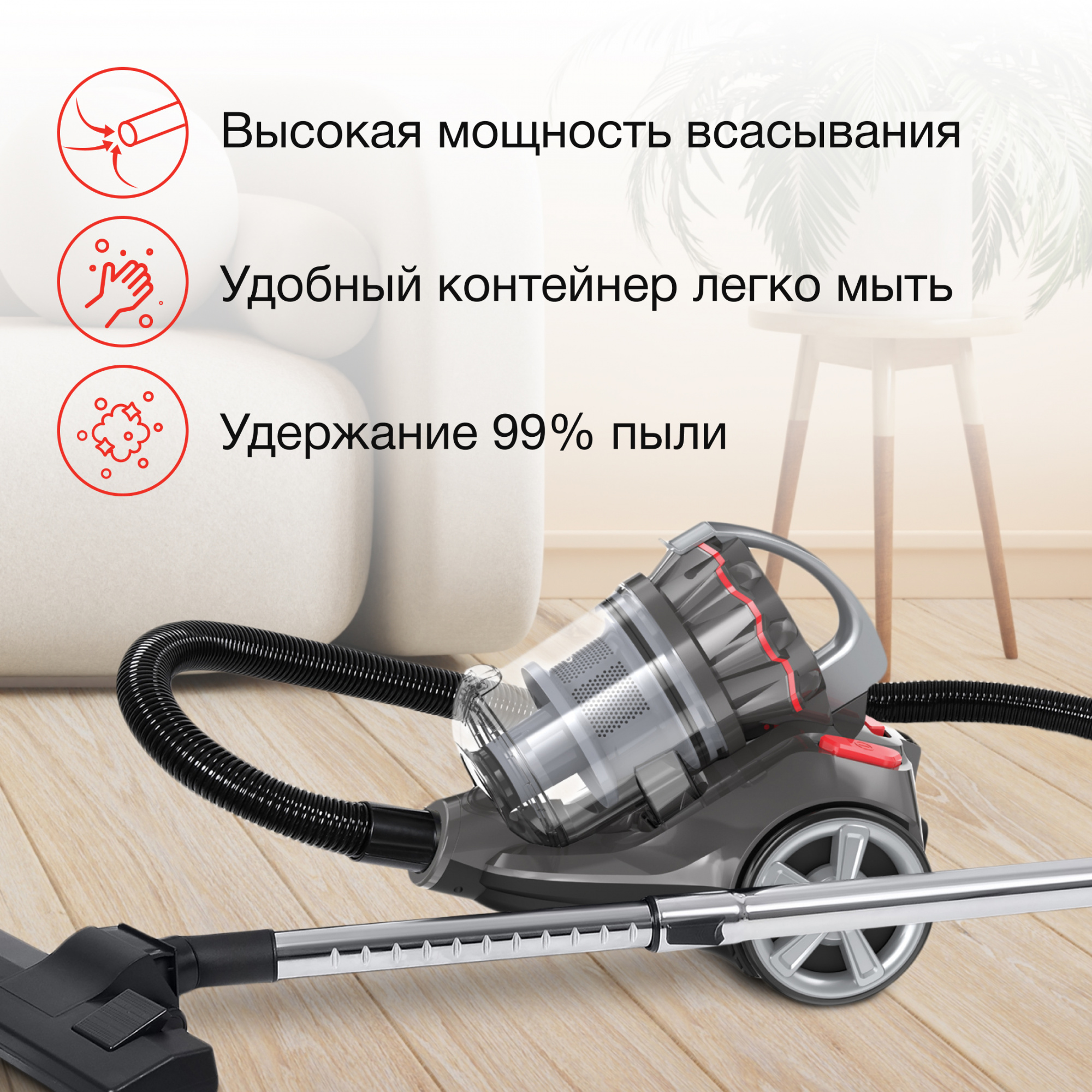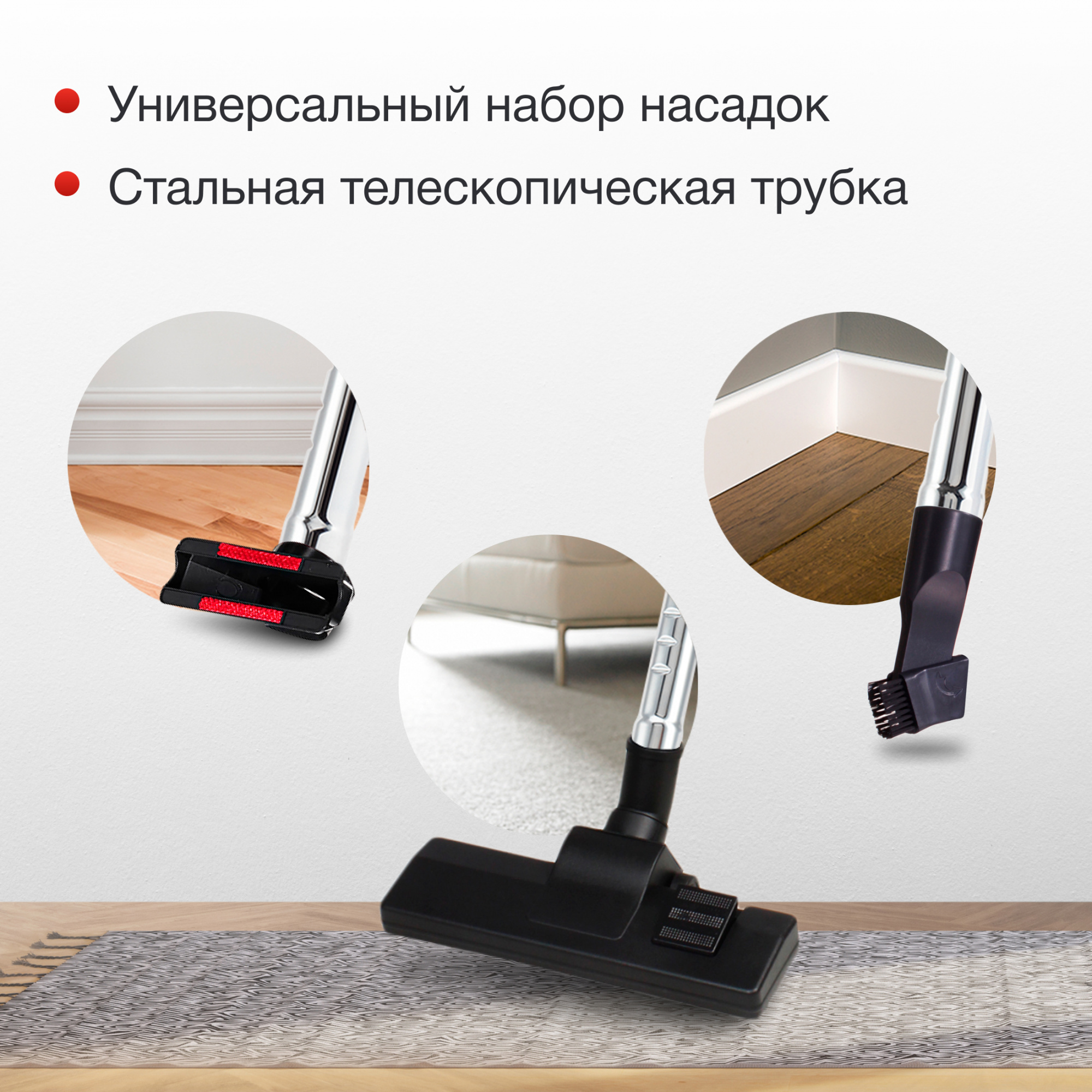 легко очищаемый пылесборник, место для хранения насадок, шланг