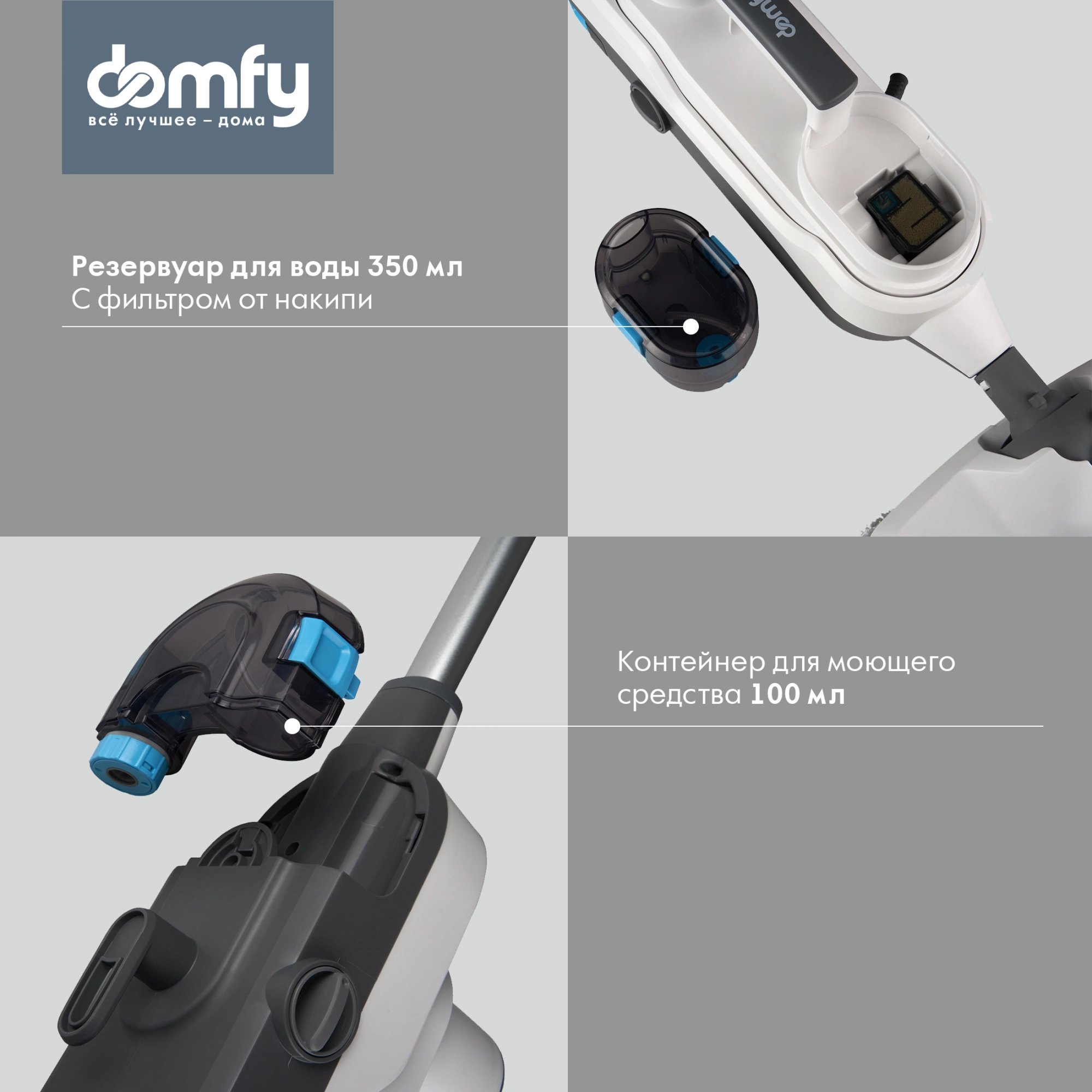 Раздельные съемные резервуары. Емкость для воды объемом 350 мл и контейнер для моющего средства на 100 мл можно наполнить, предварительно отсоединив от основного блока.