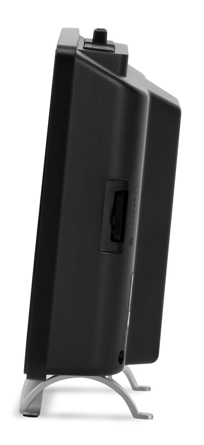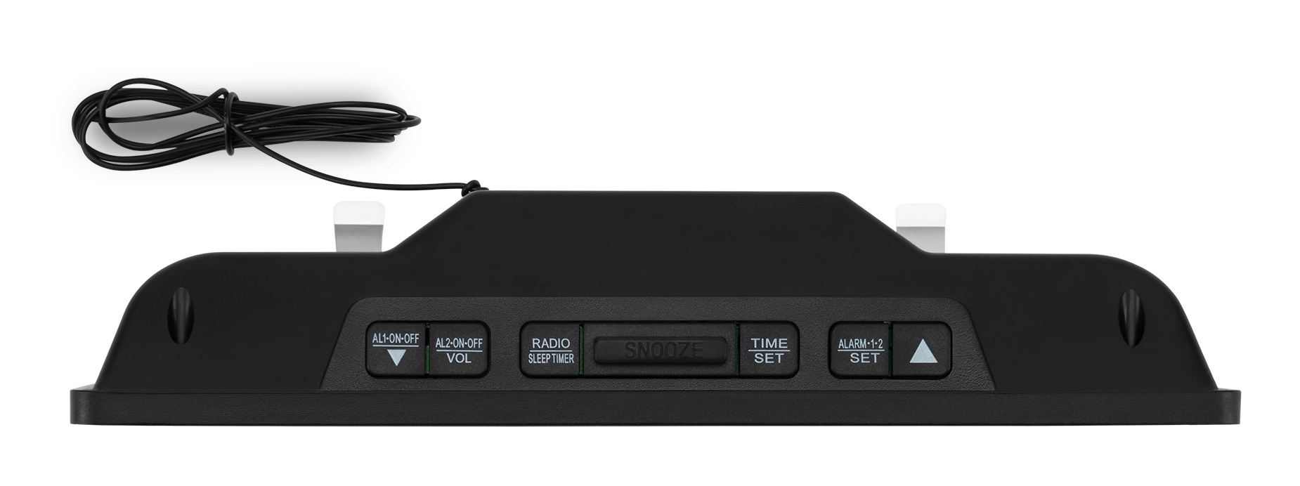 Также в приборе предусмотрен эргономичный будильник, сигнал которого можно выбрать самостоятельно. Первый вариант – традиционный звук, второй – радио. В данную модель интегрирован приёмник, который работает в широком диапазоне: от 87.5 до 108 МГц и ловит все доступные в регионе станции. Его можно активировать в качестве звука для пробуждения и задать два промежутка времени, когда он должен сработать. Отключается сигнал легко и не глядя (что особенно важно ранним утром) – по нажатию выступающей кнопки на верхней панели. Там же расположены и другие органы управления.