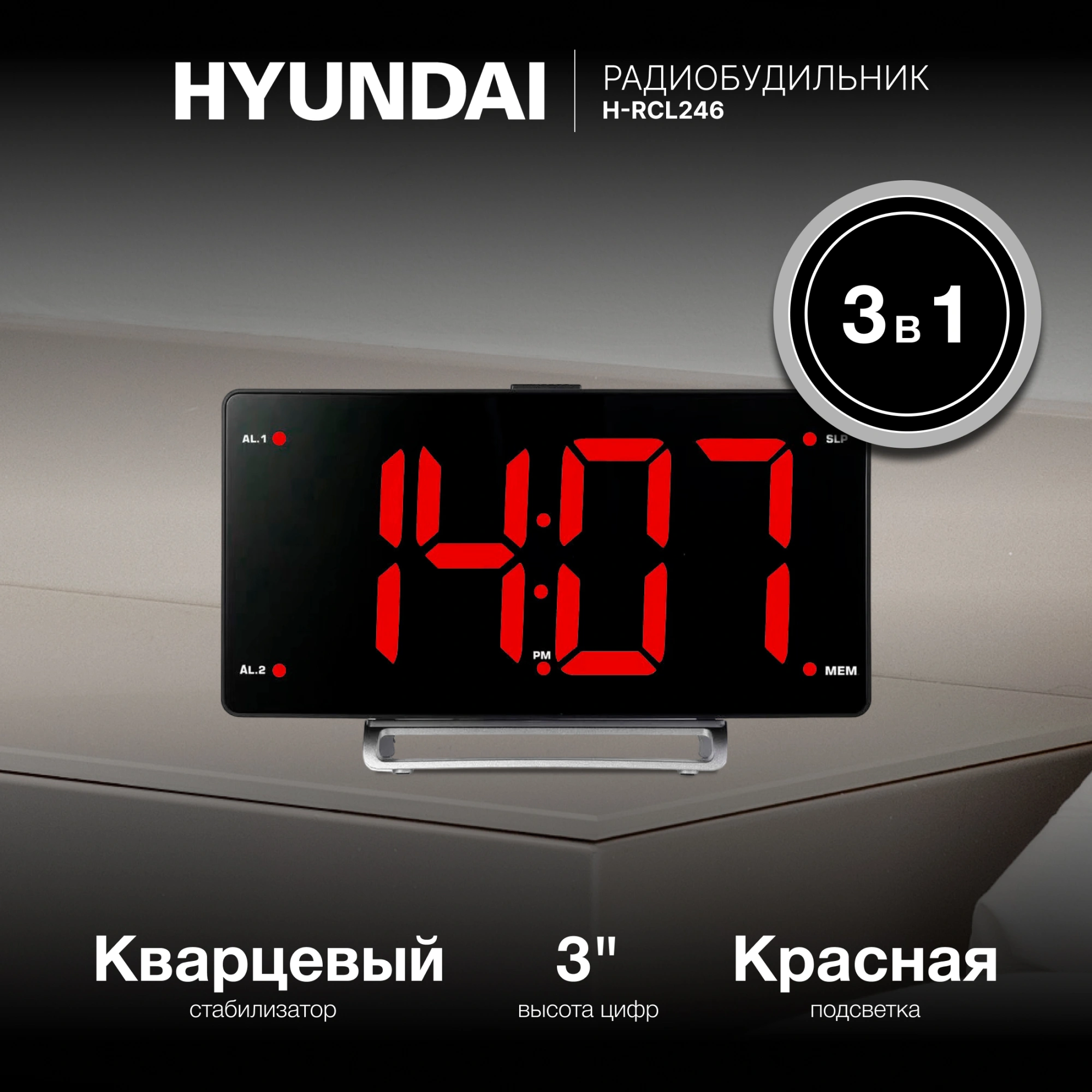 В Hyundai H-RCL246 встроен радиоприёмник с широким диапазоном частот (87,5 – 108 МГц), который ловит станции, доступные в регионе. Будильник данной модели по желанию заводится на два срабатывания, а в качестве сигнала для него можно использовать стандартный звук или радиоэфир.