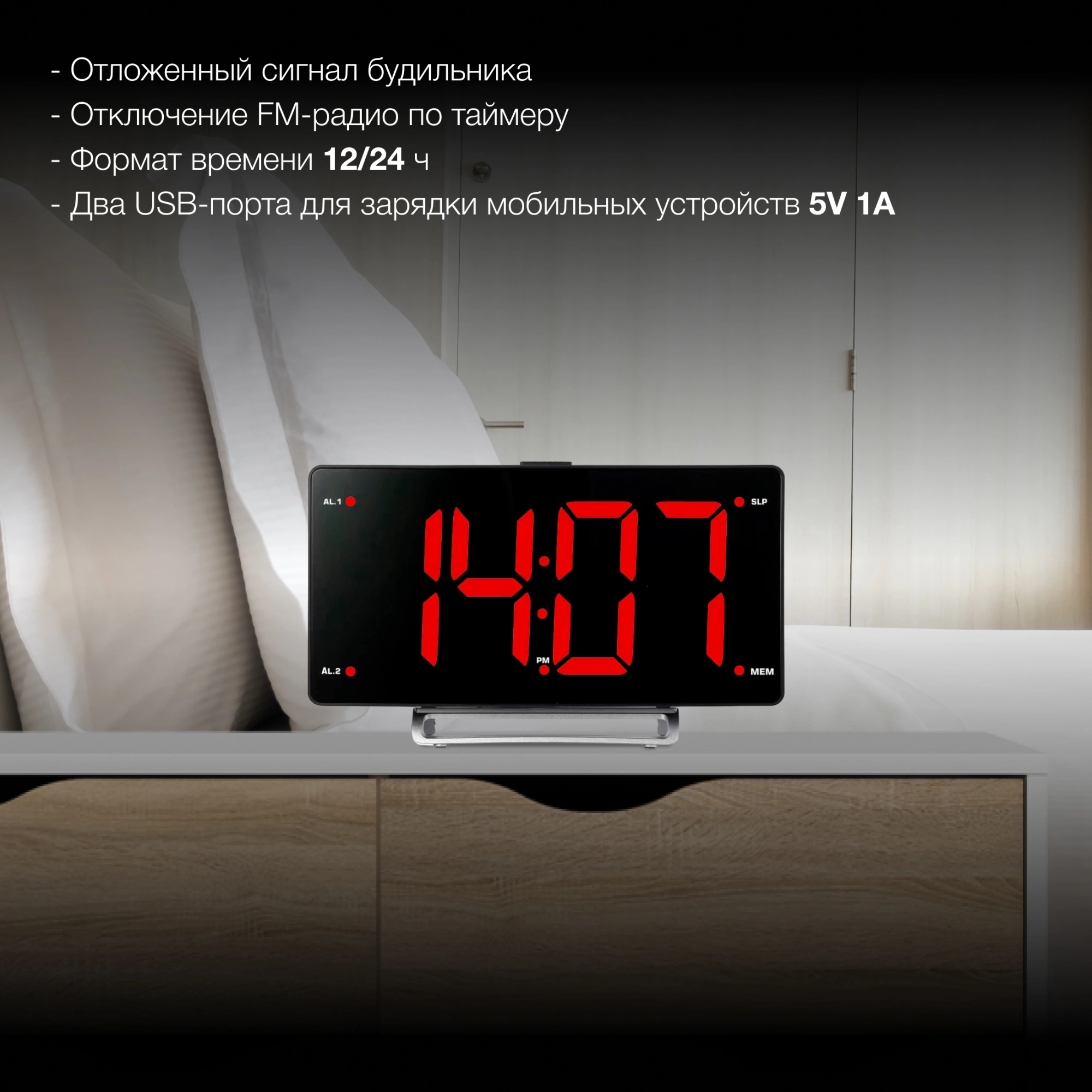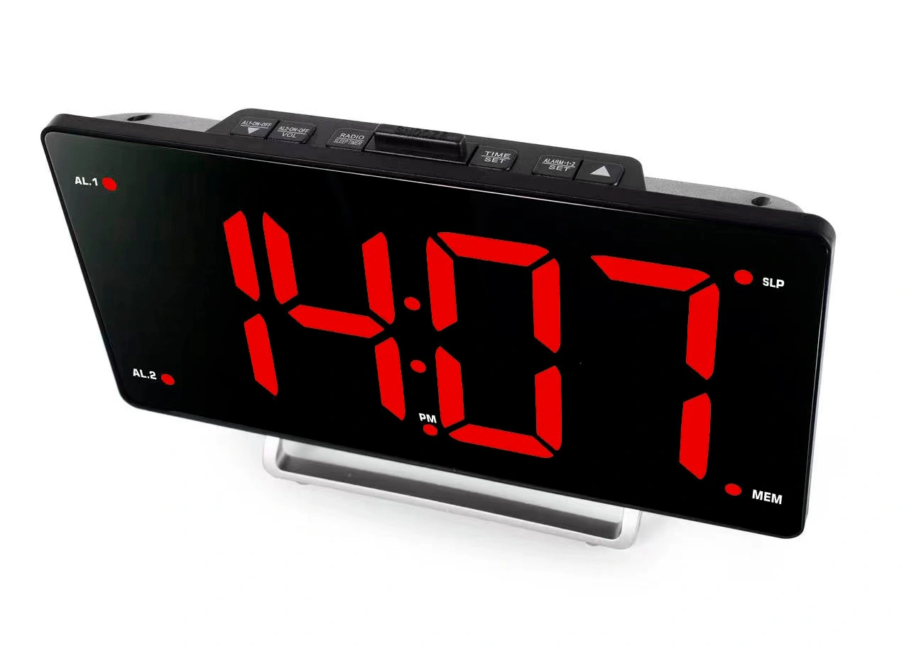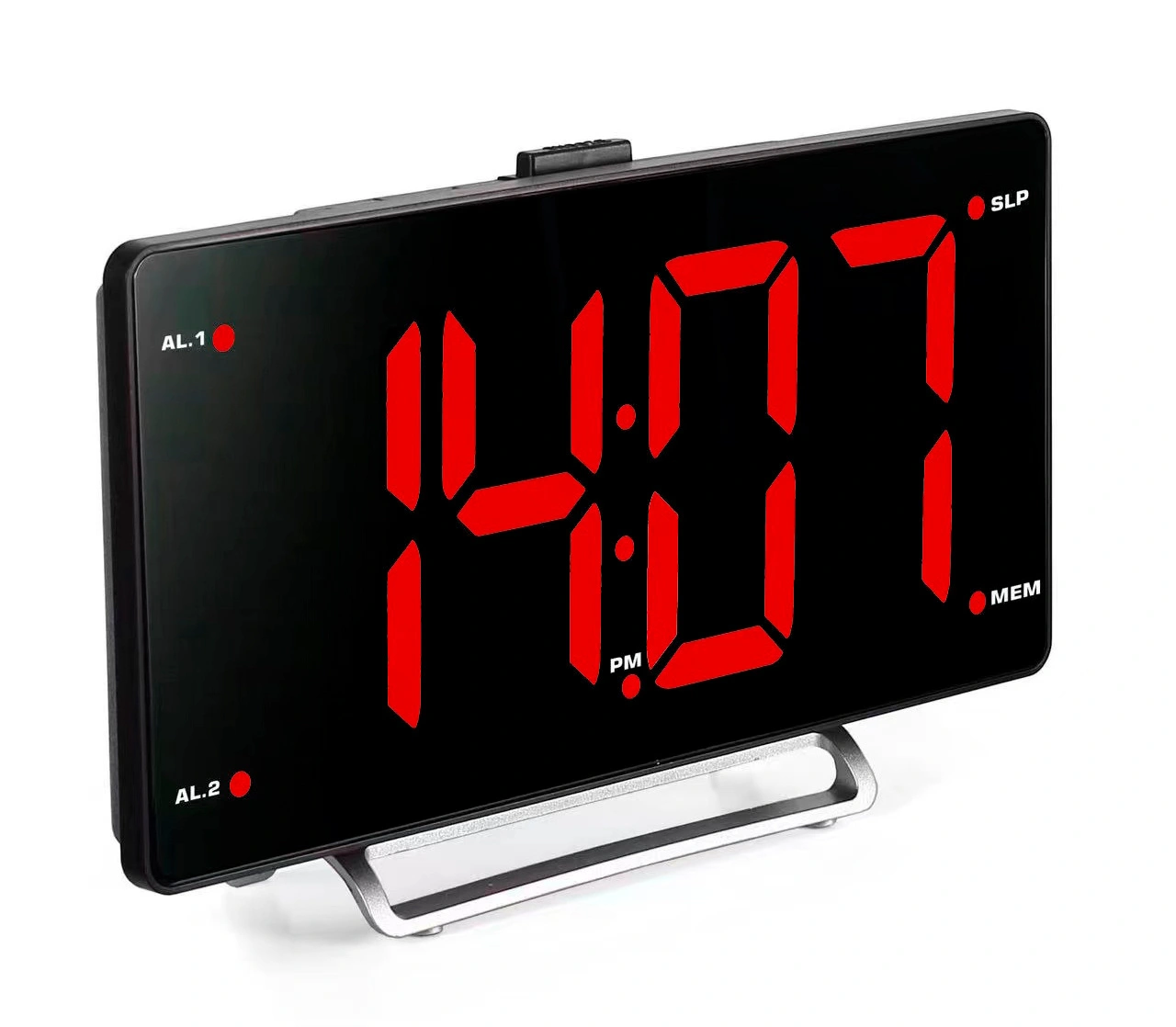 Корпус девайса обладает оптимальными габаритами – он тонкий и оснащён удобной подставкой, обеспечивающей устойчивое положение прибора на любой поверхности. Красный цвет, в который окрашены цифры и индикаторы включения дополнительных опций, хорошо видно в любом освещении или при полном его отсутствии.