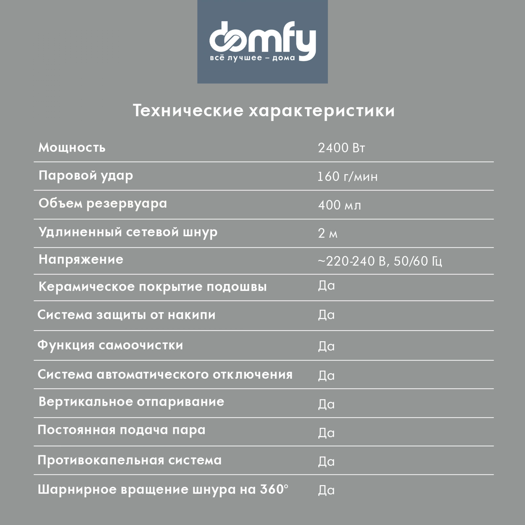 Паровой утюг Domfy DSC-EI502 позволит бережно разгладить одежду и ткани любого состава. Широкий выбор режимов, включая автоматическое и ручное отпаривание, и встроенный распылитель воды значительно облегчают и ускоряют этот процесс. А благодаря системе автоматического отключения можно больше не переживать о том, выключили ли вы утюг, уходя из дома.
