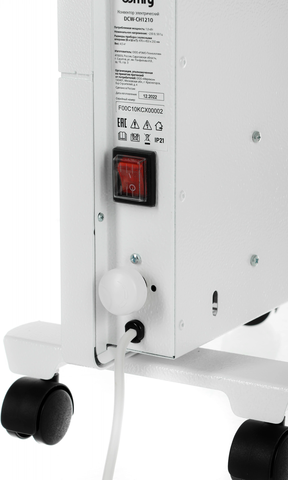 За счет небольшого размера (47 х 45 х 23 см), веса (всего 4,5 кг) и колесиков конвектор без труда можно перемещать по квартире. Он не повредит напольное покрытие. Обогреватель легко установить: не надо подводить воду, осуществлять трудоемкий монтаж – нужна только электрическая розетка.
