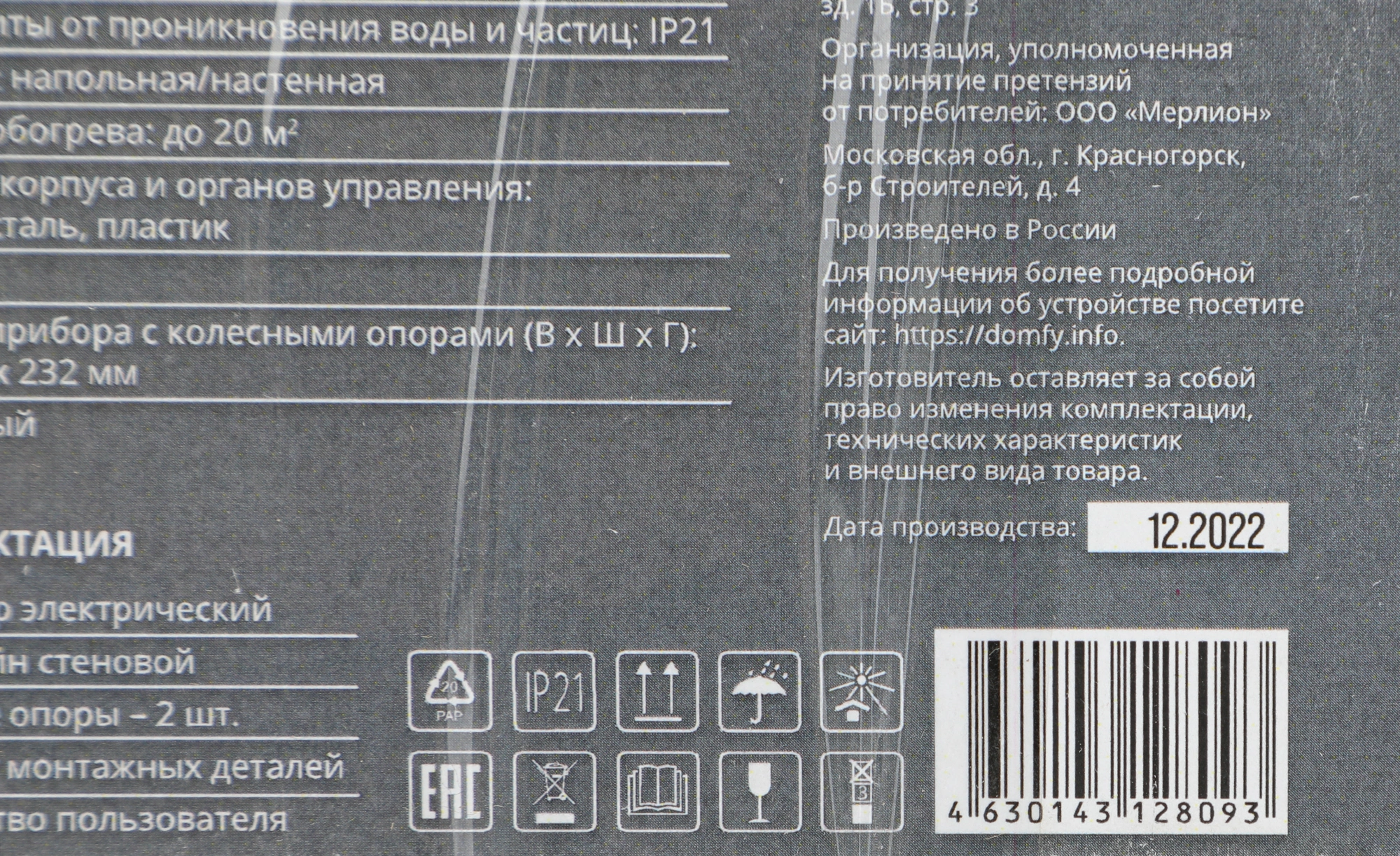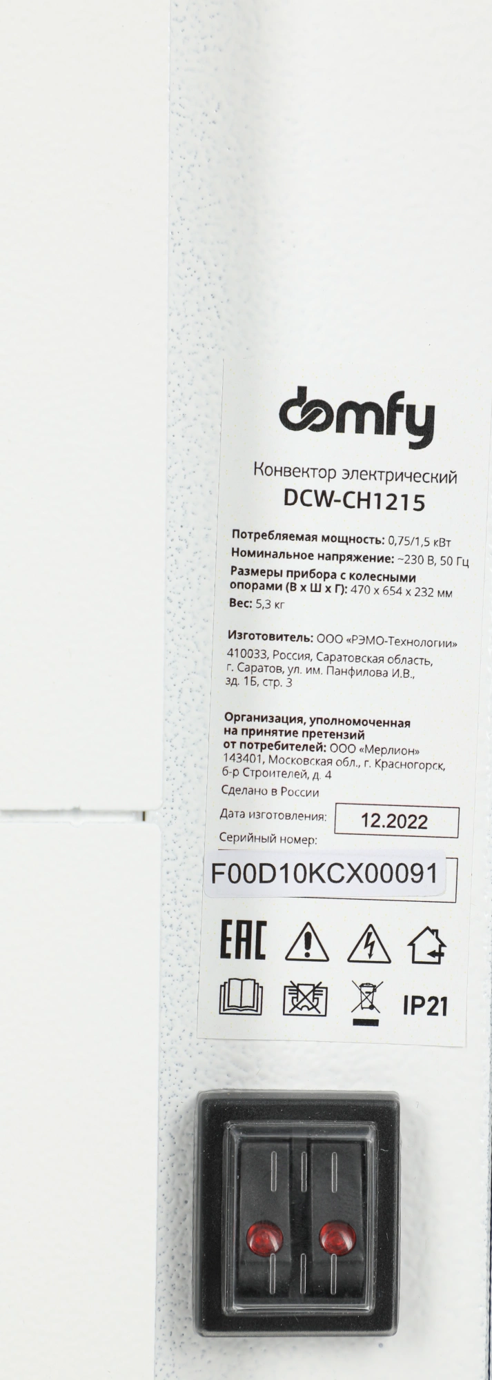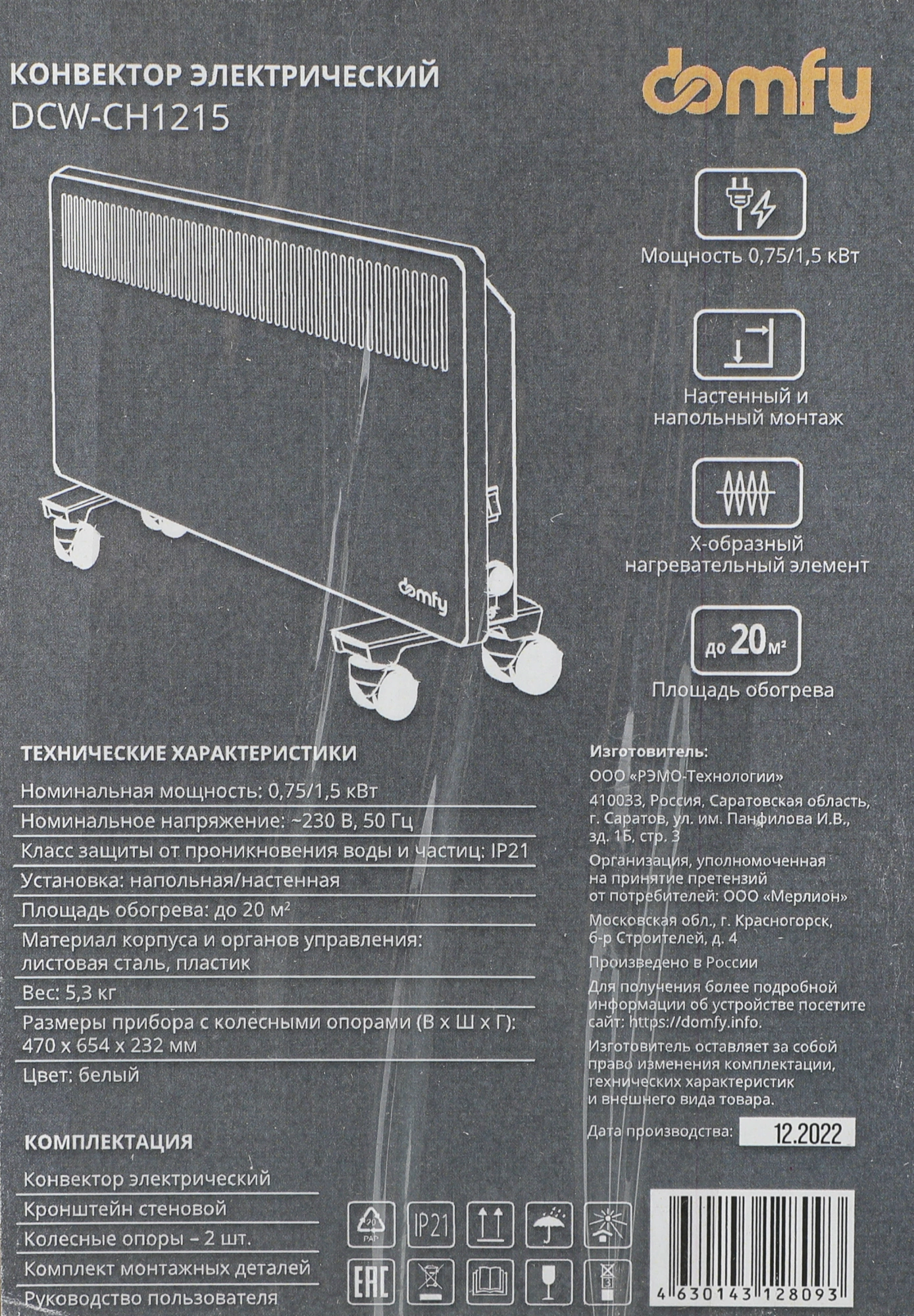 Практичный электрический конвектор Domfy DCW-CH1215 поможет обогреть дачный дом, квартиру или офисный кабинет площадью до 20 кв. м. Внушительная мощность 1500 Вт, а также немалые размеры (47 х 65 х 23 см) и вес (5,3 кг) теплового прибора способствуют эффективному и равномерному прогреву помещения в любую погоду.