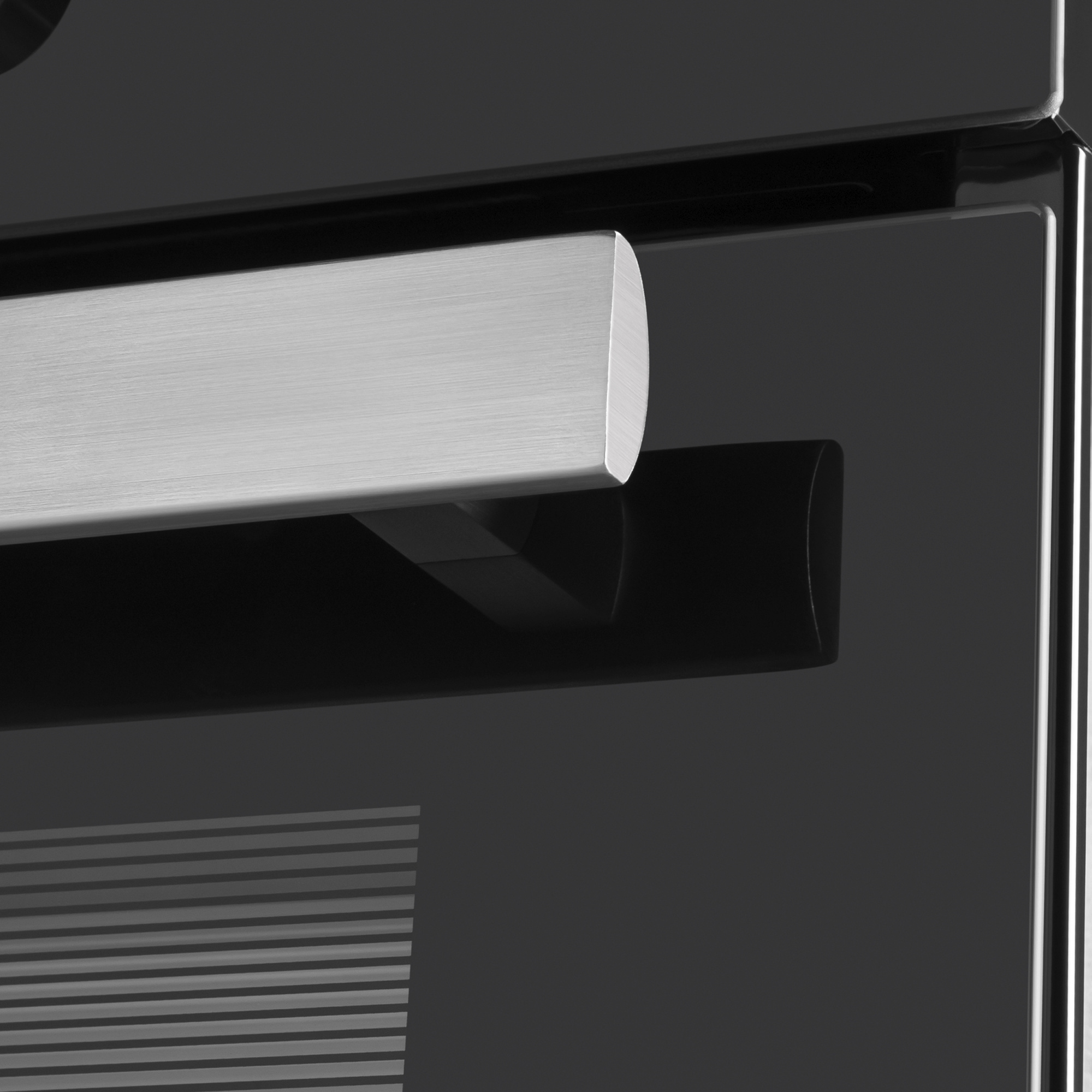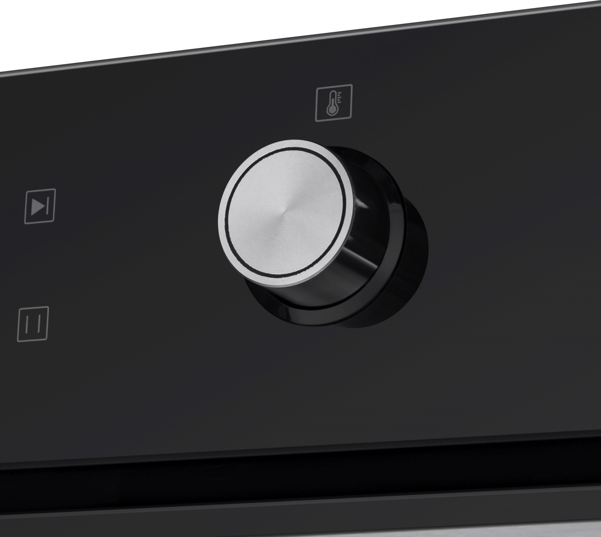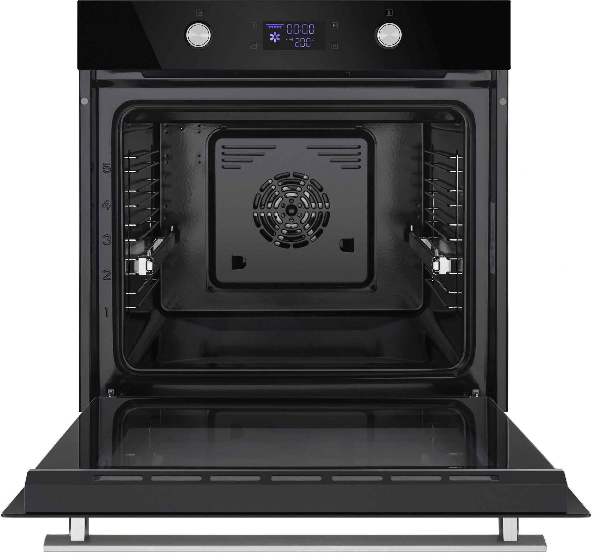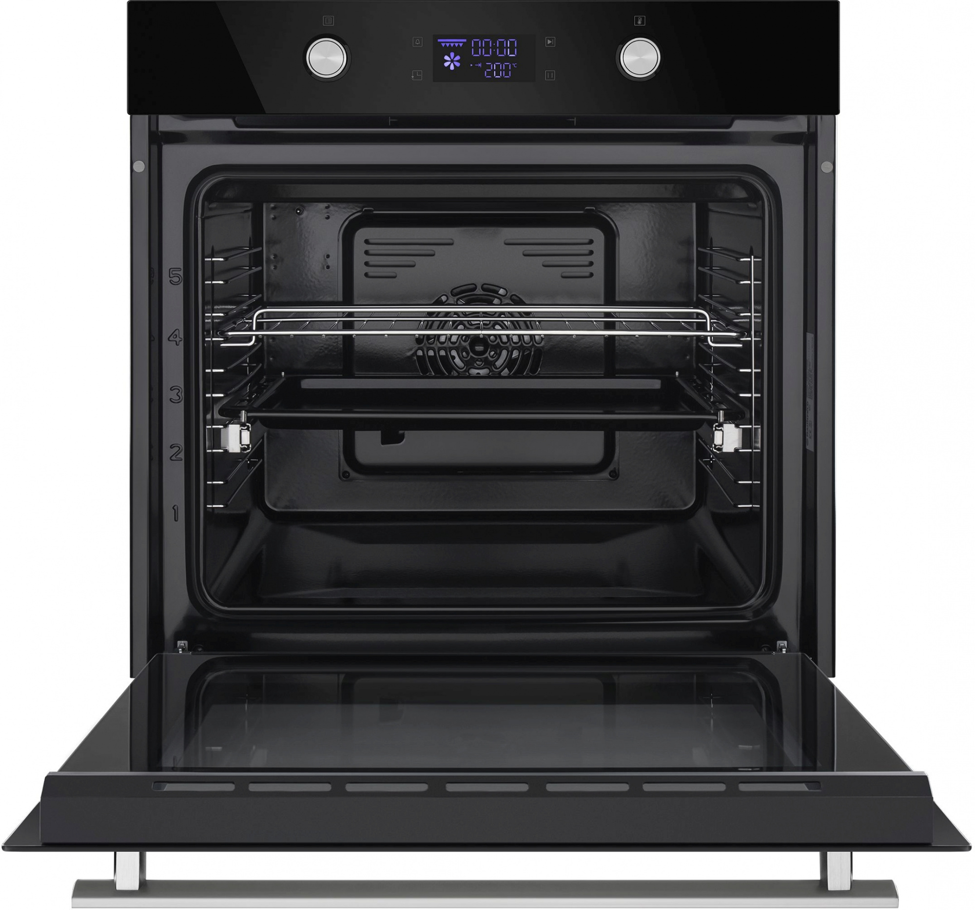 вентилятор охлаждения, дисплей, полностью стеклянная внутренняя поверхность дверцы духовки, телескопические направляющие, утапливаемые переключатели