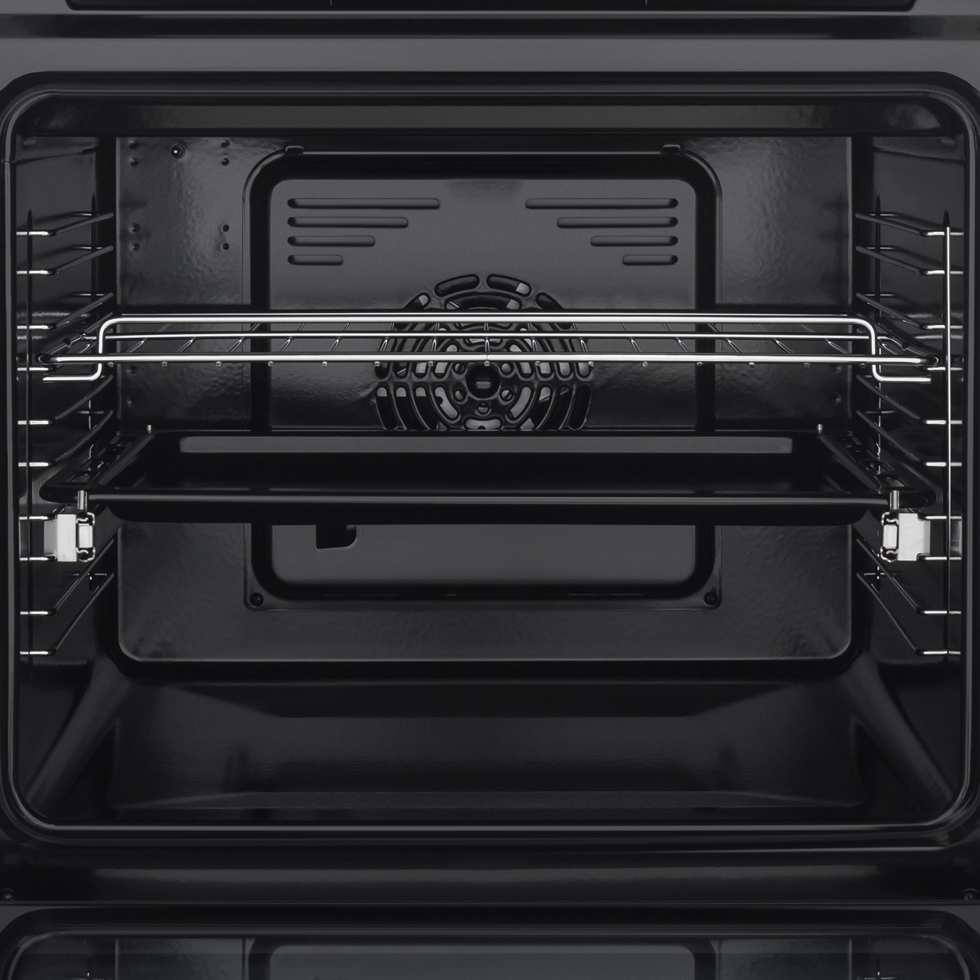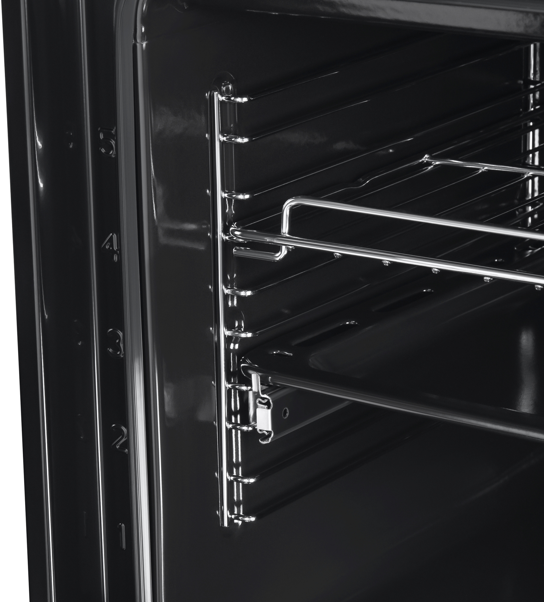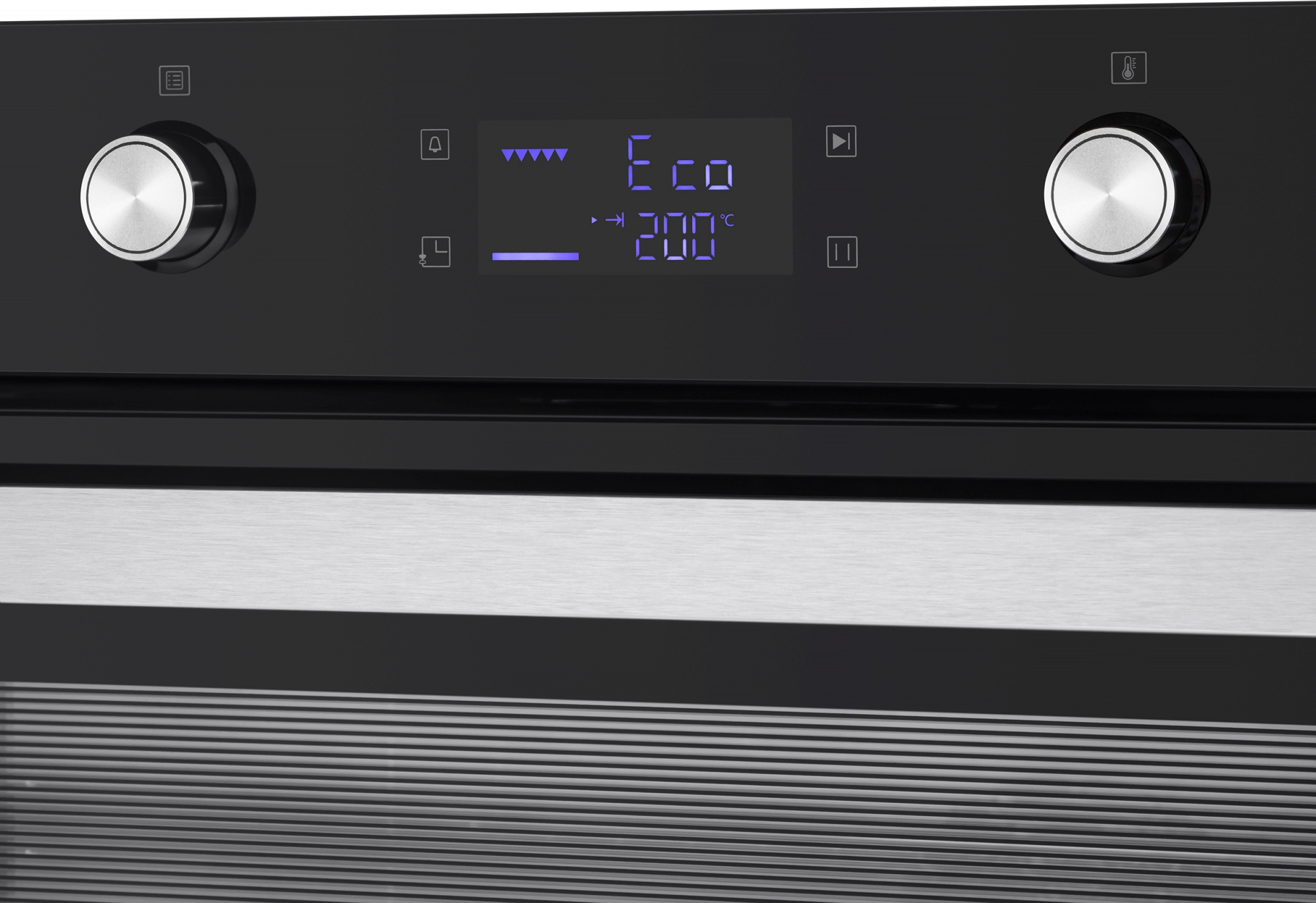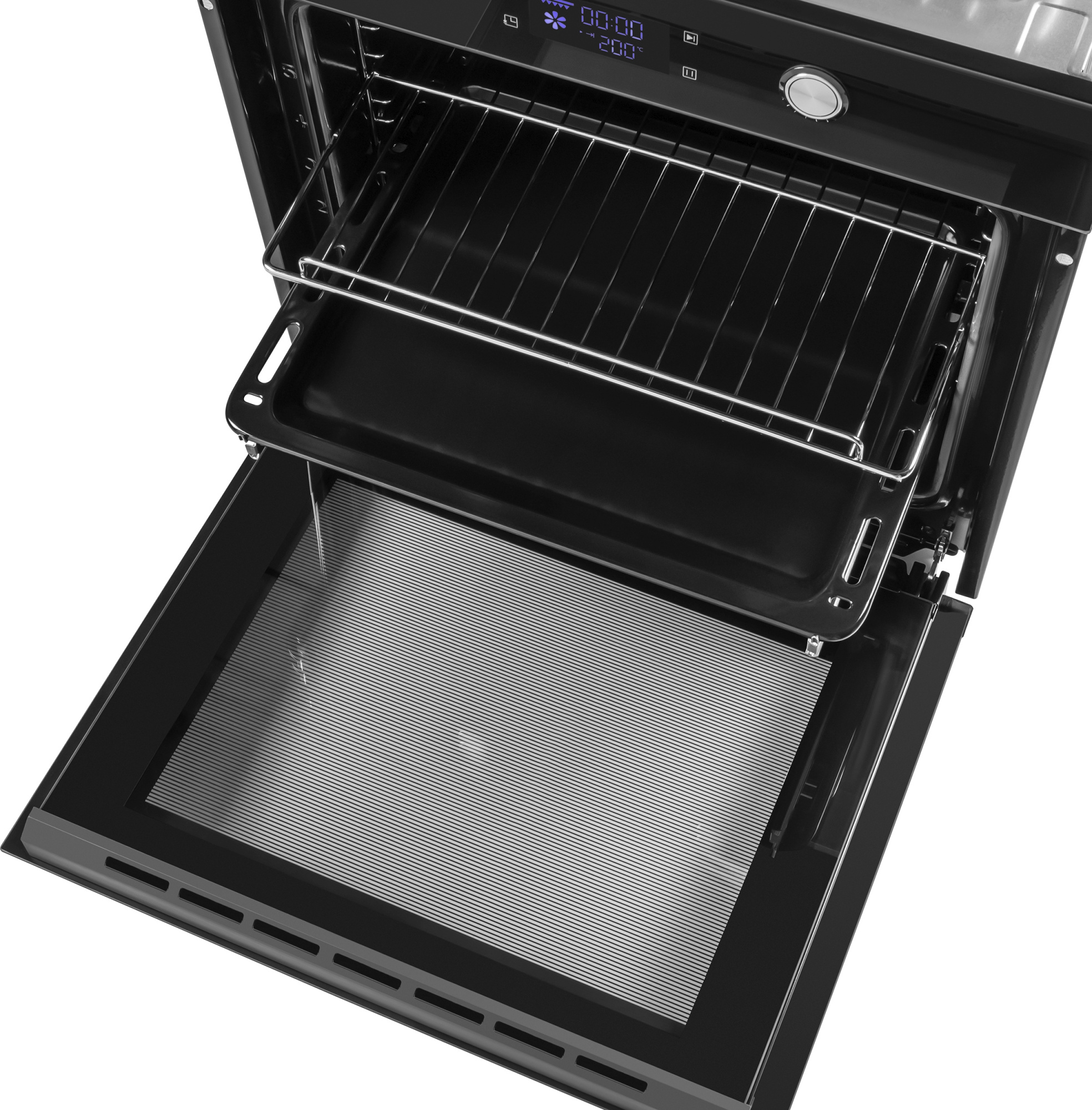 вентилятор охлаждения, дисплей, полностью стеклянная внутренняя поверхность дверцы духовки, телескопические направляющие, утапливаемые переключатели