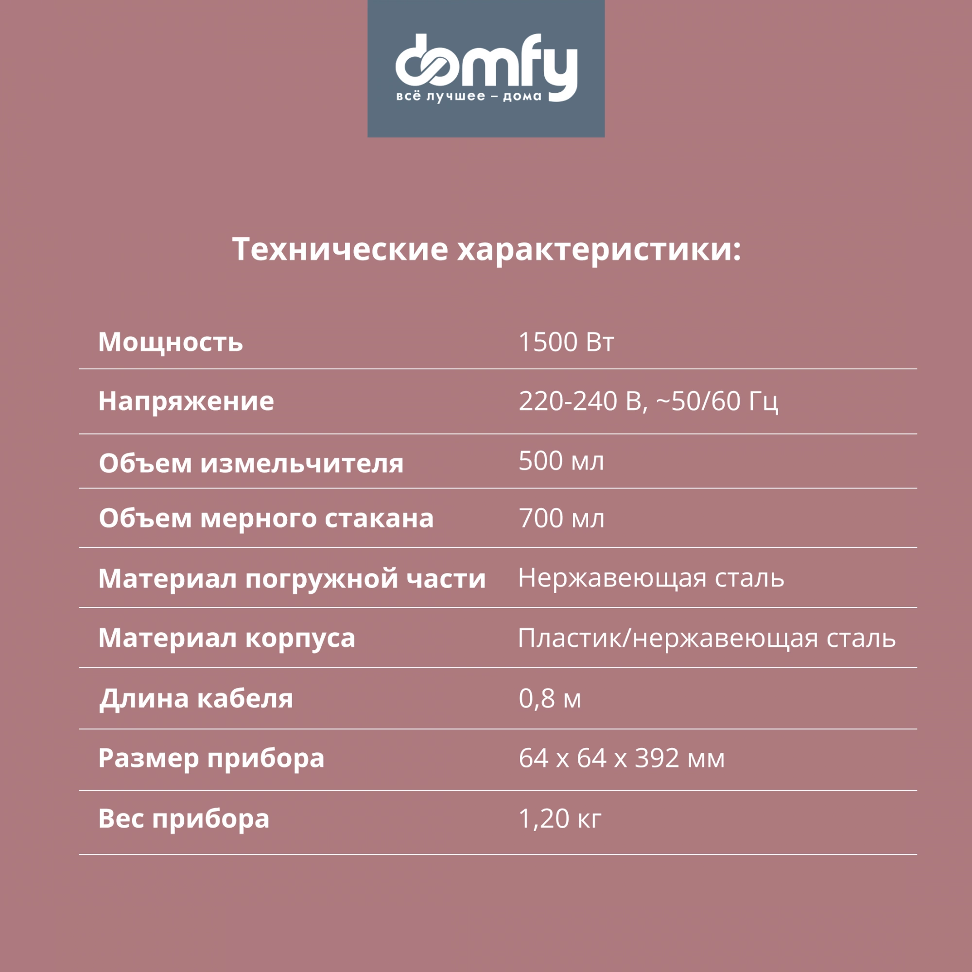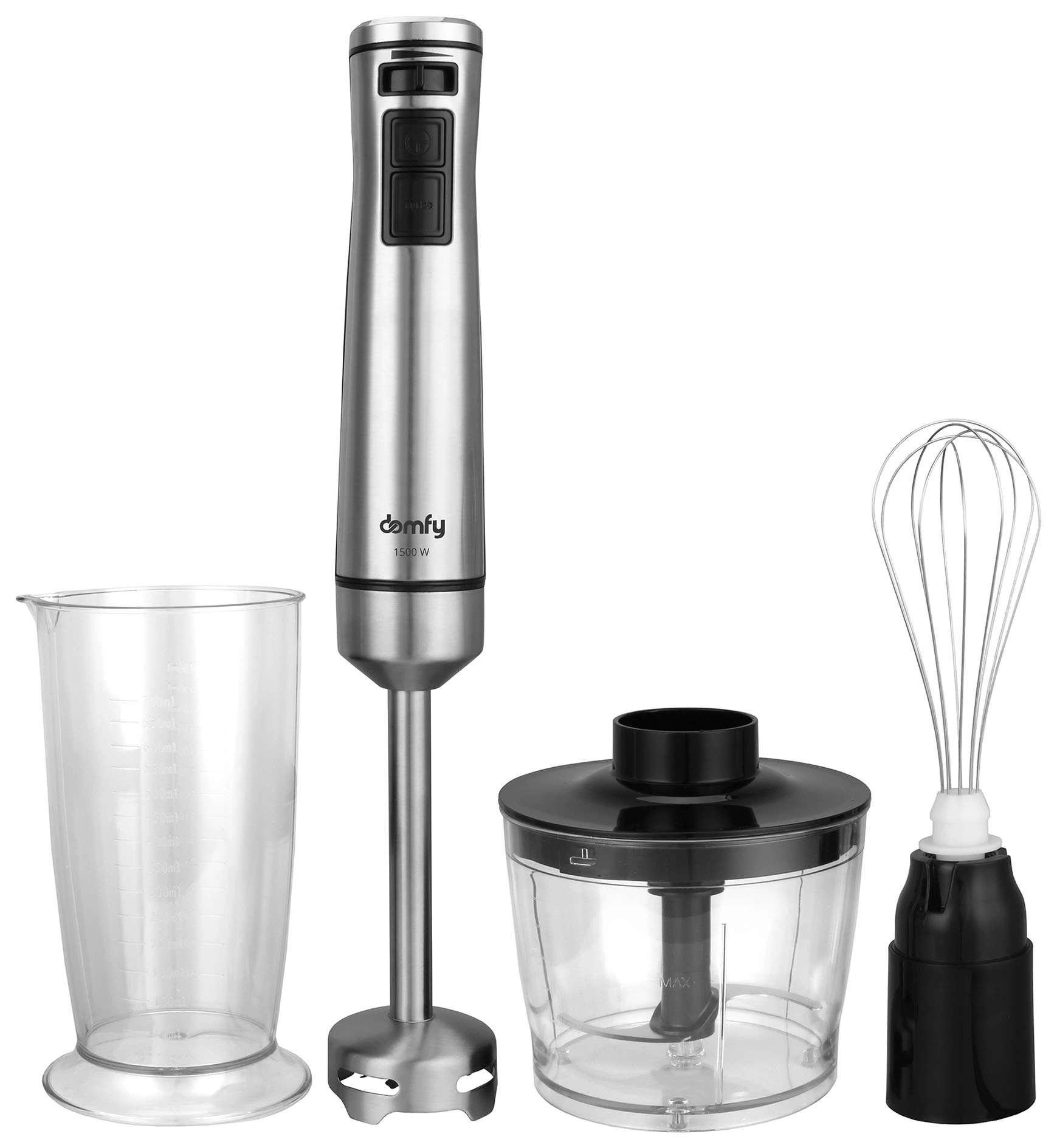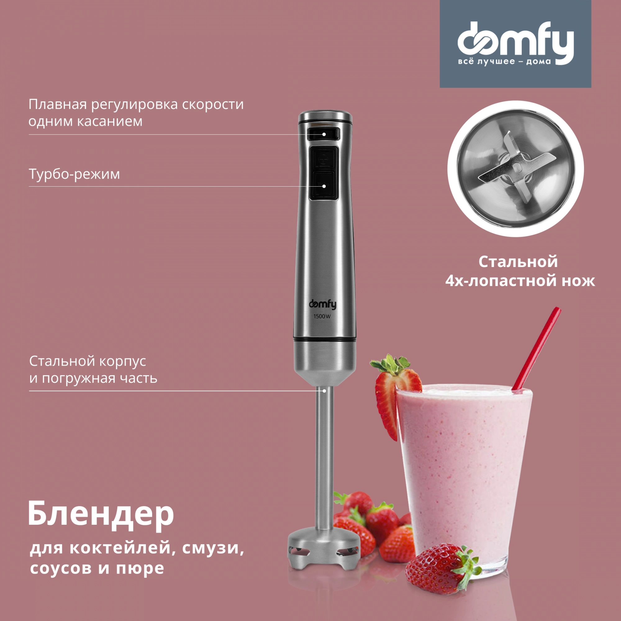 Погружной блендер DOMFY DSM-HB401 мощностью 1500 Вт с функциями измельчителя и миксера позволит создавать кулинарные шедевры на домашней кухне. Его можно использовать не только для смешивания многокомпонентных напитков, но и для приготовления десертов, а также для нарезки продуктов для салатов и других более сложных блюд.