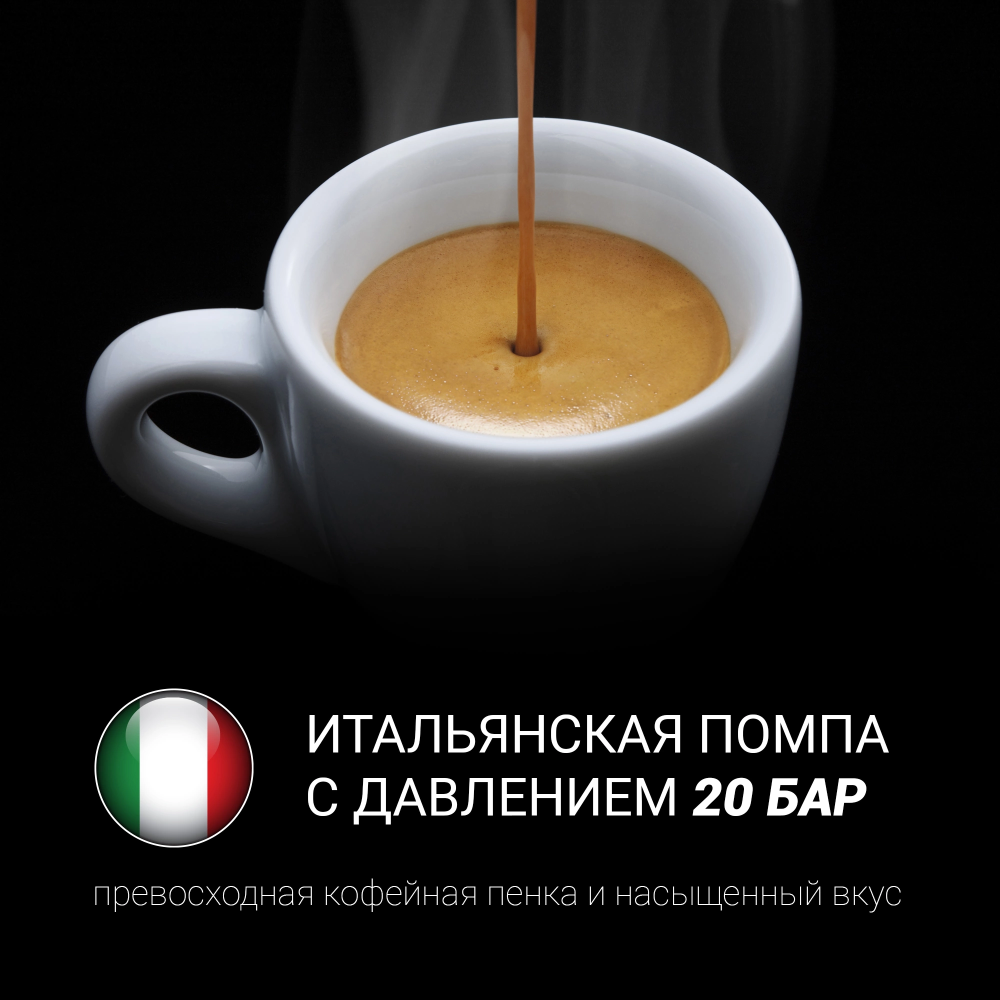 Благодаря помпе итальянского производства с давлением 20 бар, кофемашина варит насыщенный эспрессо с превосходной кофейной пенкой. Сенсорное управление позволит приготовить любимый напиток всего одним касанием. В кофемашине предустановлено 3 программы: эспрессо, лунго и молочная пена.