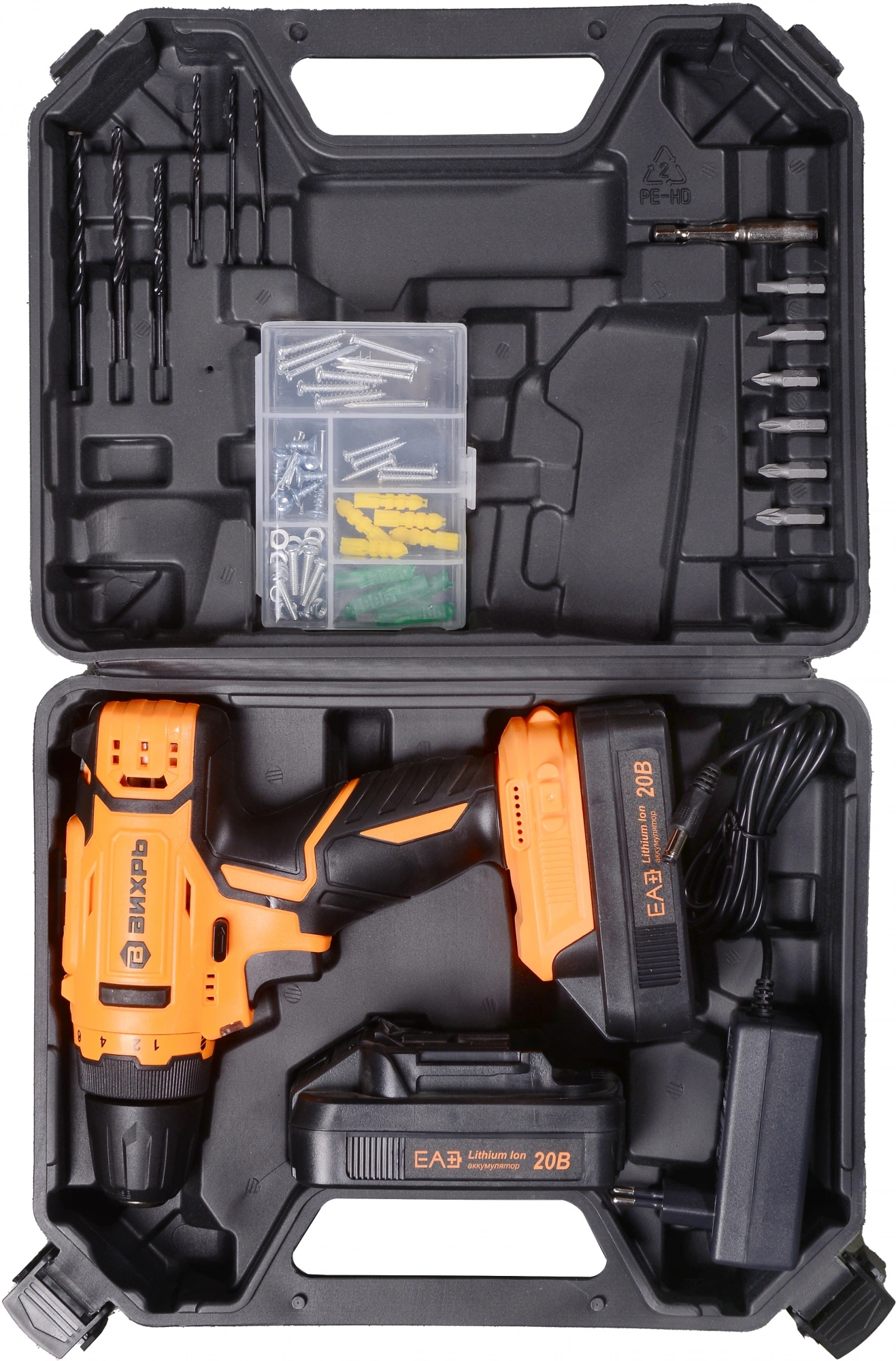 Аккумуляторная дрель-шуруповерт с аккумулятором, дополнительный аккумулятор, бита (в зависимости от комплектации) - 6 шт., адаптер-удлинитель для бит, адаптер питания и паспорт, упаковка.
