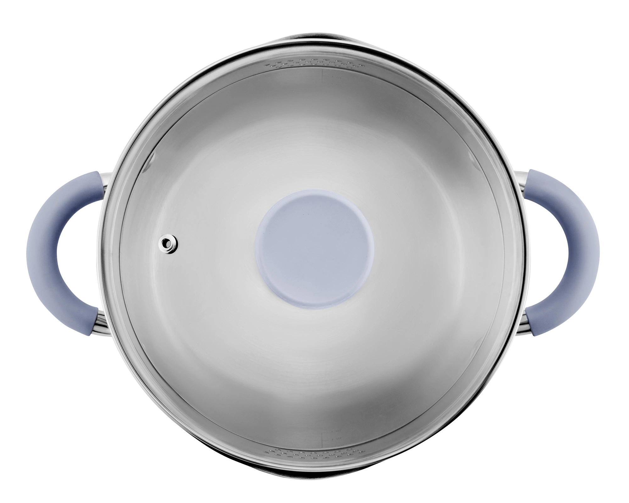 Стеклянная крышка-дуршлаг. Широкий металлический обод с отверстиями позволяет слить воду прямо из кастрюли, делая особенно удобным приготовление макаронных изделий и варку овощей. Через стеклянную поверхность крышки можно контролировать процесс готовки, а специальное отверстие в ней обеспечивает выход пара.