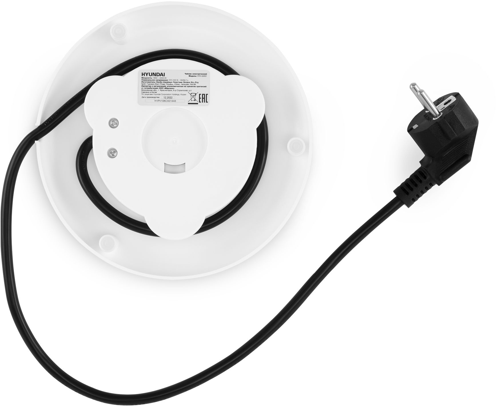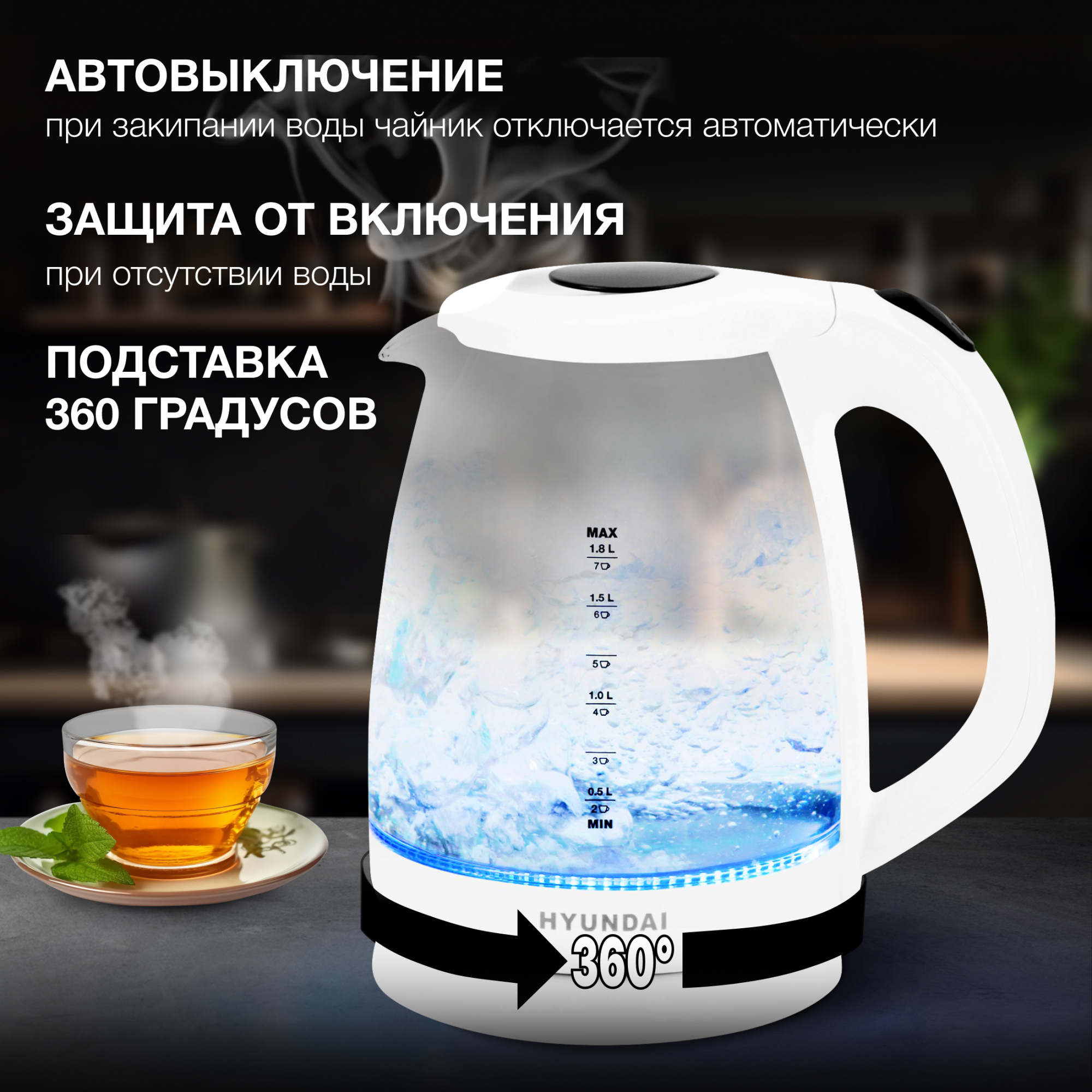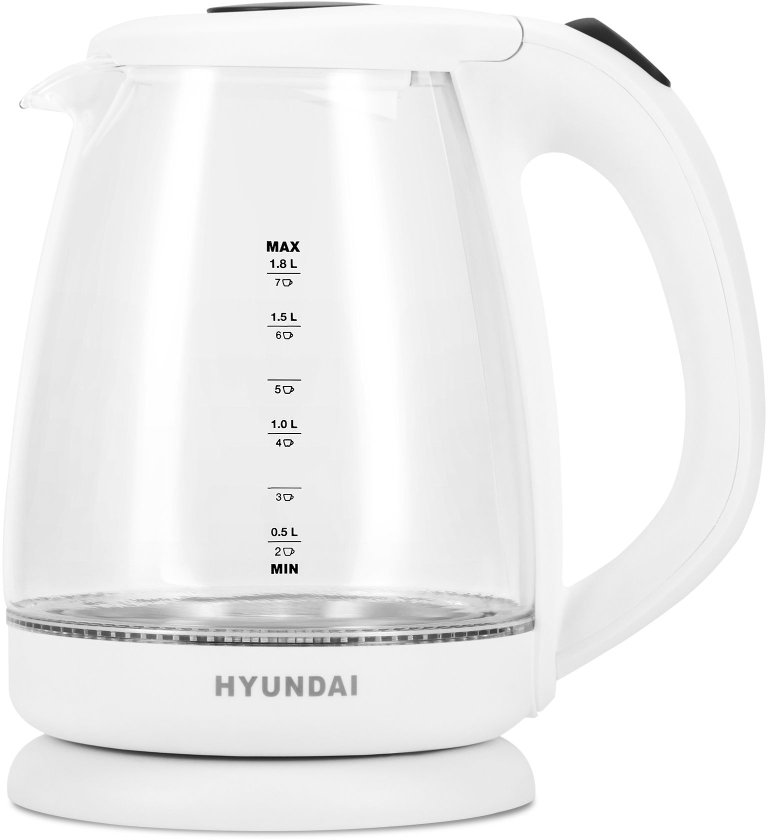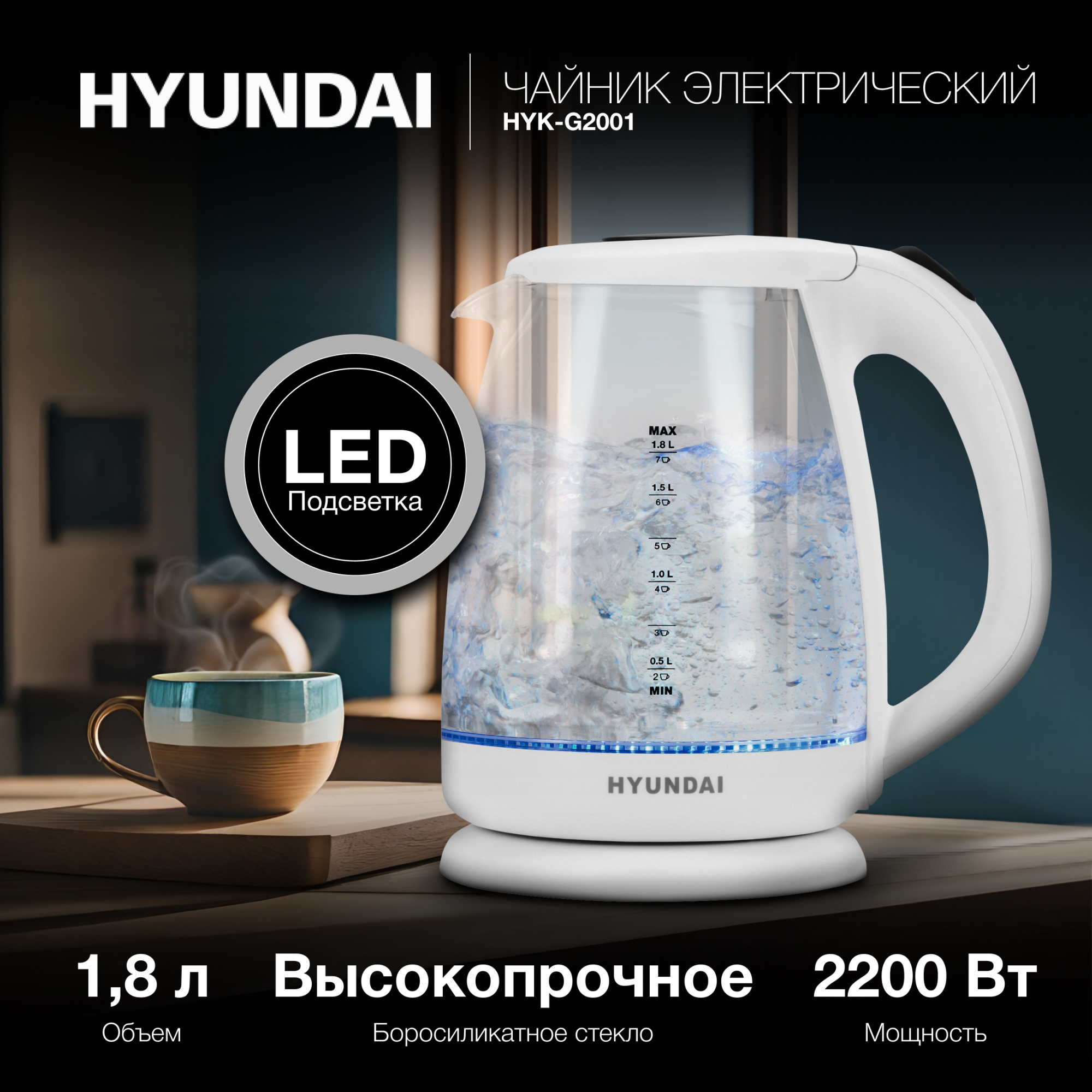 Боковая поверхность Hyundai HYK-G2001 размечена по объёму налитой воды и примерному количеству чашек, исходя из него. Также она выполняет и дизайнерскую функцию: яркая синяя подсветка внизу дна чайника во время кипячения переливается в воде и оригинально выглядит.