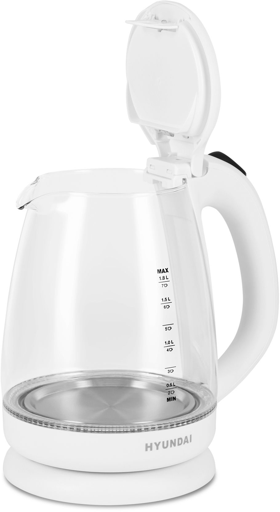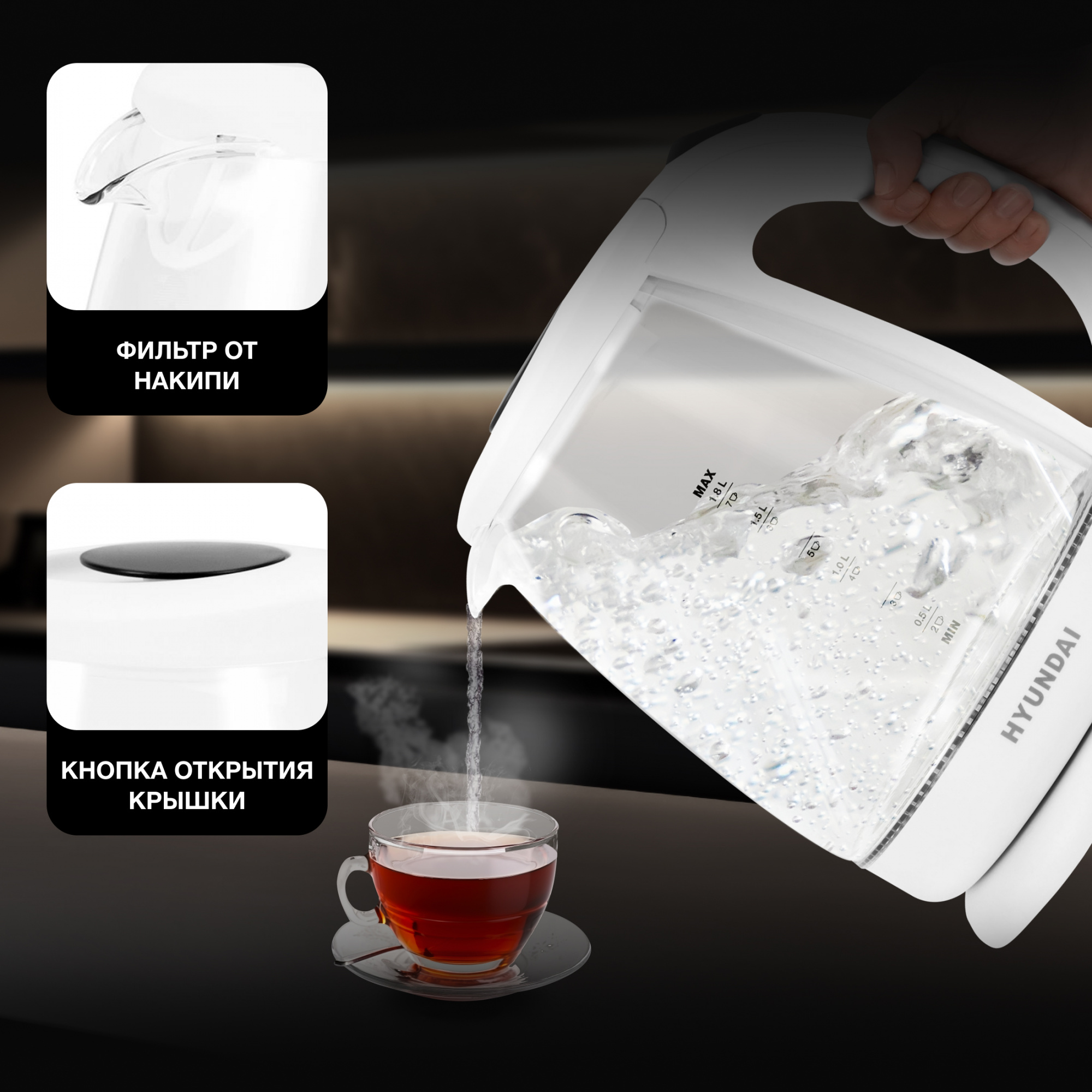 Крышка Hyundai HYK-G2001 открывается по нажатию кнопки и щелчку, а клавиша активации прибора находится на его рукоятке. Носик чайника имеет мелкую сеточку, не пропускающую накипь.