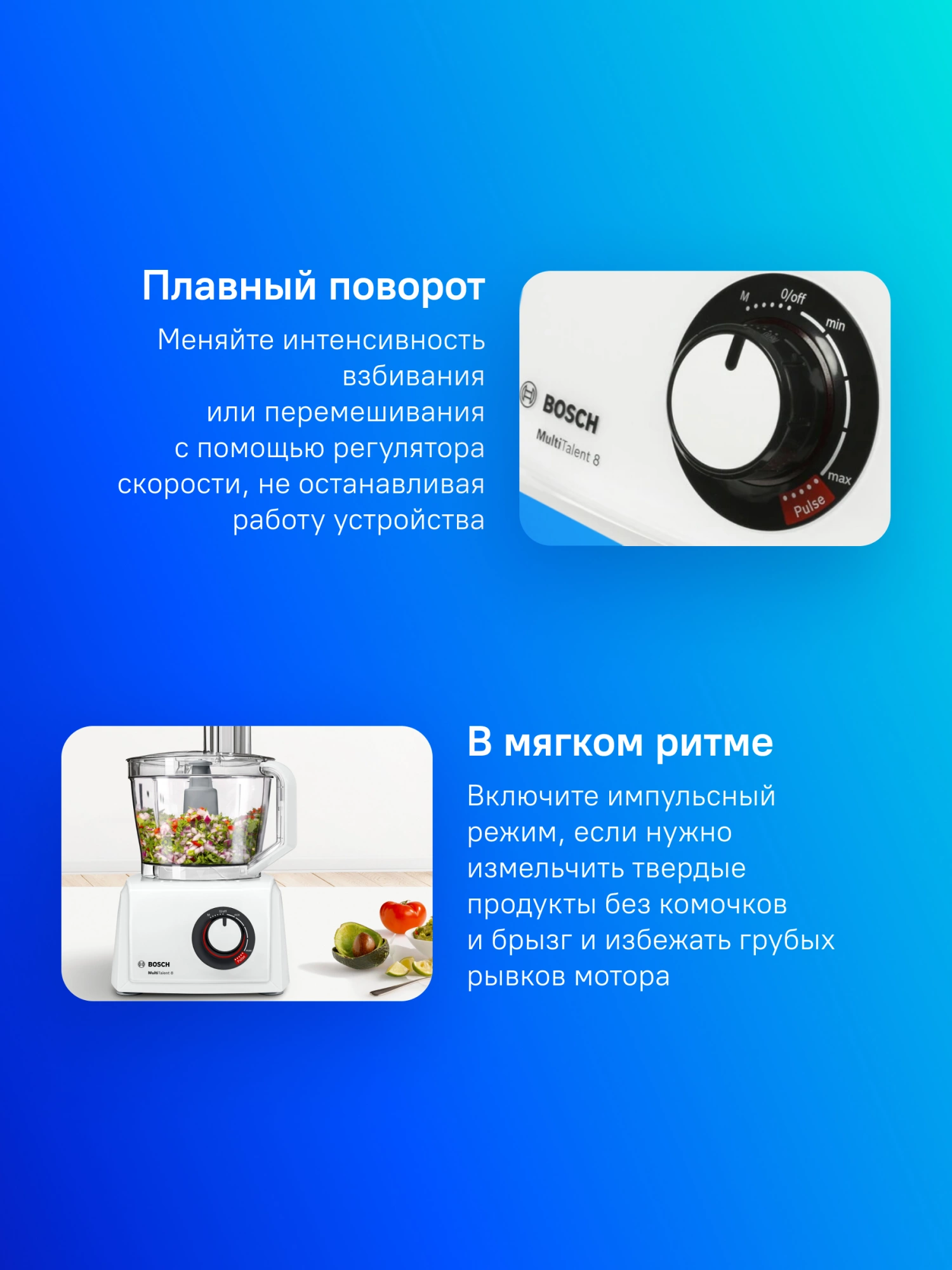 Двухсторонний диск - шинковка (крупная/мелкая), двухсторонний диск - терка (крупная/мелкая). Держатель дисков. Насадка для замеса теста (пластик). Венчик из нерж. стали для взбивания крема, яичных белков и легкого теста. Пресс для приготовления сока из цитрусовых.