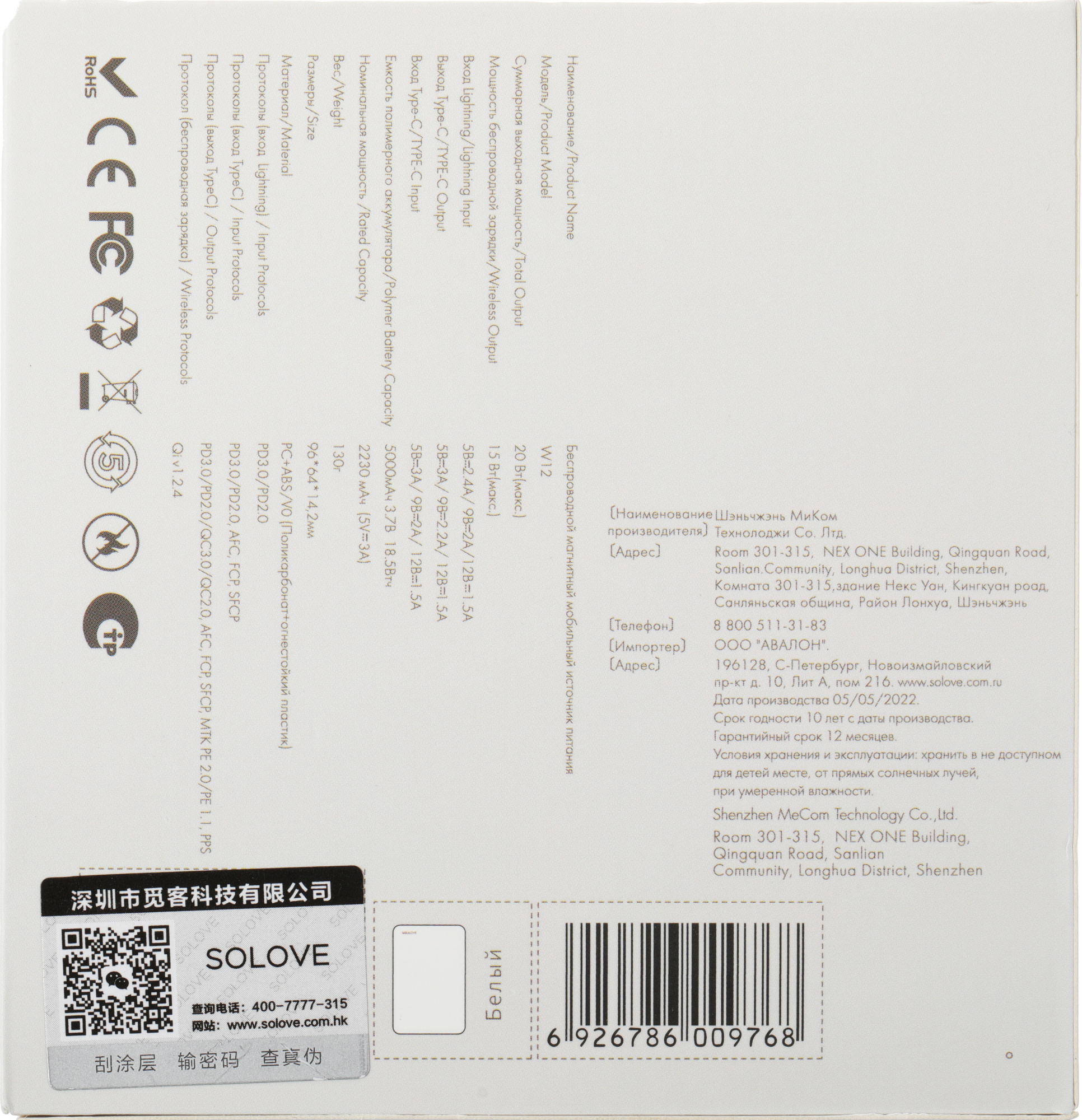 5000mAh QC3.0/PD3.0 20W 3A USB-C беспров.зар. бел...