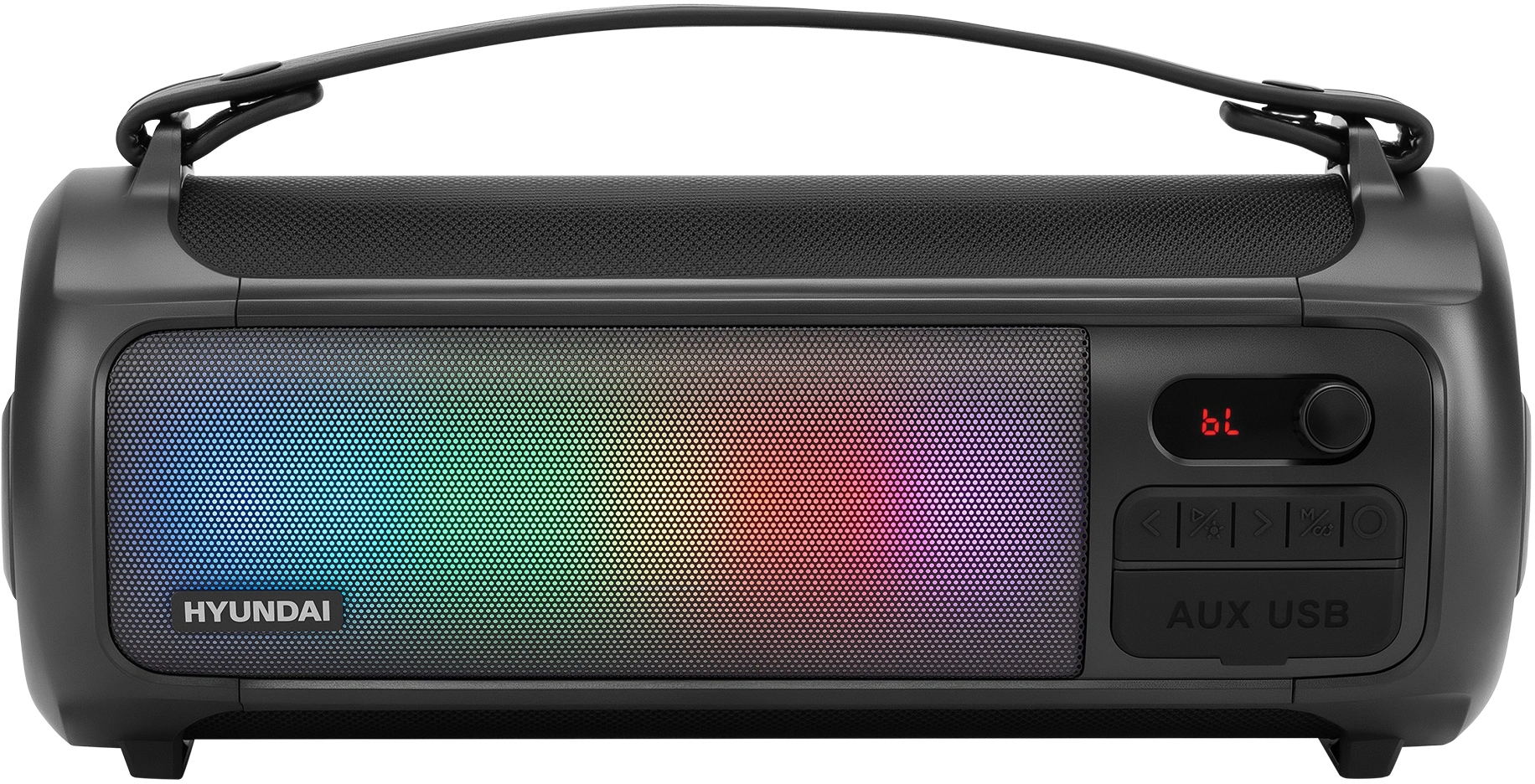 Приятным дополнением к функционалу портативной акустики Hyundai H-PS1025 является наличие в ней красочной и насыщенной RGB-подсветки, имитирующей ритмичную работу светомузыки. На верхней части корпуса выполнена удобная ручка, за которую можно брать колонку.
