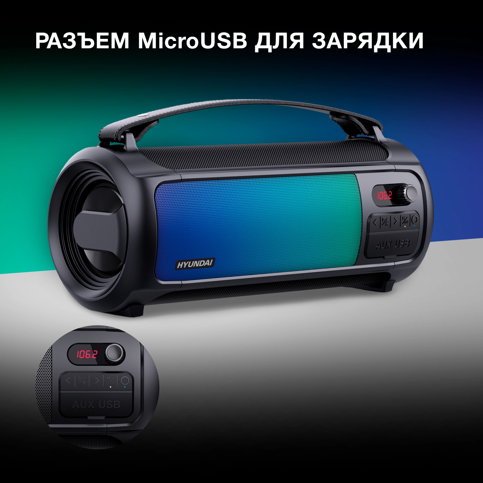 Кроме того, колонка оснащена литий-ионным аккумулятором с ёмкостью 3000 мАч и временем полной зарядки в районе всего 3 часов. При этом время непрерывного воспроизведения у прибора достигает 10 часов. Питаться Hyundai H-PS1025 может как от встроенной батареи, так и напрямую от сети.