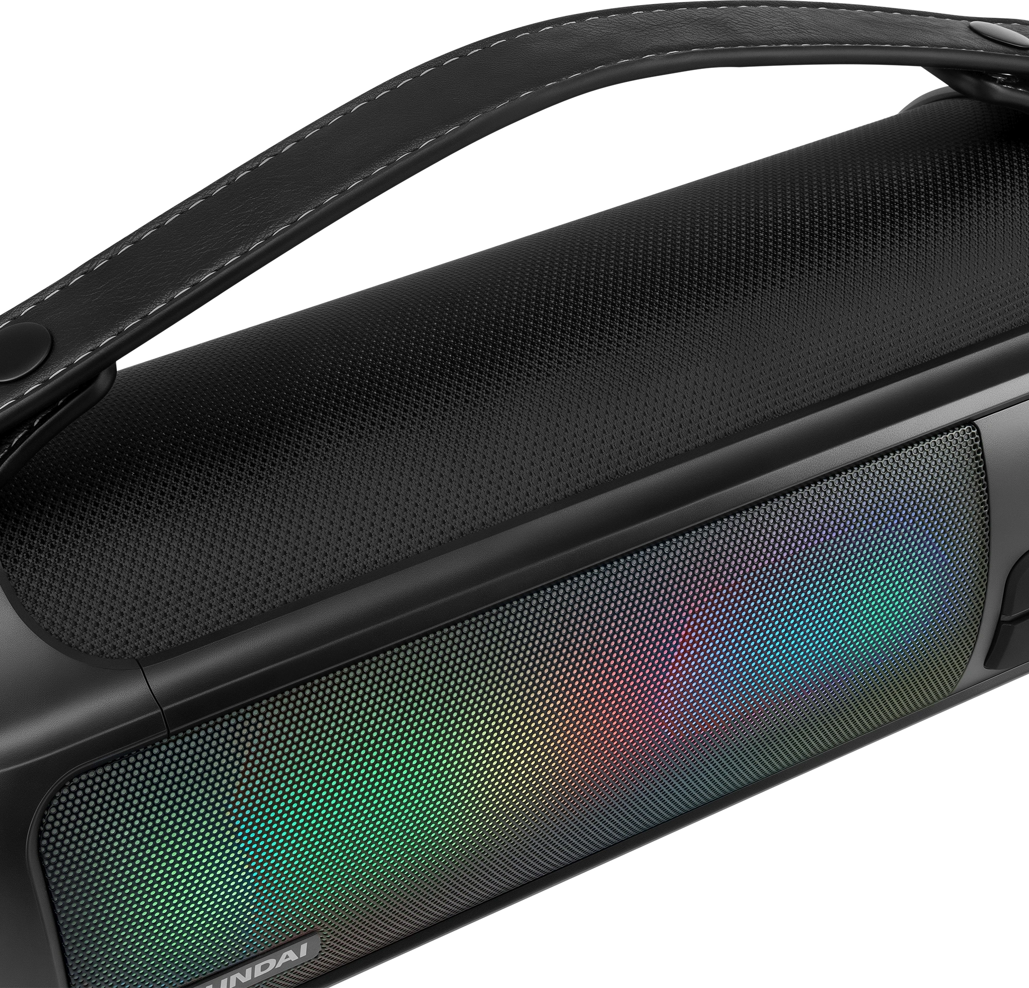 Hyundai H-PS1025 – это эргономичная портативная колонка с удобной петлёй для переноски, стереодинамиками мощностью 40 Вт и широкой полосой воспроизводимых частот от 20 Гц до 20000 КГц.