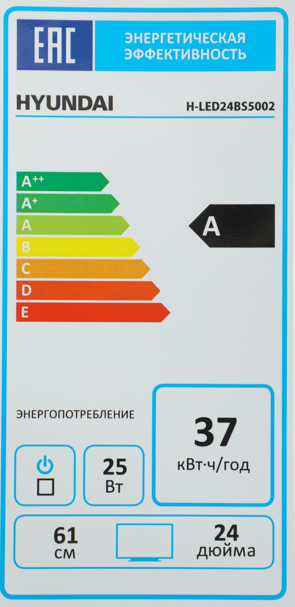 Тонкий LED-телевизор Hyundai H-LED24BS5002 имеет диагональ 24 дюйма и показывает в формате HD Ready.