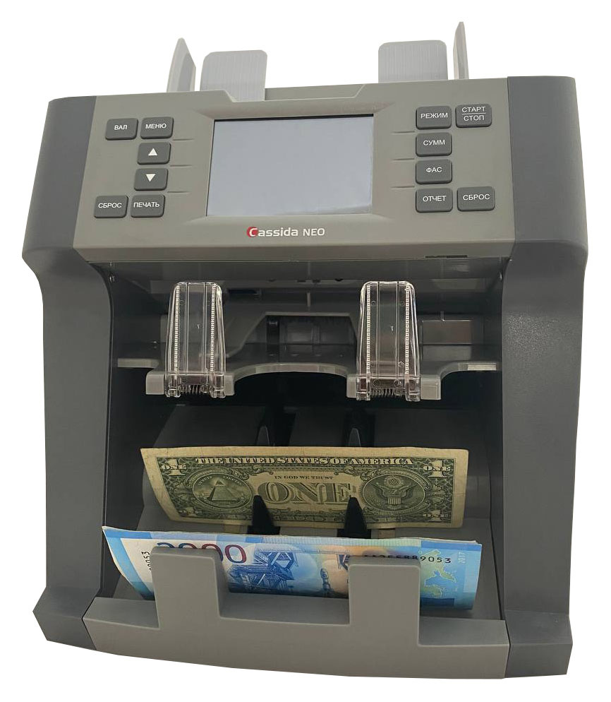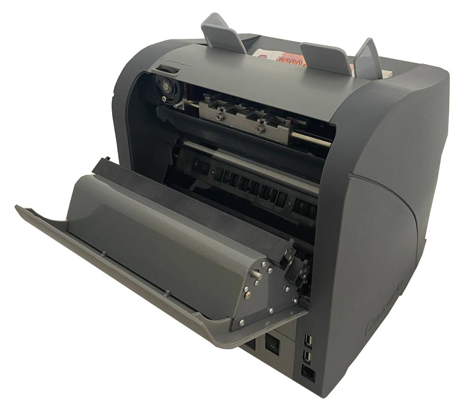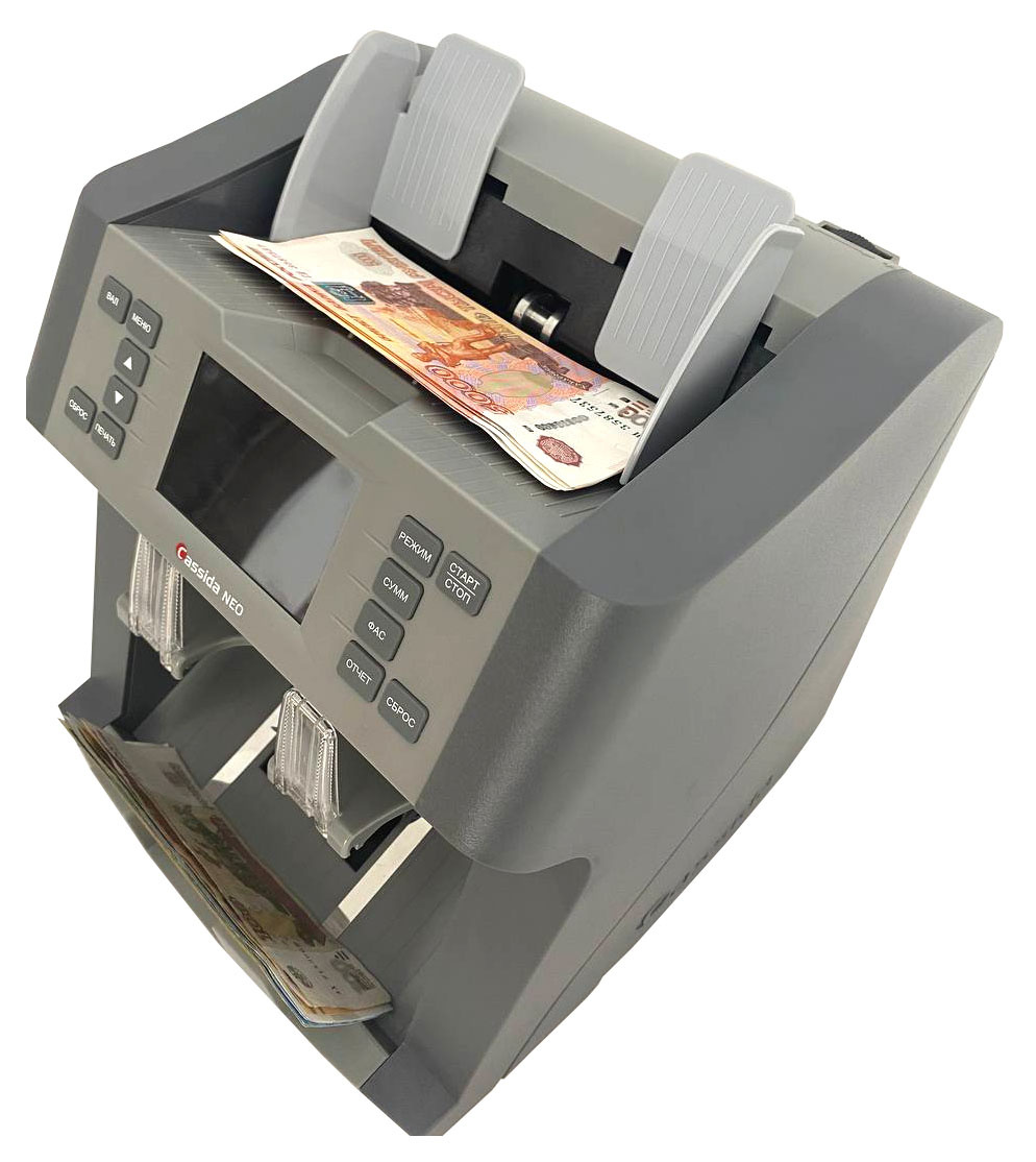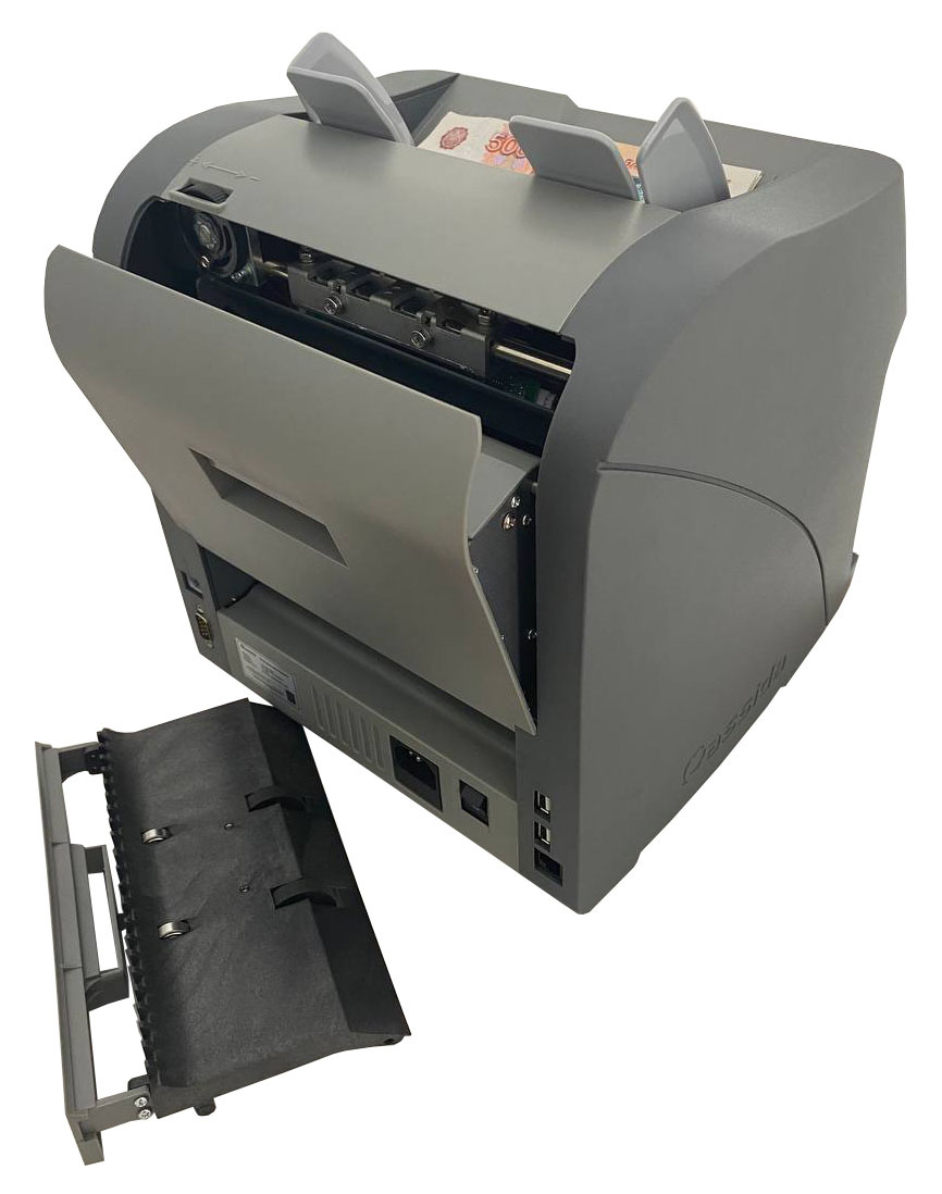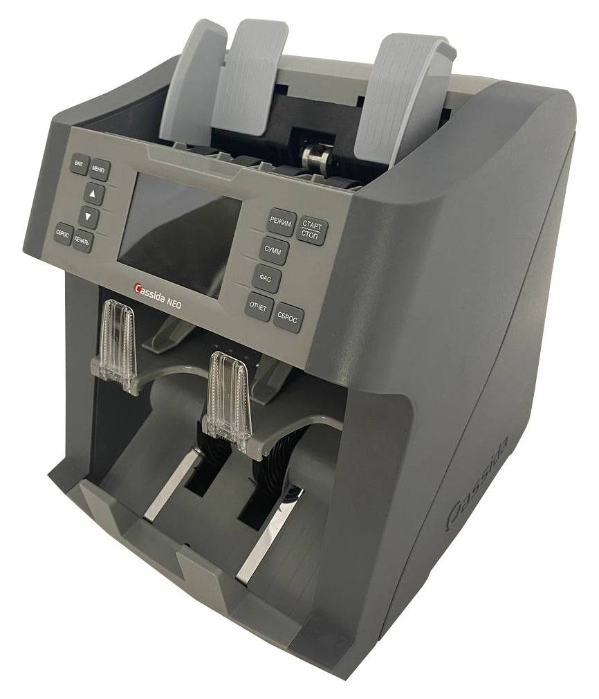 Двухкарманный сортировщик банкнот с двумя CIS сканерами, двумя ультрафиолетовыми датчиками, пятью магнитными датчиками индивидуального типа, для обработки средних и больших объемов наличности в операционных кассах, офисах, кассах магазинов и т.д. Дисплей цветной TFT с тачскрином.