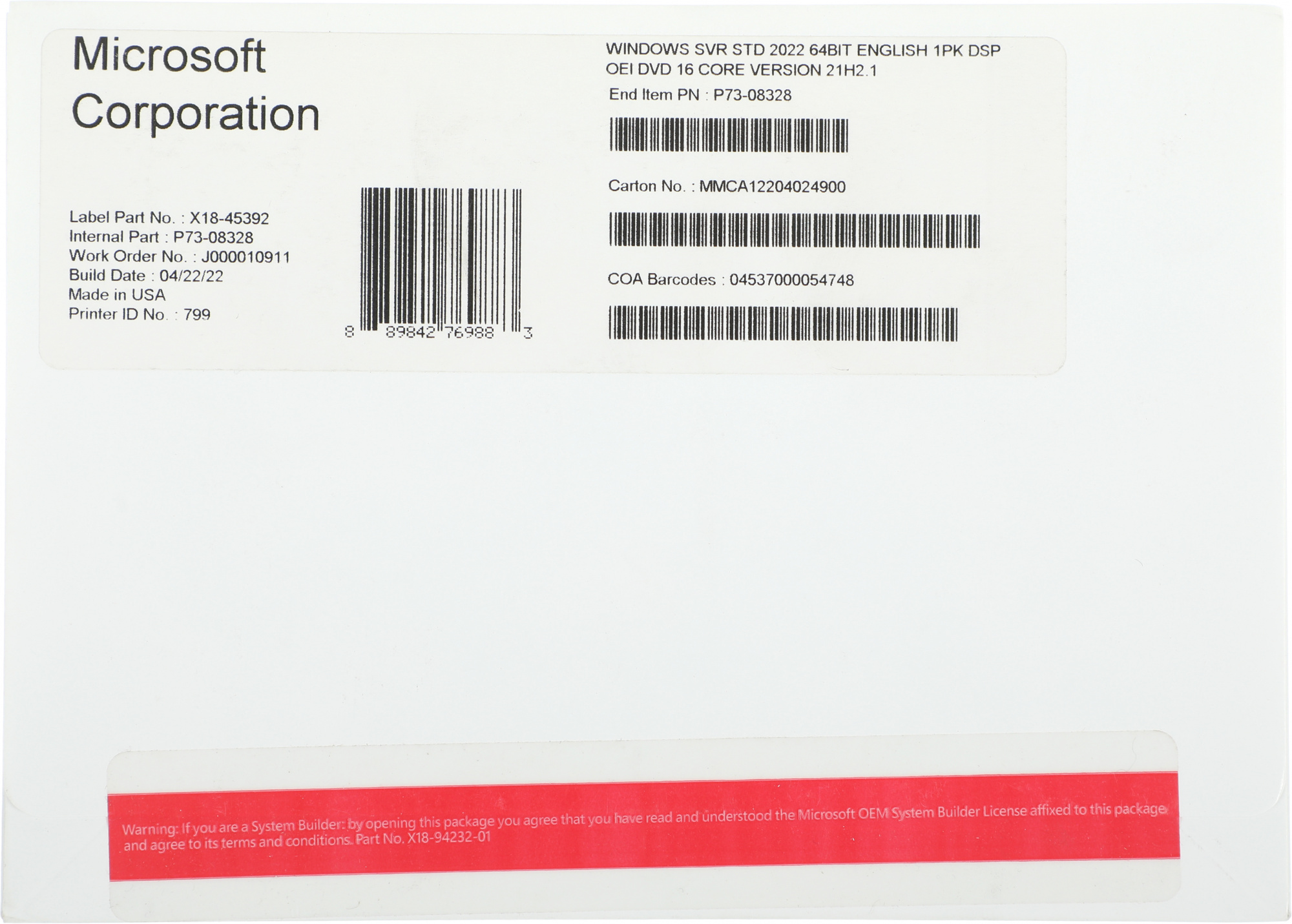 Операционная система Microsoft Windows Server Std 2022 64Bit Eng 1pk DSP OEI DVD 16 Core (P73-08328)