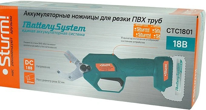 Аккумуляторные ножницы Sturm! CTC1801 для пластиковых и металлопластиковых труб от 1 до 32 мм. удобный инструмент для быстрой и легкой резки. Масса инструмента с аккумулятором чуть более 1 килограмма - Вы не почувствуете усталости при работе с данным инструментом.