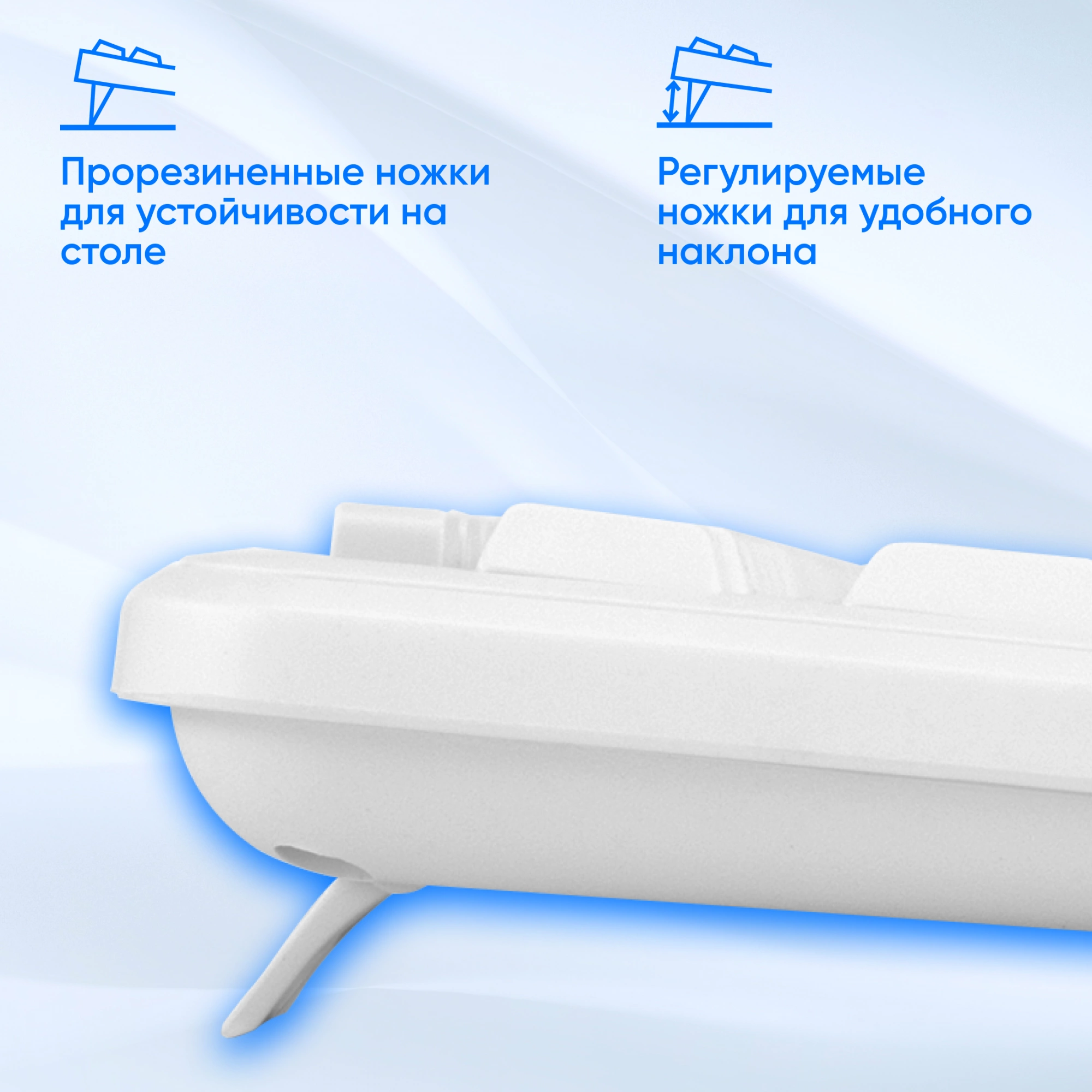 Благодаря продуманной конструкции пользоваться клавиатурой приятно и удобно. Влагозащитный корпус не боится попадания брызг или капель напитков. Есть регулируемые по высоте ножки.
