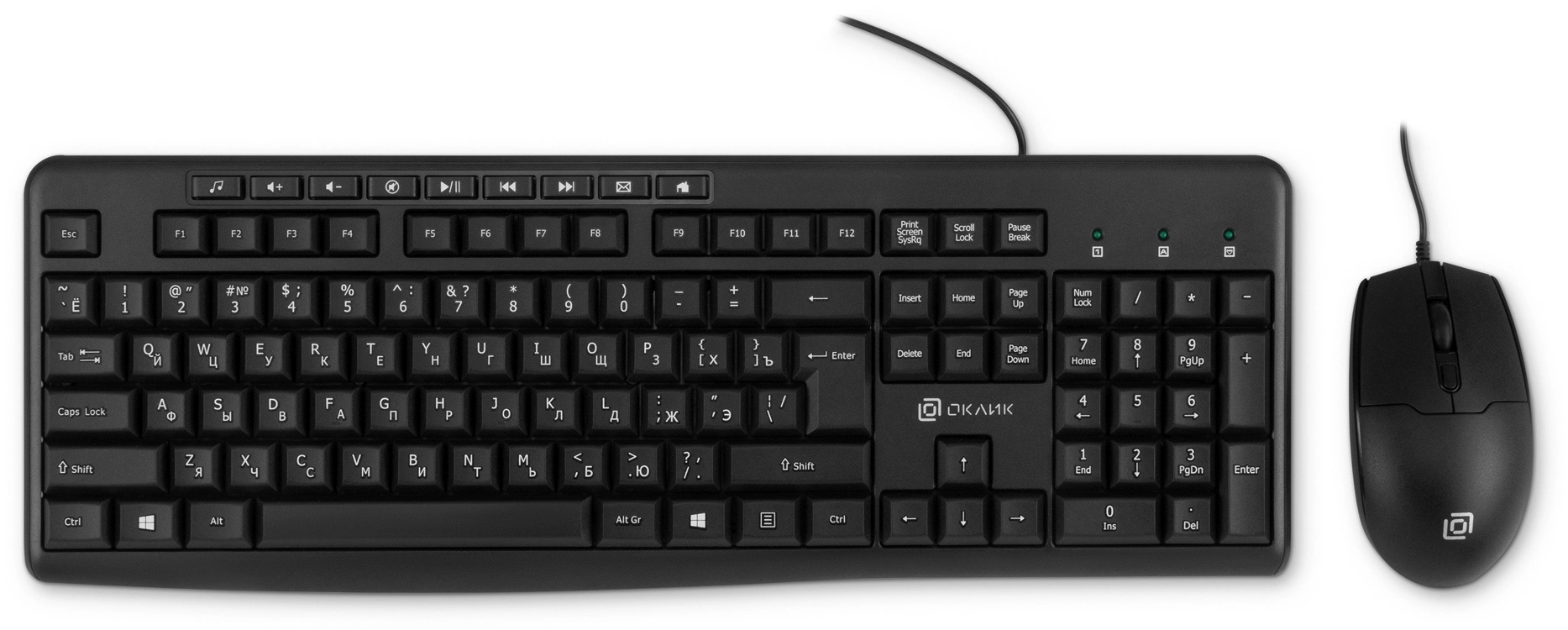В комплект Oklick S650 входят проводные клавиатура и мышь для комфортной работы дома и в офисе. Оба девайса выполнены в классическом строгом черном цвете.
