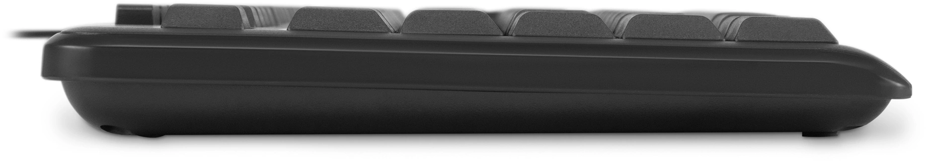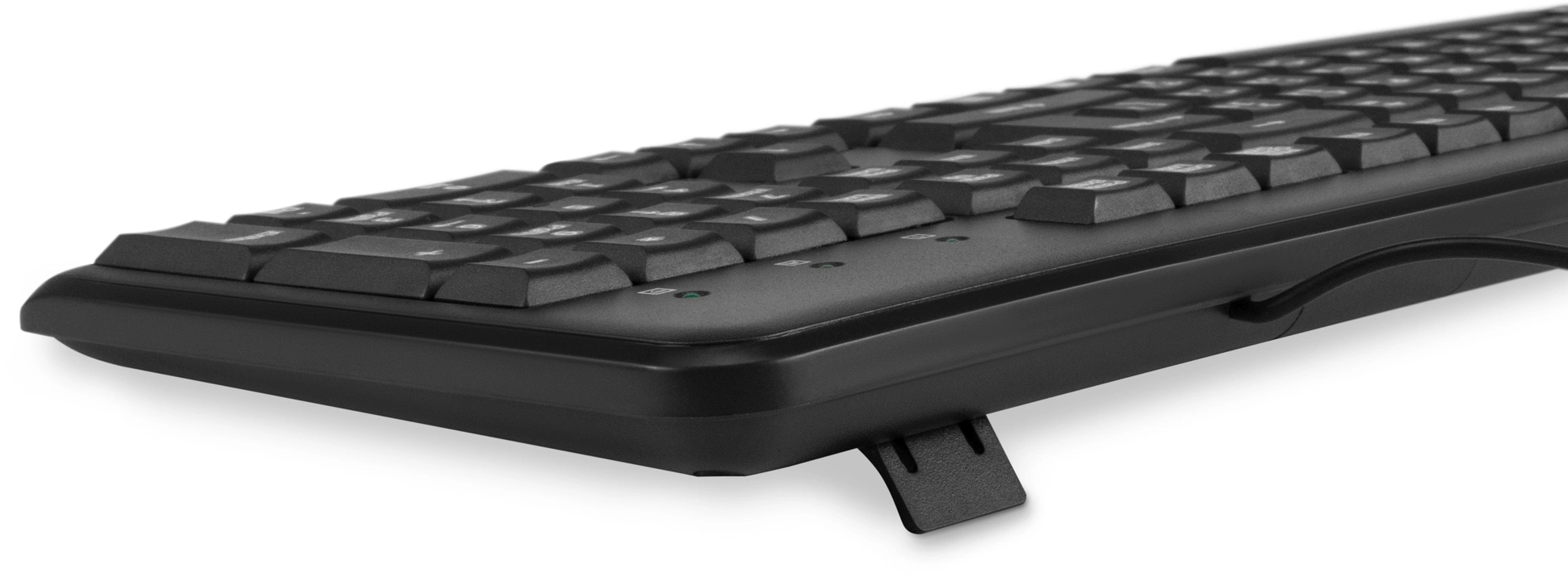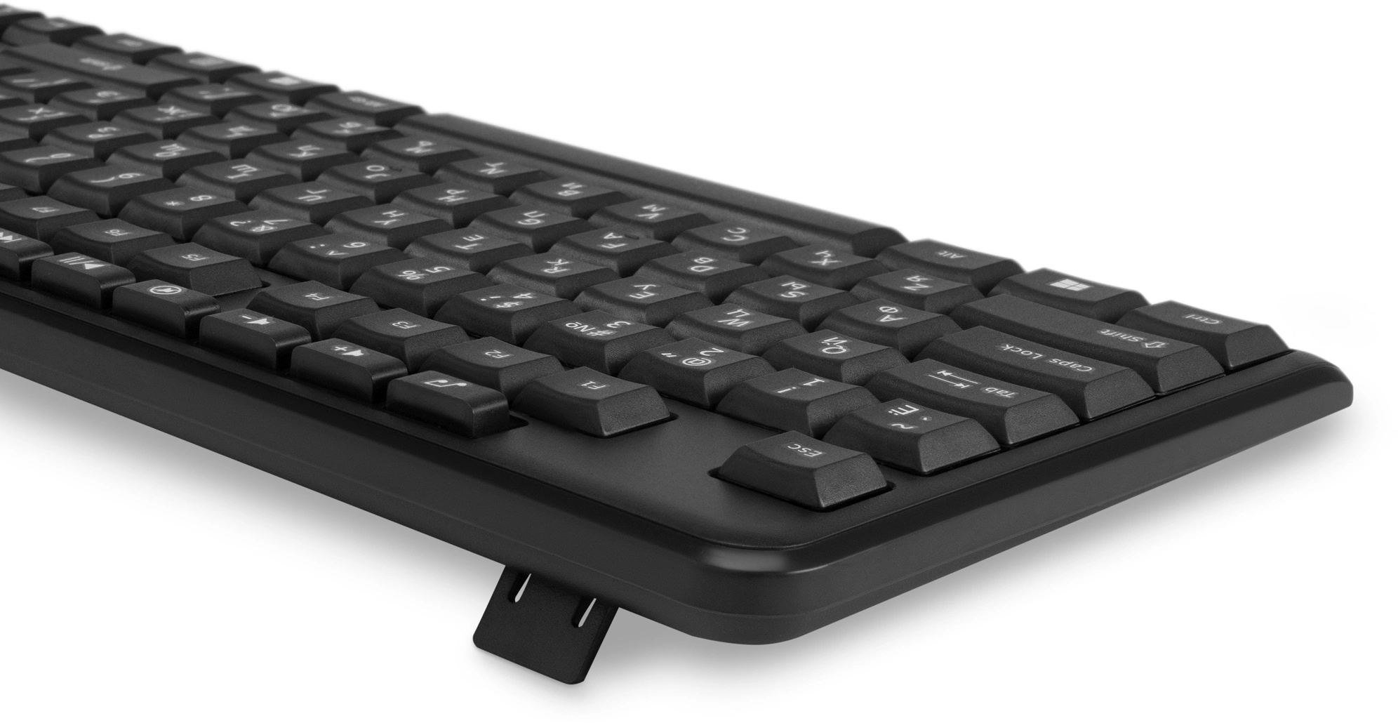 Клавиатура оборудована 113 клавишами, из них 9 – вынесены в отдельный блок и предназначены для выполнения разных мультимедийных команд. Устройство отличается долгим сроком службы: выдержит до 10 млн нажатий. Благодаря эргономичной конструкции пользоваться девайсом приятно и удобно. Влагозащитный корпус не боится попадания брызг или капель напитков. Есть регулируемые по высоте ножки.