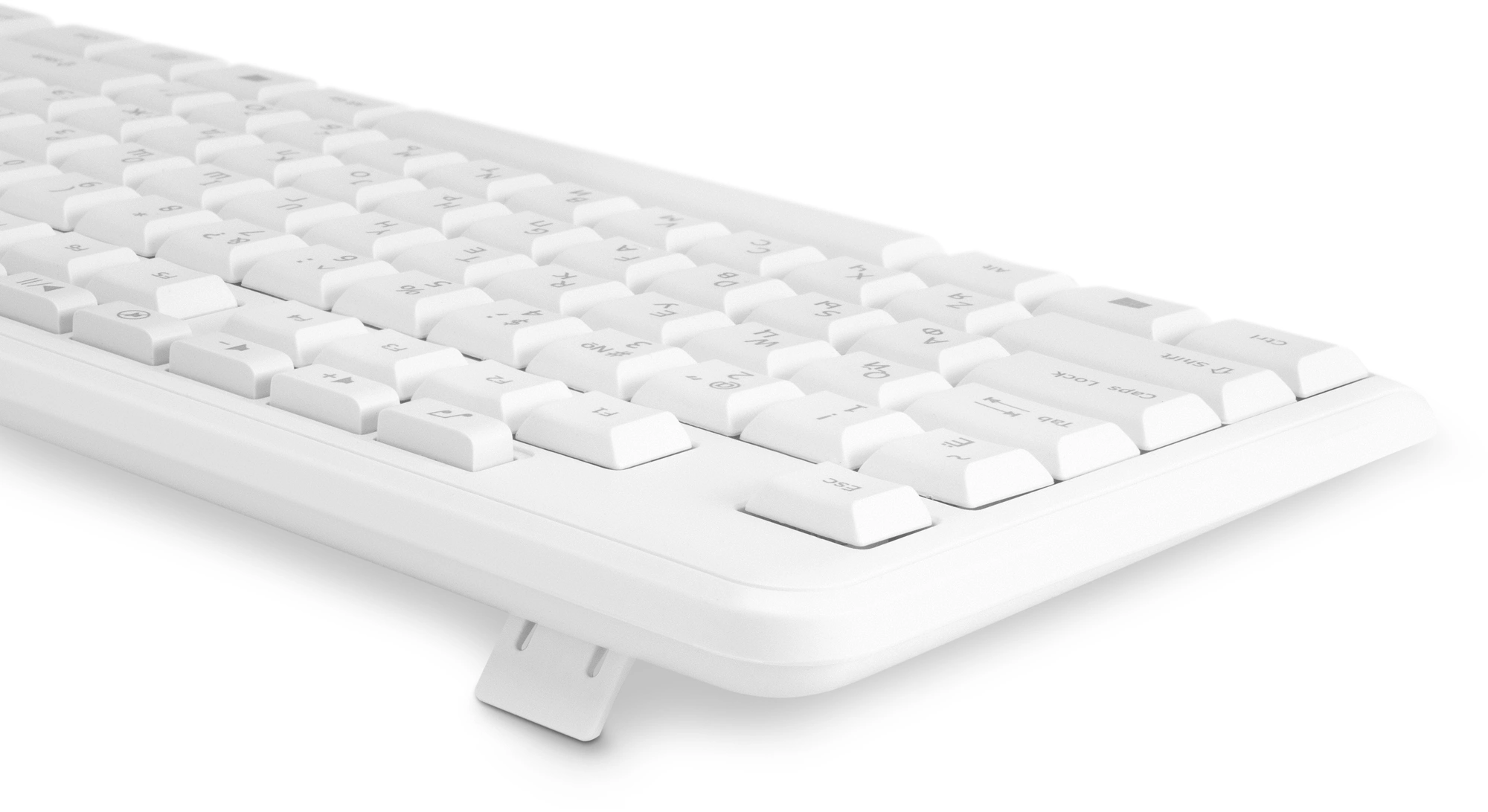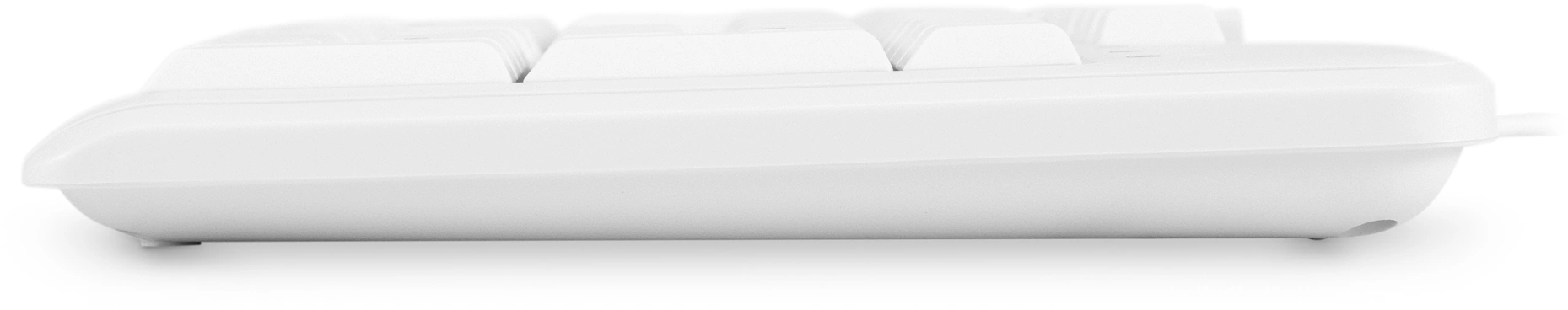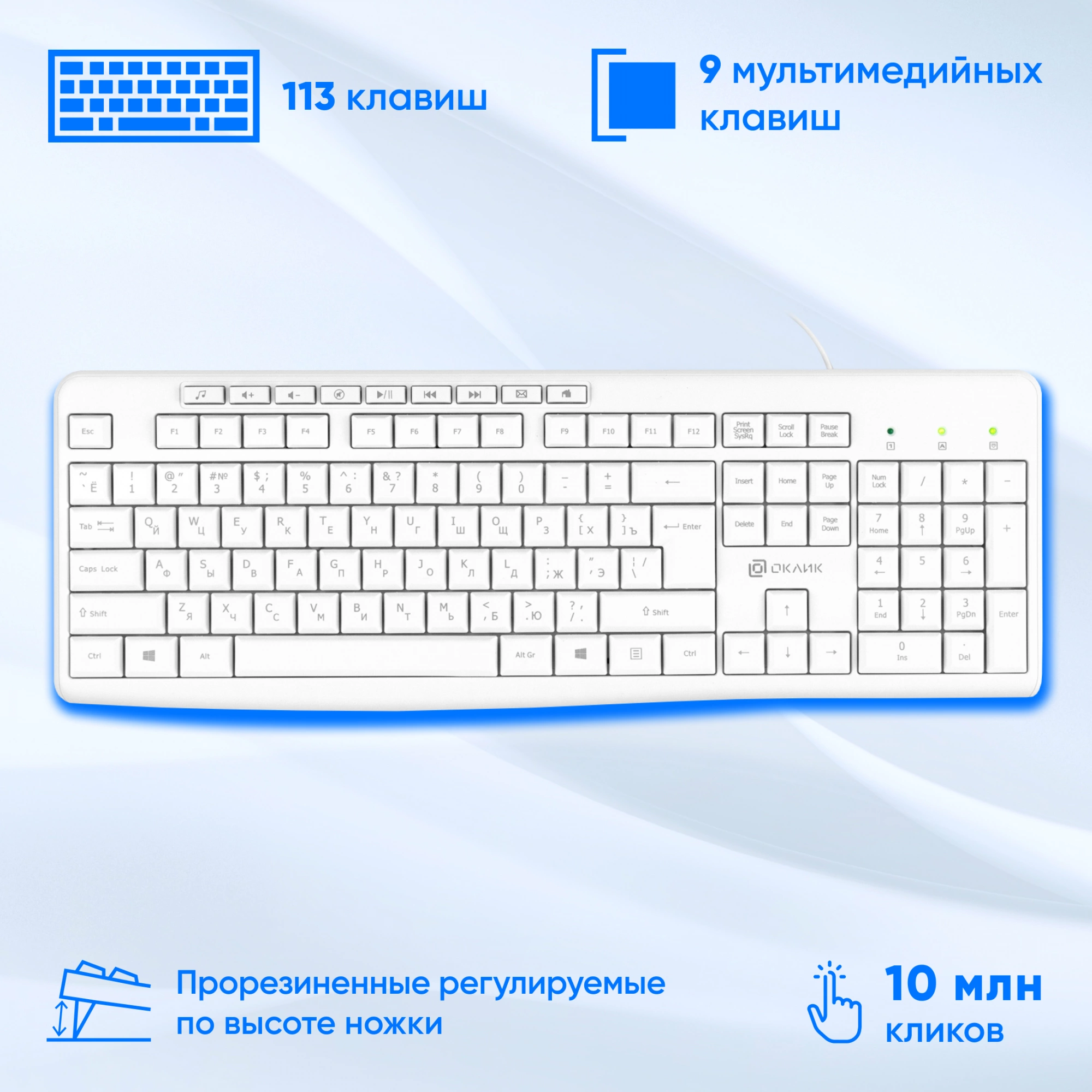 Клавиатура оборудована 113 клавишами, из них 9 – вынесены в отдельный блок и предназначены для выполнения разных мультимедийных команд. Устройство отличается долгим сроком службы: выдержит до 10 млн нажатий. Благодаря эргономичной конструкции пользоваться моделью приятно и удобно. Влагозащитный корпус не боится попадания брызг или капель напитков. Есть регулируемые по высоте ножки.