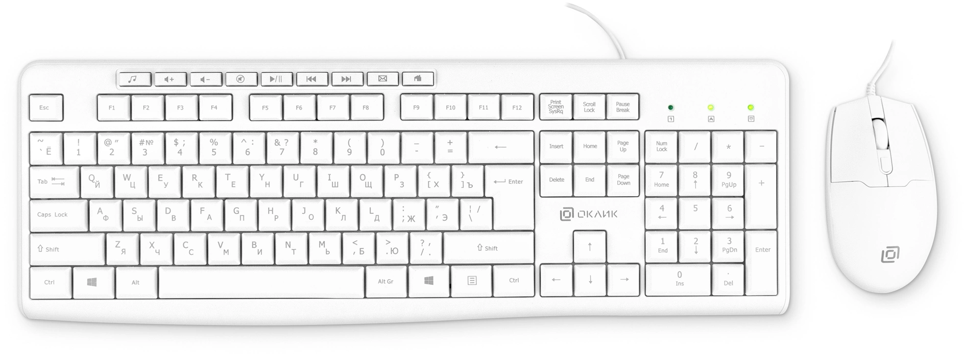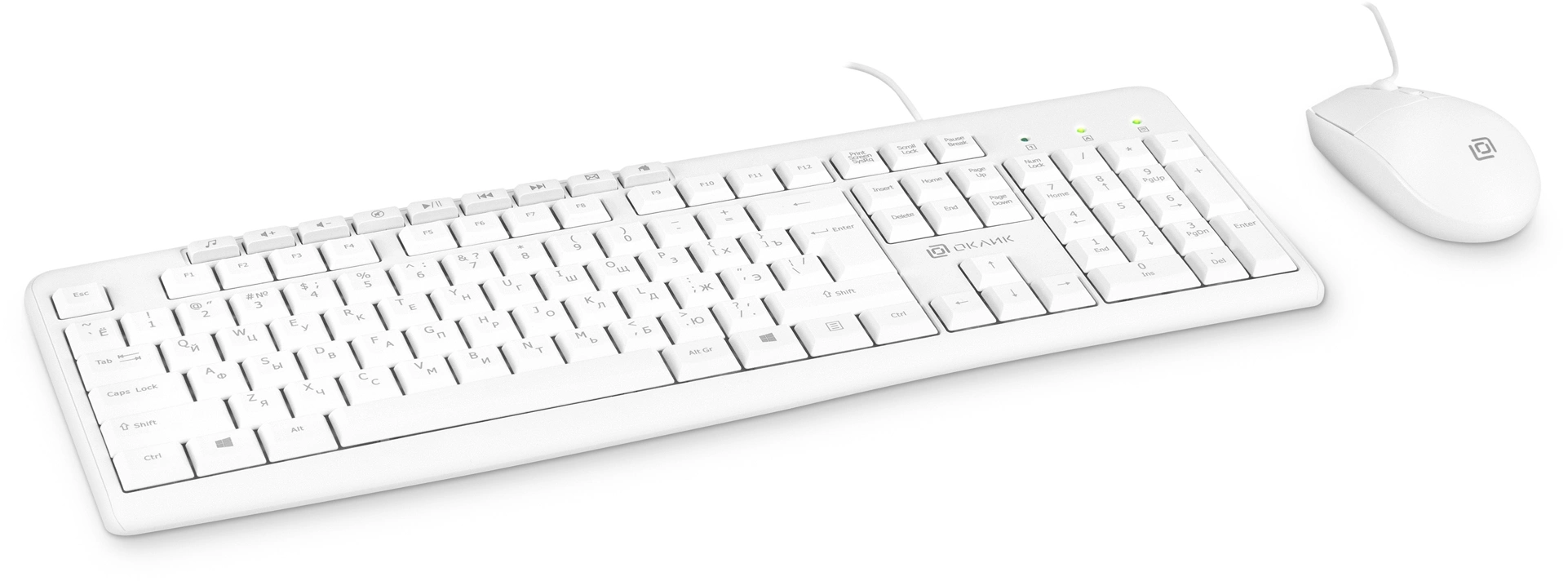 В комплект Oklick S650 входят проводные клавиатура и мышь для комфортной работы дома и в офисе. Оба девайса выполнены в стильном белом цвете.