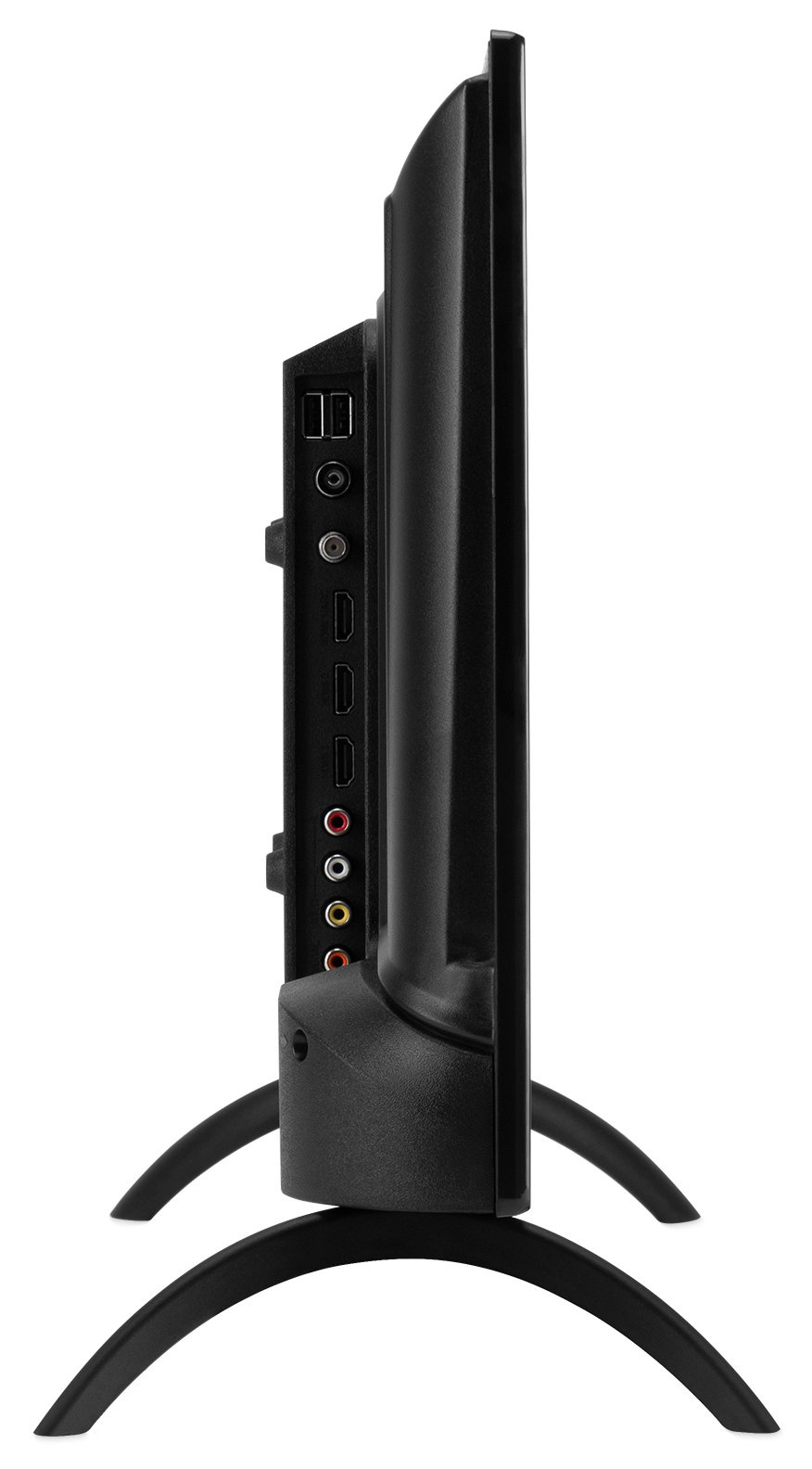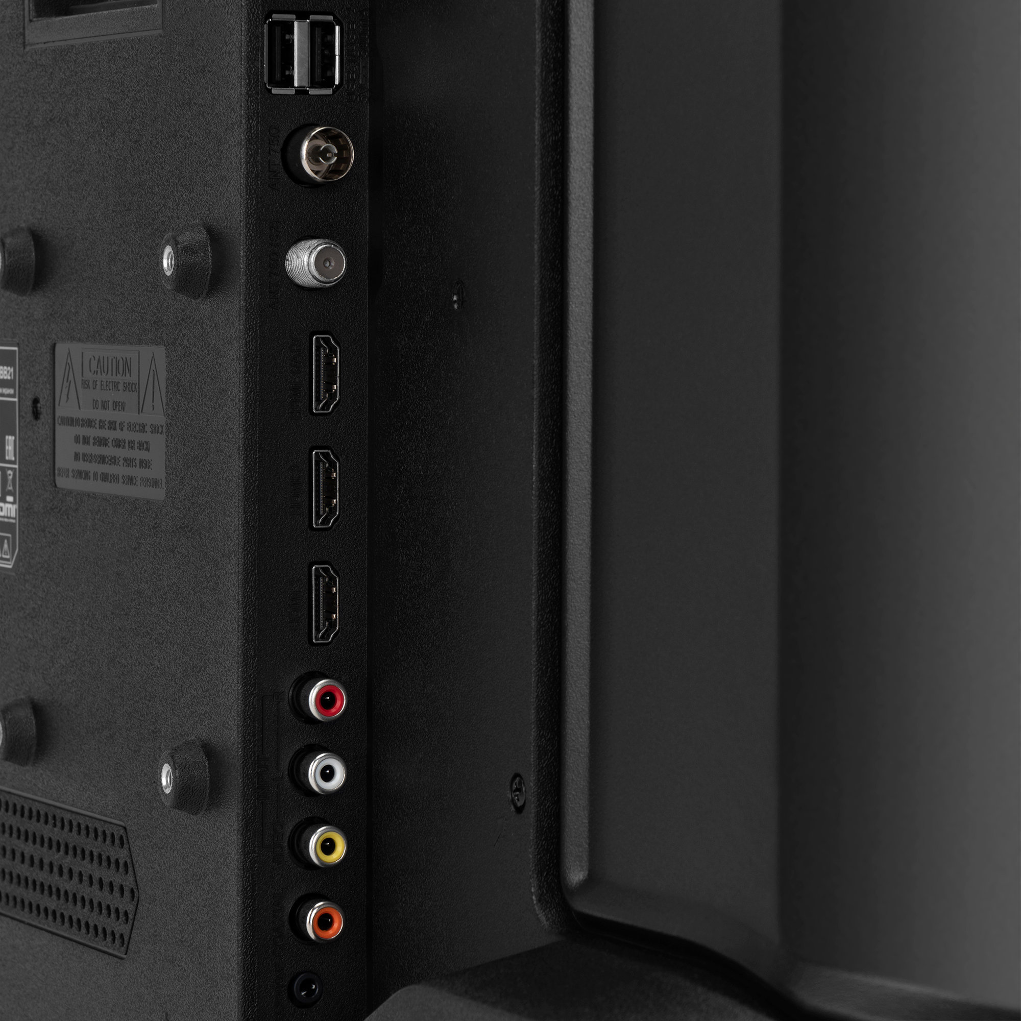 Телевизор представлен в классическом черном цвете и лаконичном дизайне, поэтому он гармонично впишется в интерьер комнаты или кухни. За счет матового покрытия на корпусе не заметны отпечатки пальцев. Подставка позволяет установить устройство на тумбу, а крепление VESA (не входит в комплект) – повесить на стену.