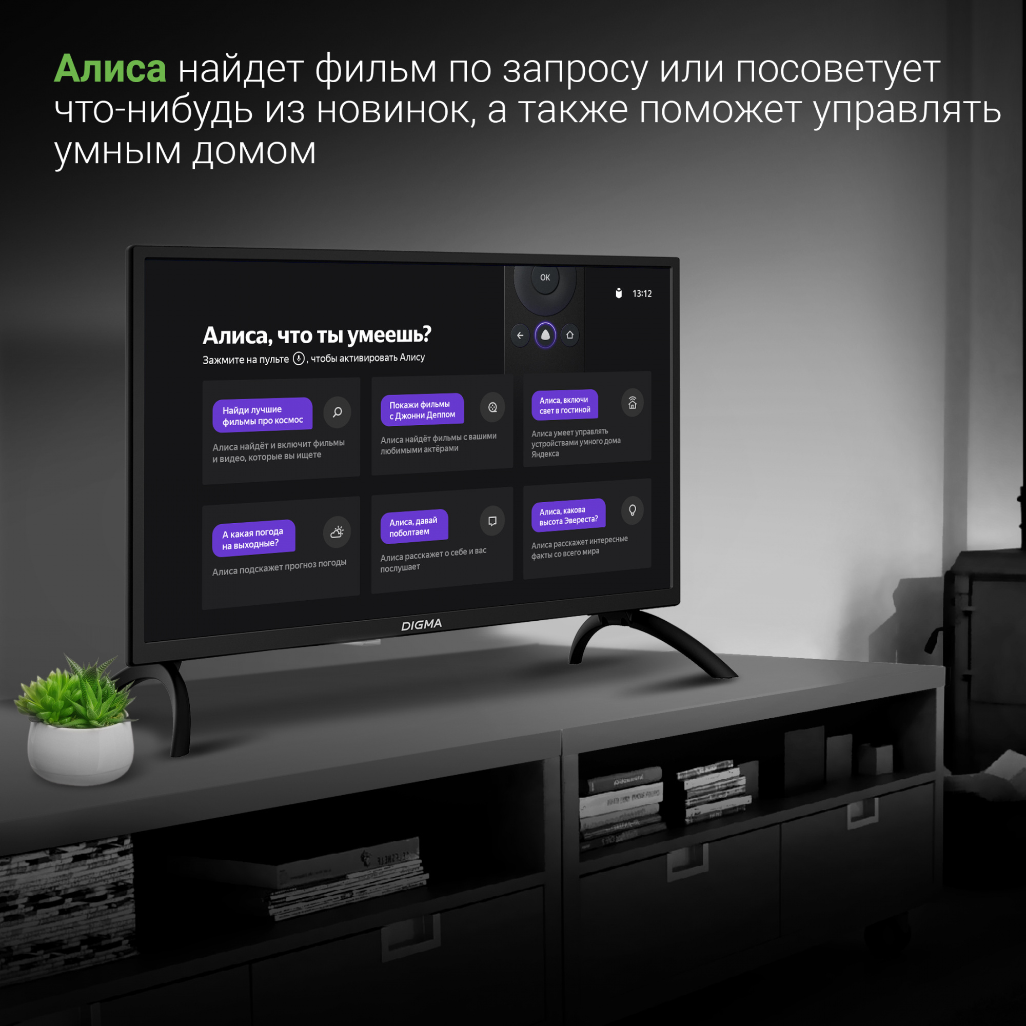 Телевизор поддерживает SMART TV и имеет встроенные модули – Bluetooth и Wi-Fi. ТВ имеет функцию голосового помощника: «Алиса» найдет фильм по запросу, посоветует что-нибудь из новинок и позволит управлять системой «умный дом». Операционная система Яндекс.ТВ позволяет просматривать видео в интернете, запускать сторонние приложения, слушать музыку, и наслаждаться фильмами из онлайн-кинотеатров. Кабельный DVB-C, цифровые DVB-T/DVB-T2, спутниковые DVB-S/DVB-S2 тюнеры обеспечивают качественную передачу сигнала.