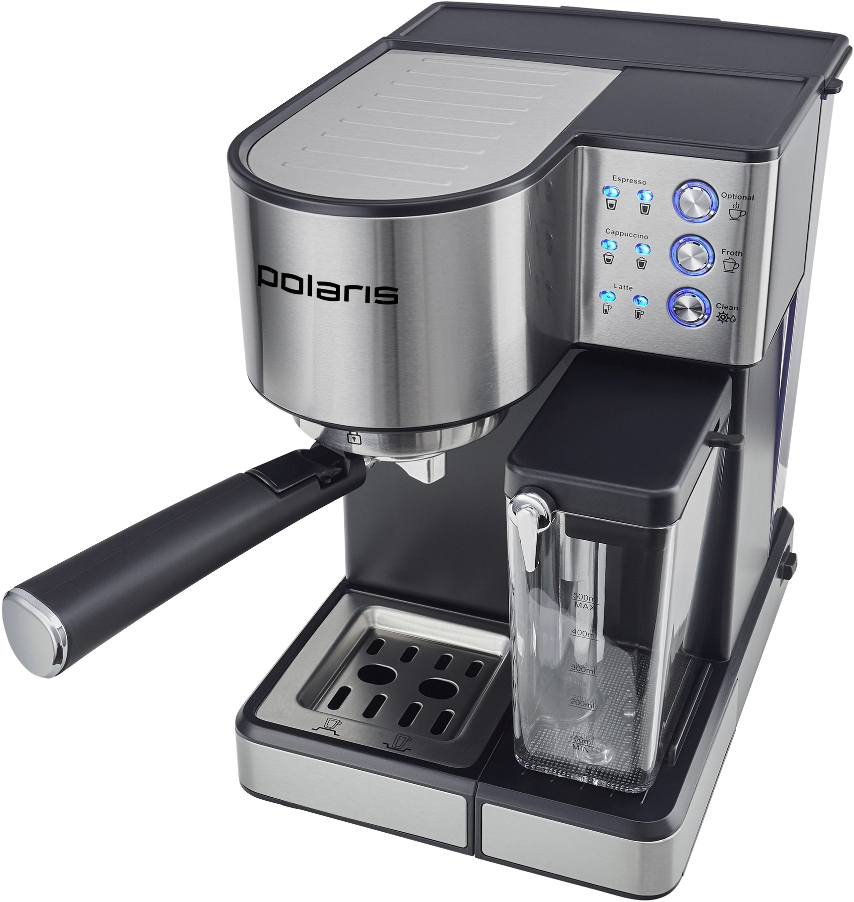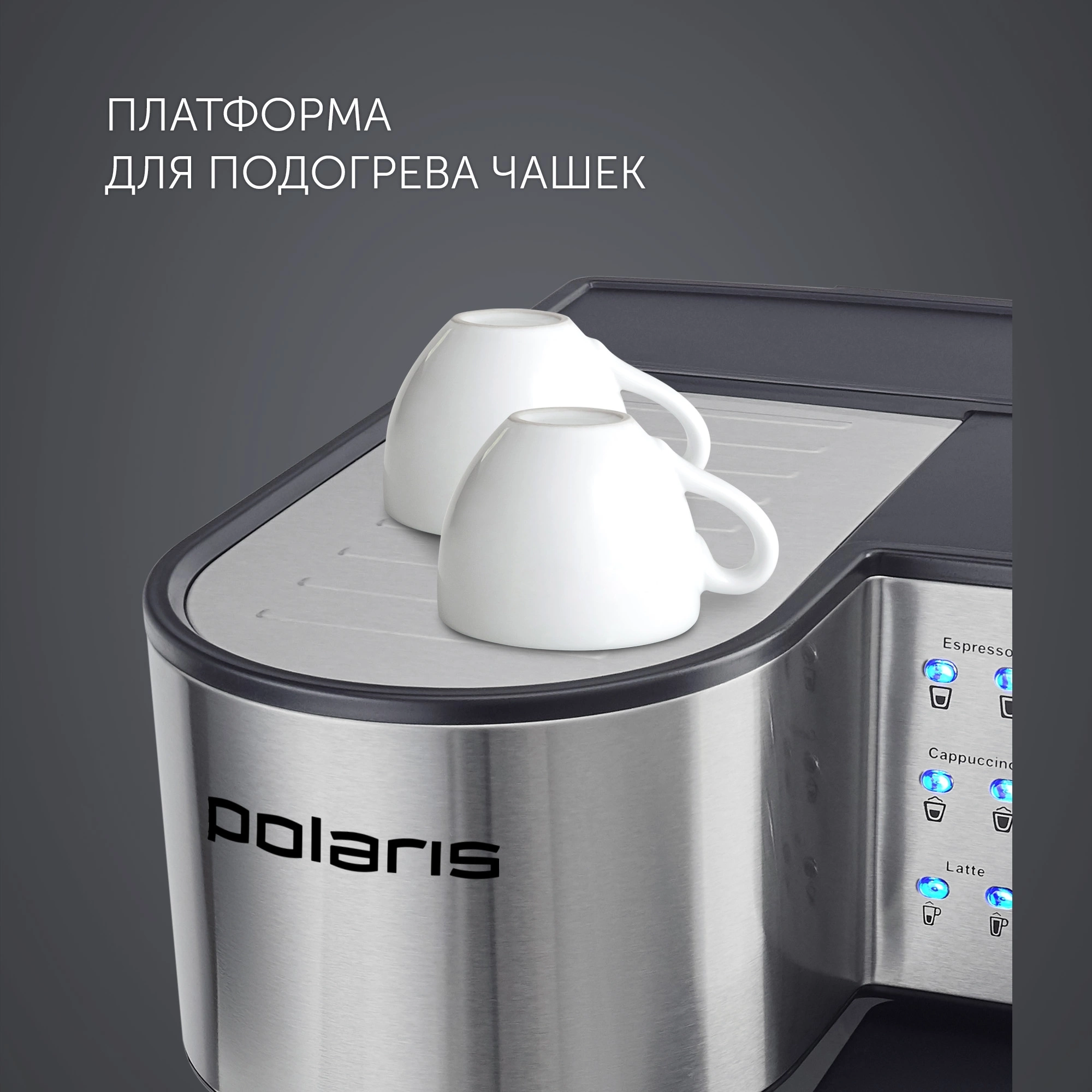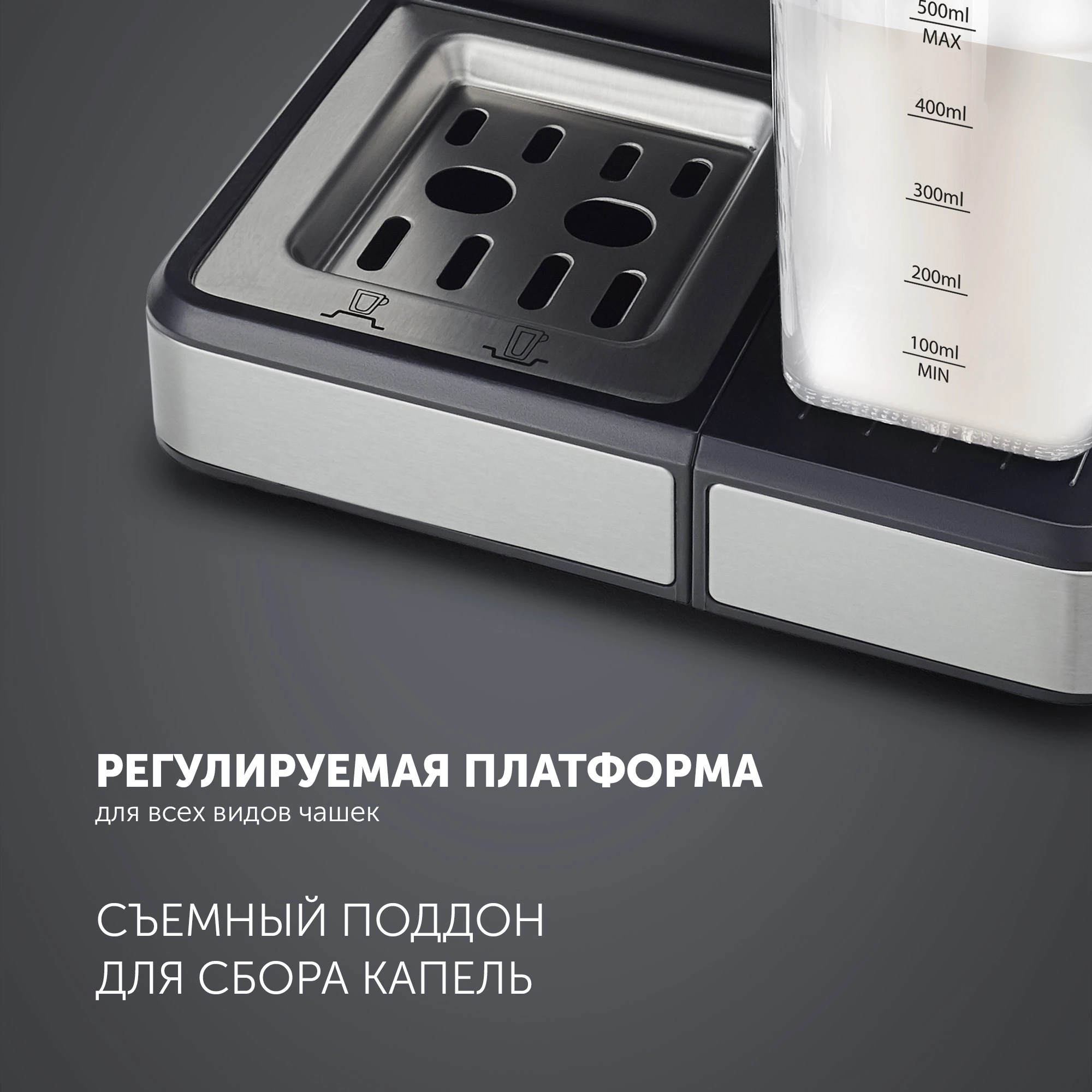 два независимых бойлера, капучинатор, панель для подогрева чашек, съемный поддон для капель, съемный резервуар для воды