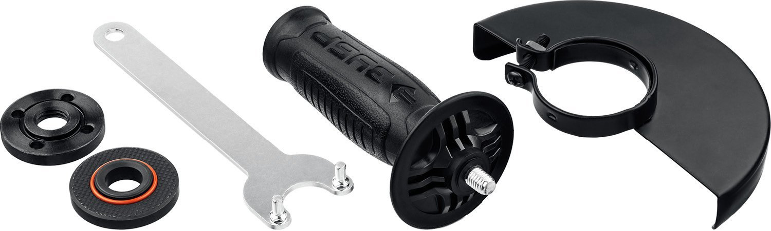 Машина углошлифовальная, кожух защитный, рукоятка дополнительная, ключ специальный, ключ имбусовый, руководство по эксплуатации.