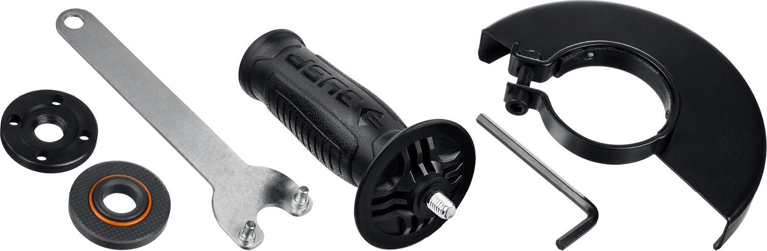 Машина углошлифовальная, кожух защитный, рукоятка дополнительная, ключ специальный, ключ имбусовый, руководство по эксплуатации.