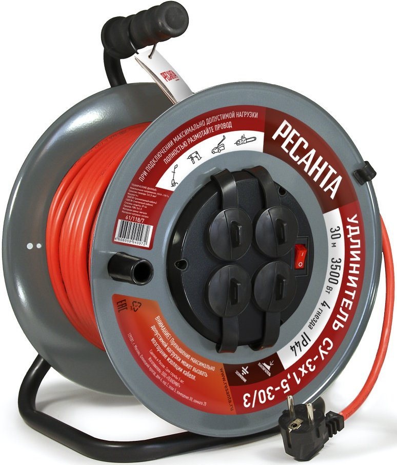 (61/118/7) 3x1.5кв.мм 4розет. 30м ПВС катушка крас...