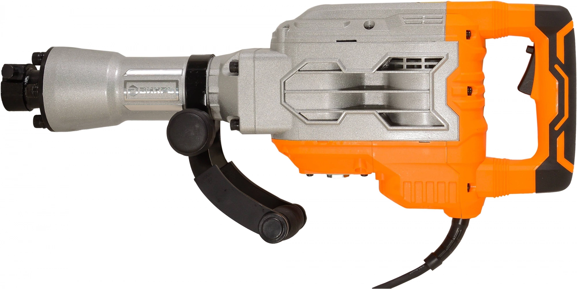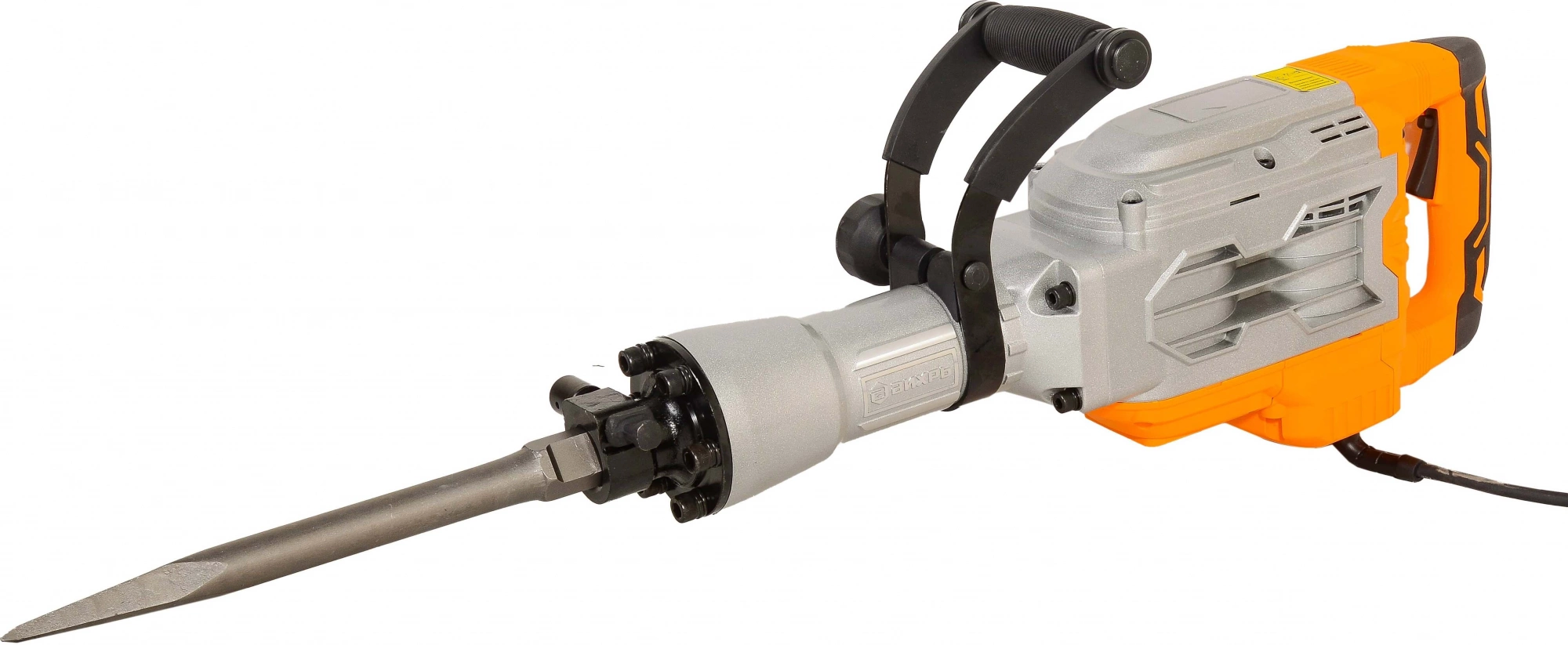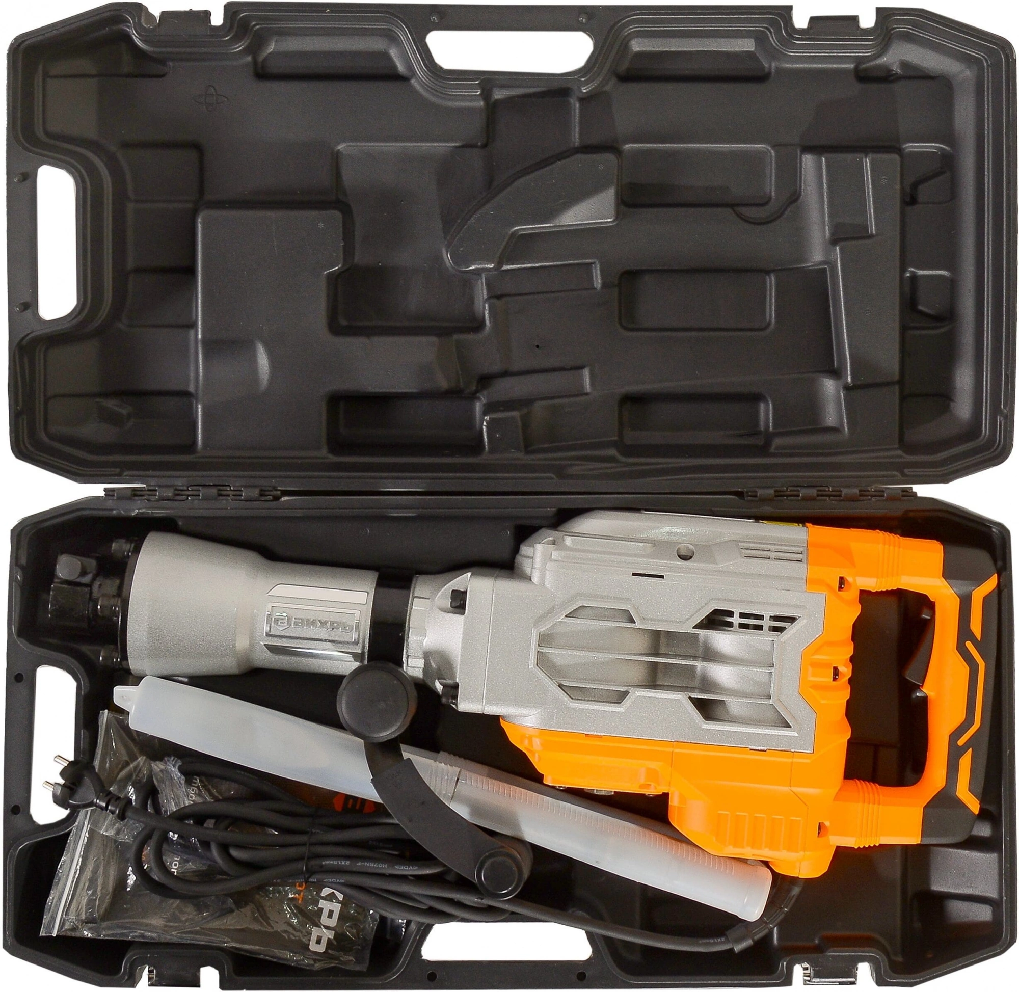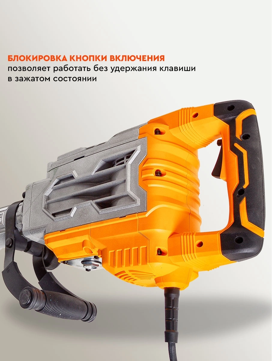 Кнопка фиксации клавиши включения, клавиша включения, кабель питания, смотровое окно уровня масла редуктора/маслоналивная горловина, сменная оснастка, фиксатор сменной оснастки, патрон, фиксатор дополнительной рукоятки, дополнительная рукоятка. Пика, зубило и тюбик со смазкой в комплекте