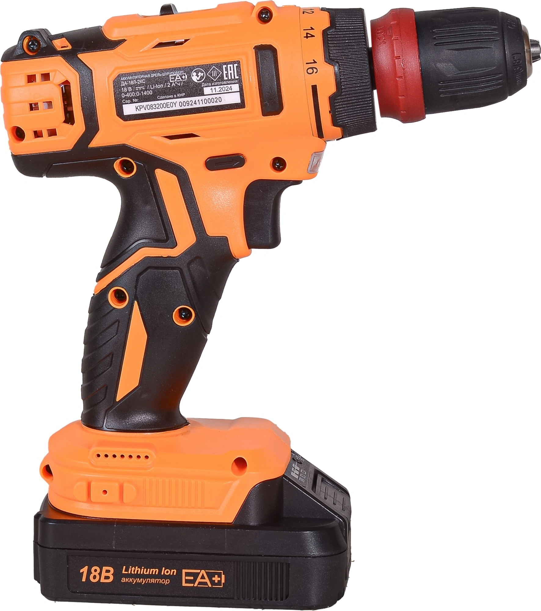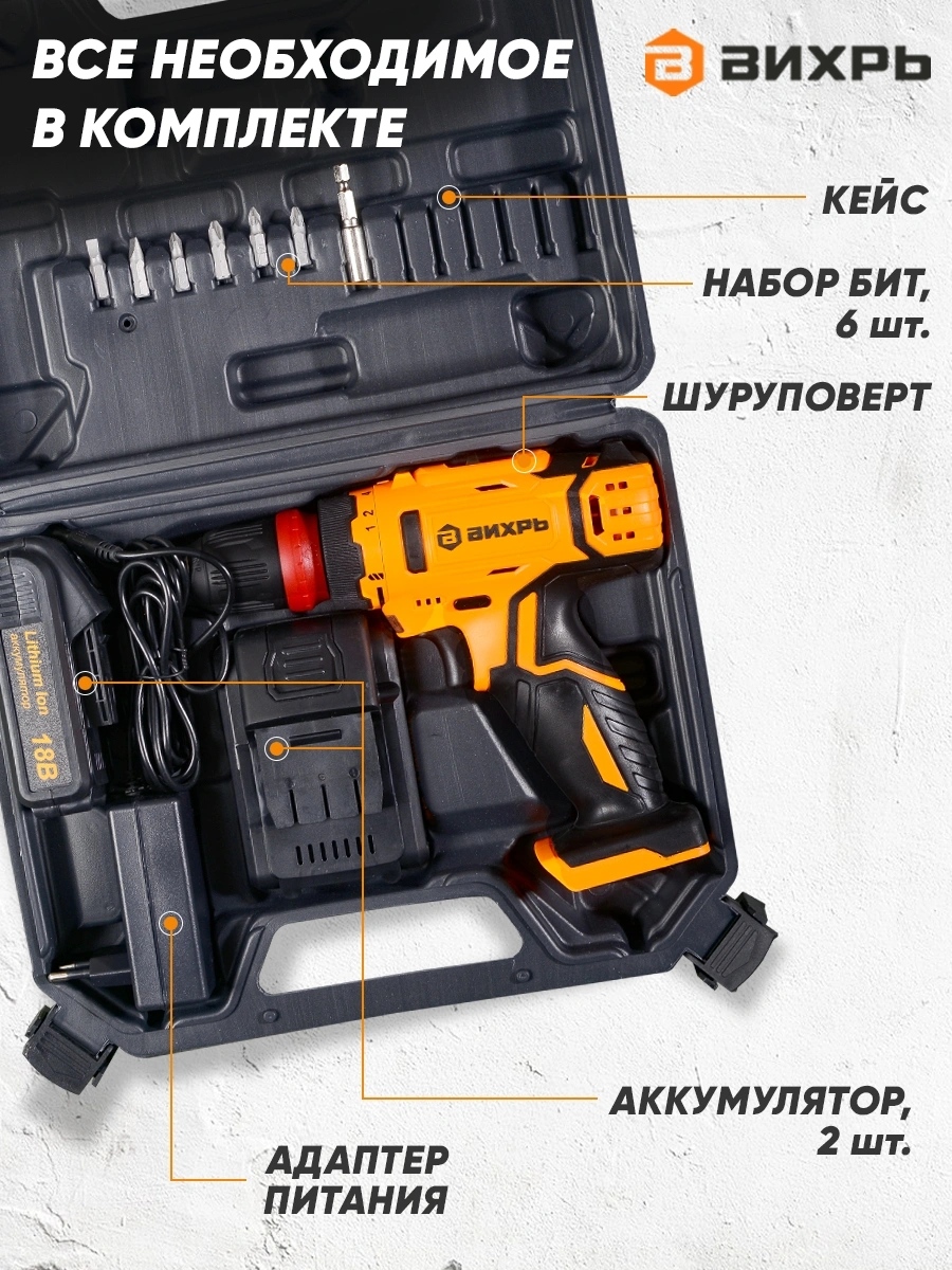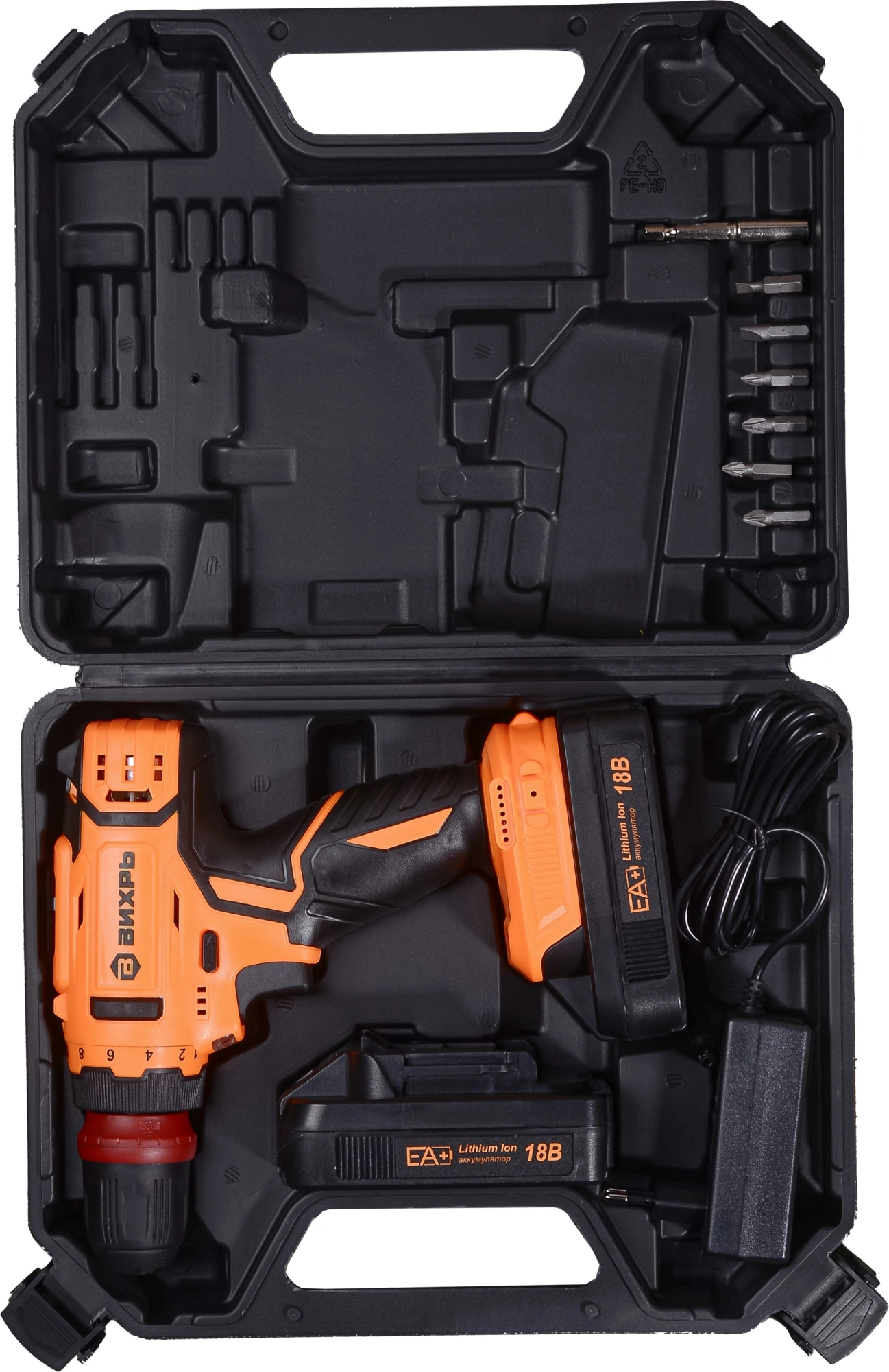 Дрель-шуруповер, 2 аккумулятора, зарядное устройство, паспорт, кейс.