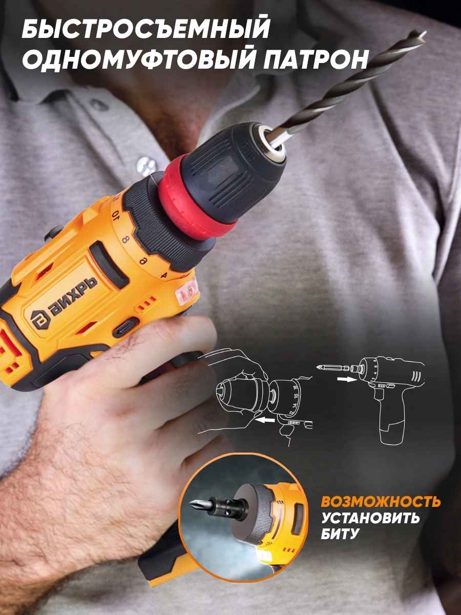Быстросъёмный одномуфтовый патрон. На моделях с быстросъёмным патроном можно снять патрон и установить биту непосредственно в шестигранный магнитный держатель. Это делает инструмент компактнее и исключает раскручивание патрона во время работы; прорезиненная ручка.