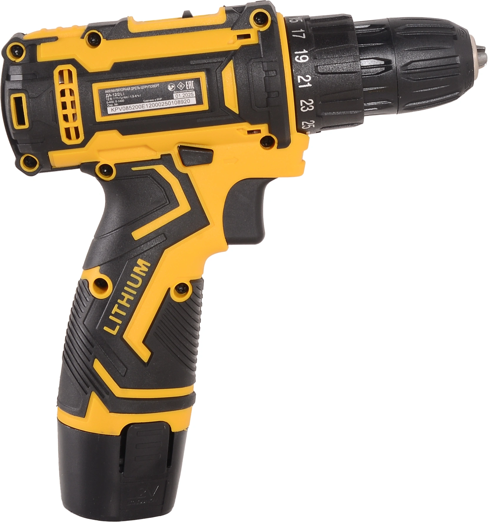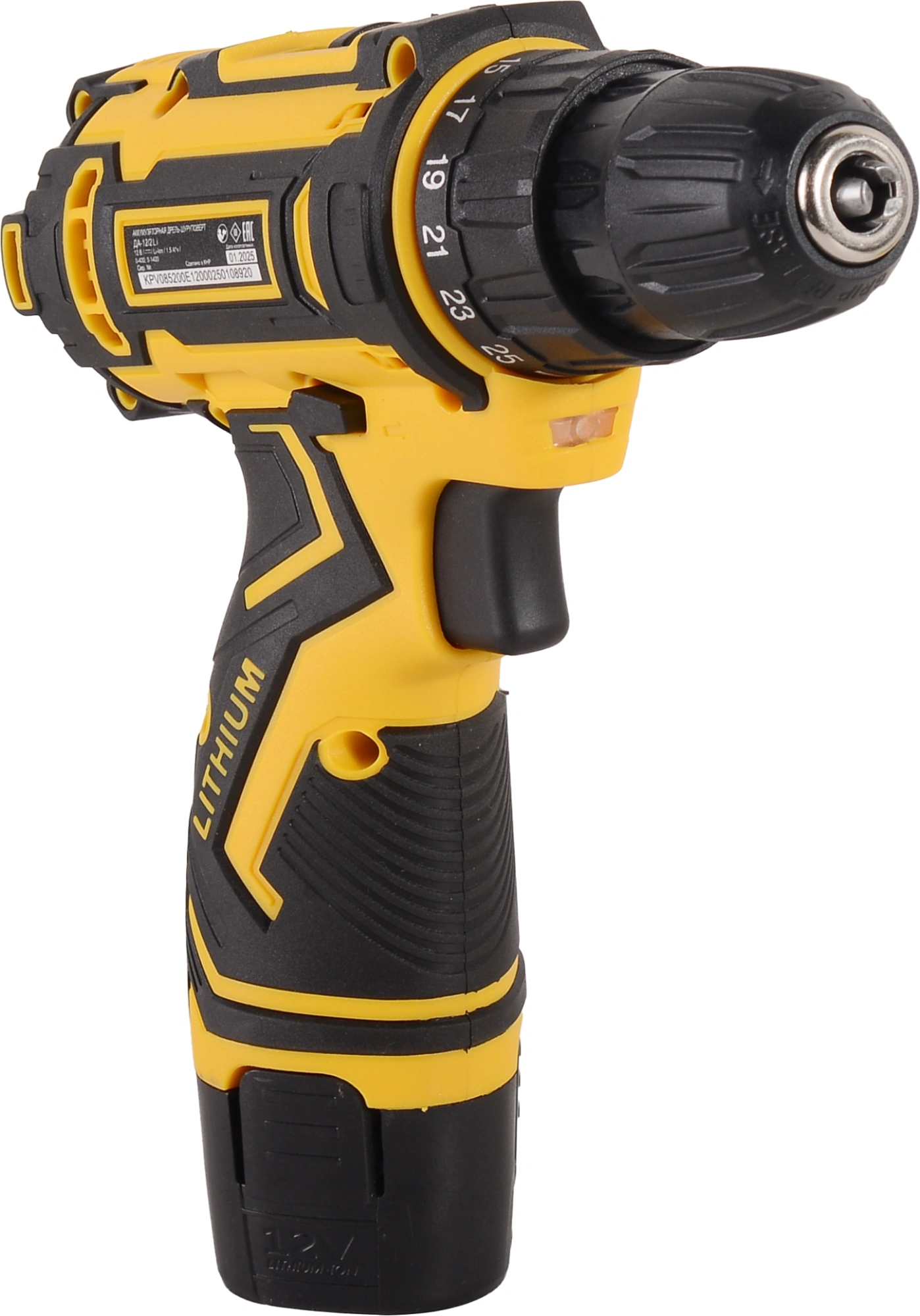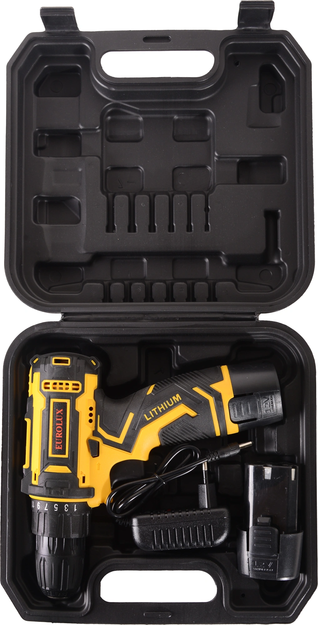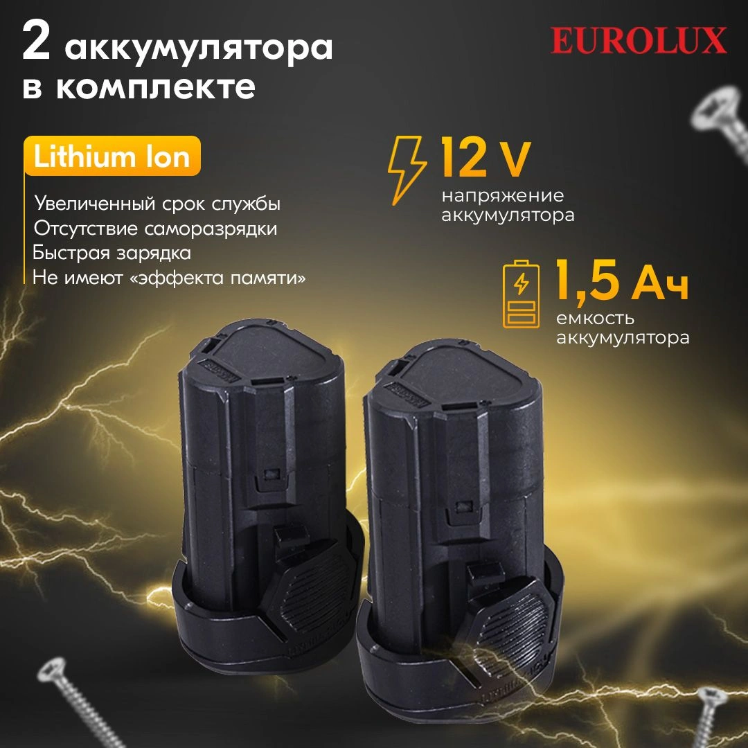 Дрель-шуруповер, 2 аккумулятора, зарядное устройство, паспорт, кейс.