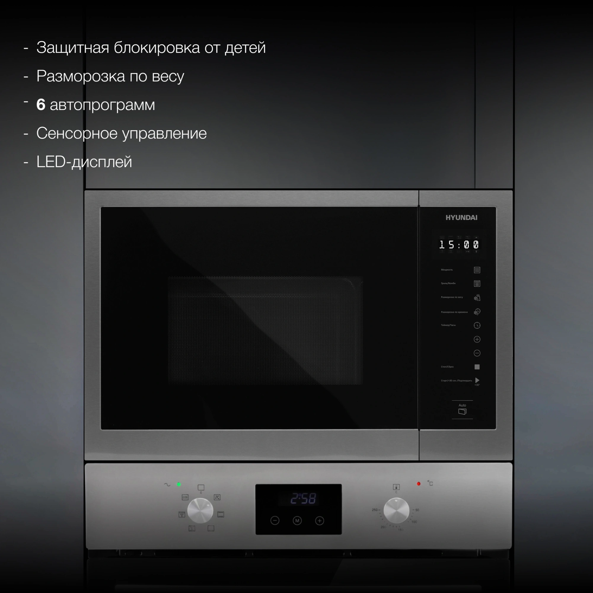 Встраиваемая микроволновая печь Hyundai HBW 2560 IX станет верным помощником на кухне благодаря своему широкому функционалу. Она отлично подойдет для приготовления небольших порций блюд и быстрого разогрева уже имеющихся прямо в тарелке.