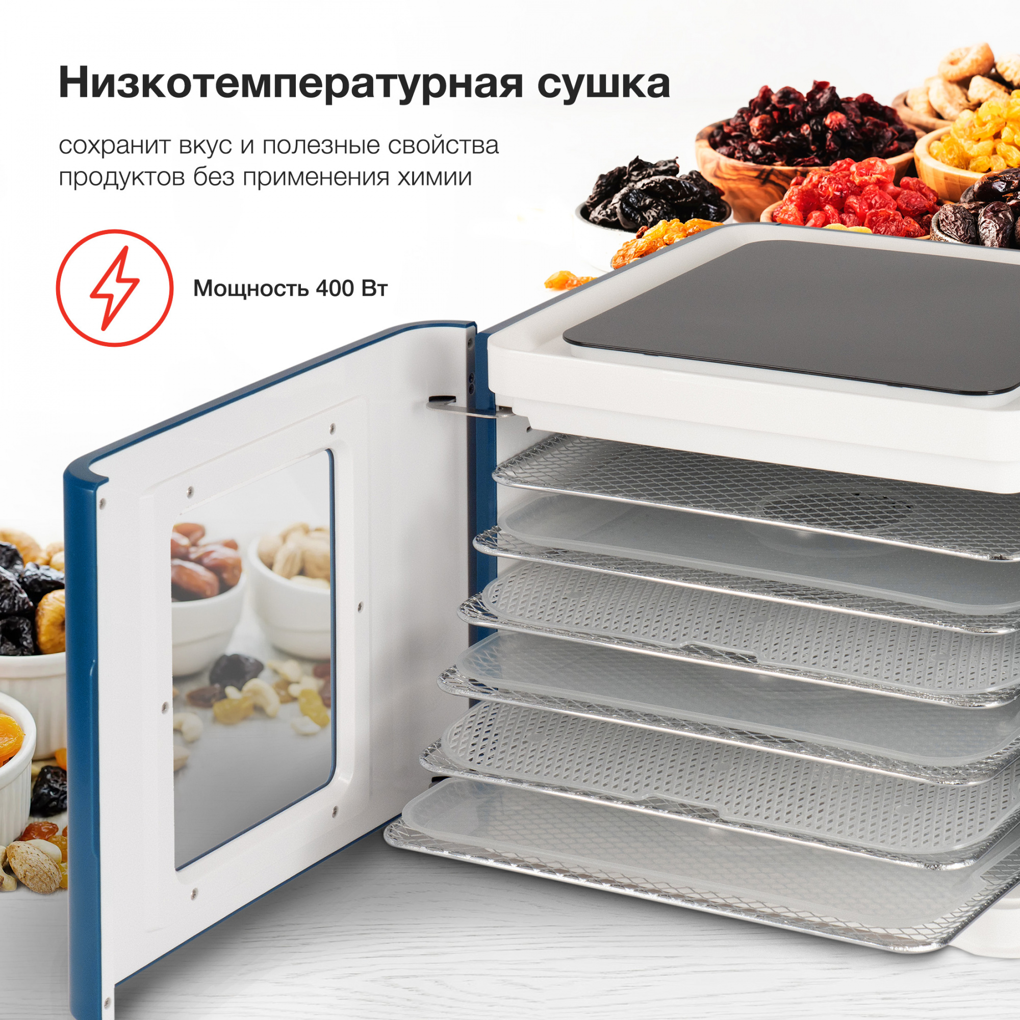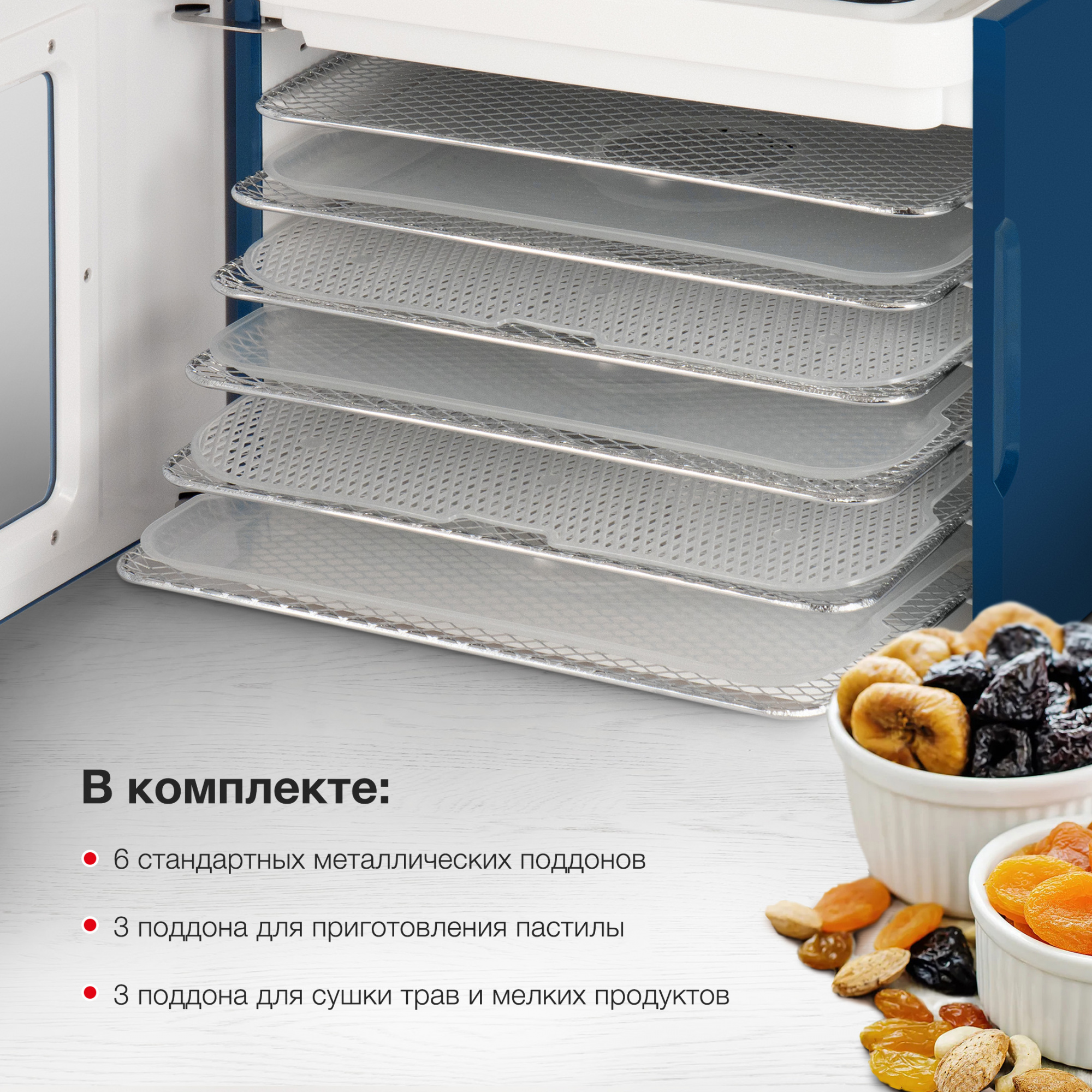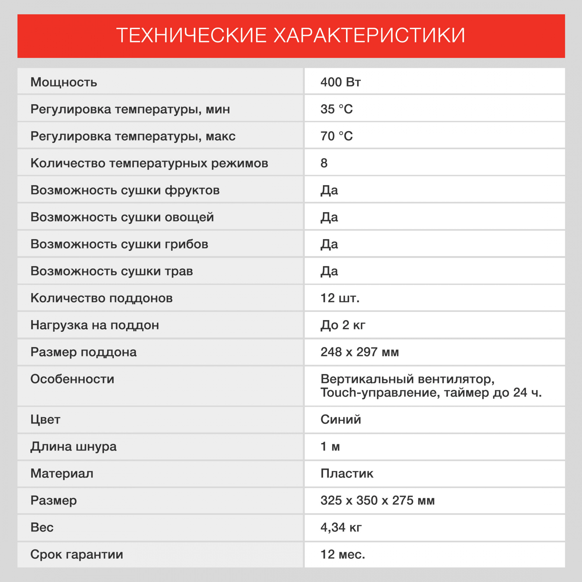 Мощность устройства составляет 400 Вт, она помогает пище сохранять все полезные свойства. Также она позволяет девайсу в течение длительного времени поддерживать температурный режим 35-70 градусов для надлежащей сушки любых видов продуктов: овощей, фруктов и даже грибов и трав. Таймер можно установить в пределах 24 часов. Внутреннее пространство данной модели вмещает до 12 поддонов, каждый из которых может нести вес до 2 кг. Все они идут в наборе с Starwind SFD9535 и не требуют перемещения в процессе работы – конвекция с применением установленного вертикального вентилятора равномерно распределяет тёплый воздух по сушилке. Шесть поддонов имеют общее назначение, ещё три подходят для приготовления пастилы и ещё три - для трав и мелких продуктов.