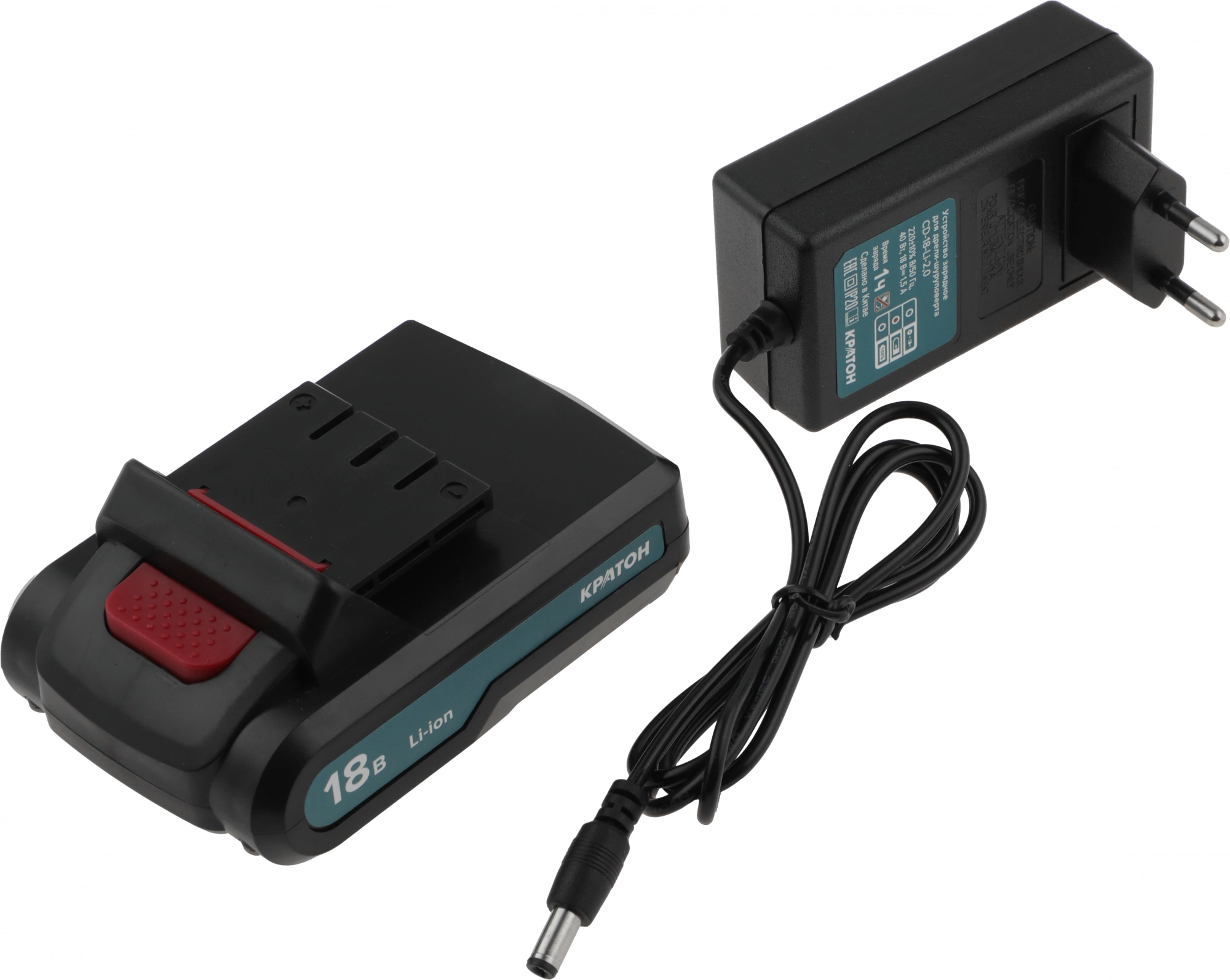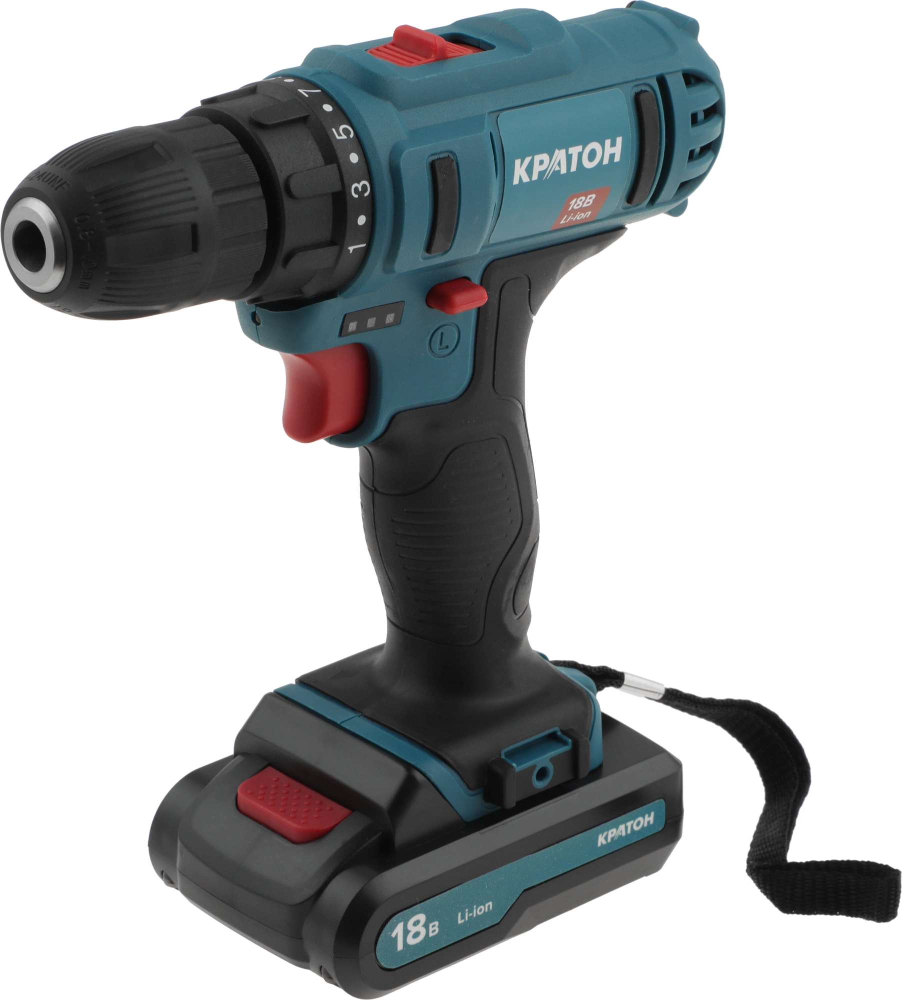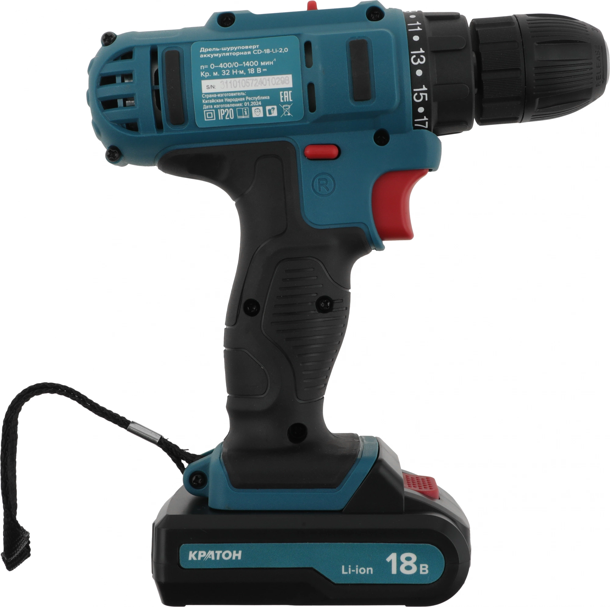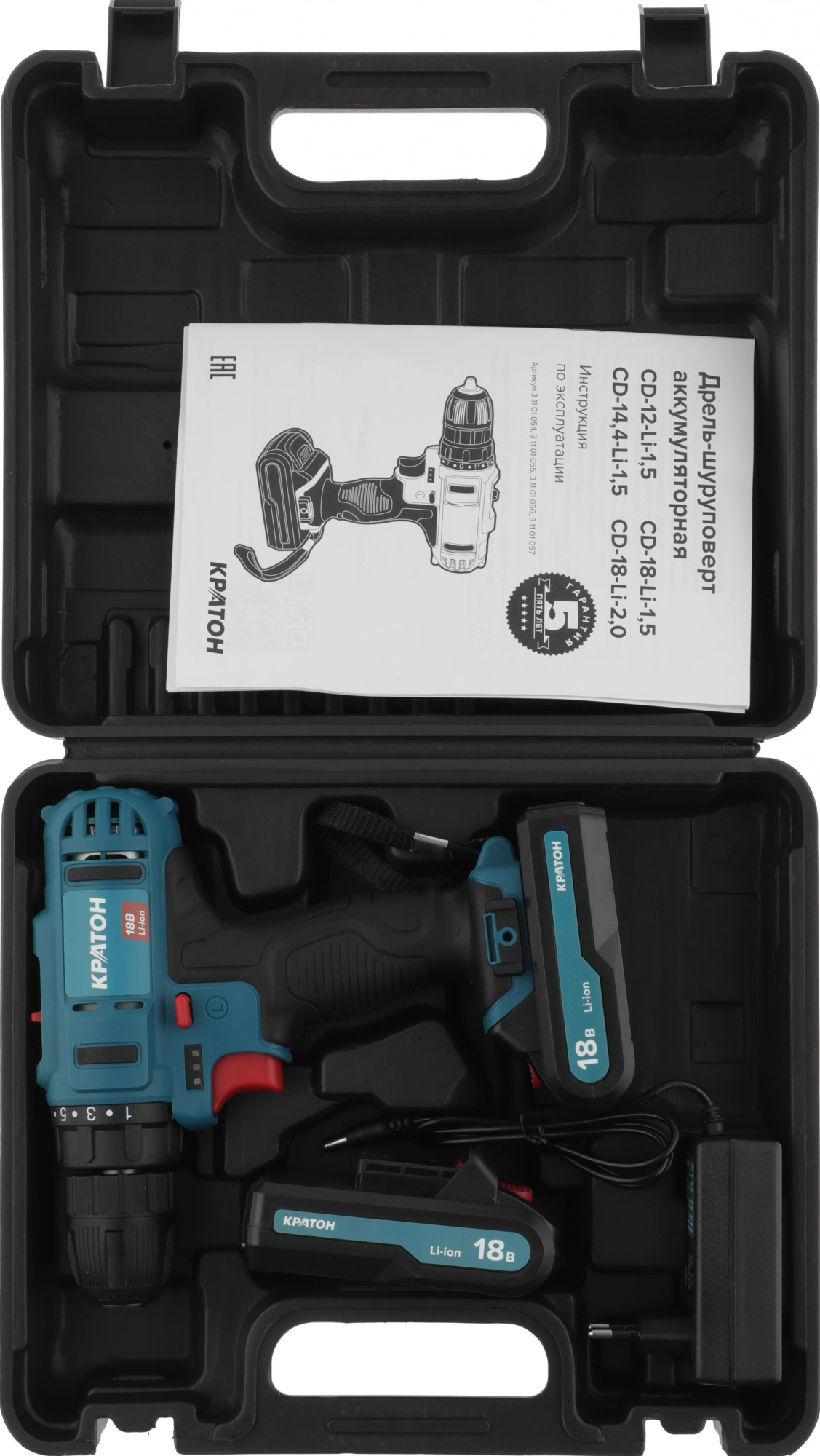 Дрель-шуруповерт, зарядное устройство, батарея аккумуляторная Li-ion, 18 В, 2,0 А·ч - 2 шт., сверло HSS 1,5; 2,5; 3; 4; 5; 6 мм - 6 шт., держатель бит магнитный, L = 60 мм., CR-V биты (насадки отверточные), 25 мм., 3; 4; 5; 6; PH1; PH2; T15; T20; H4; H5 - 10 шт., скоба, винт М3 ? 10, гайка М3, кейс.
