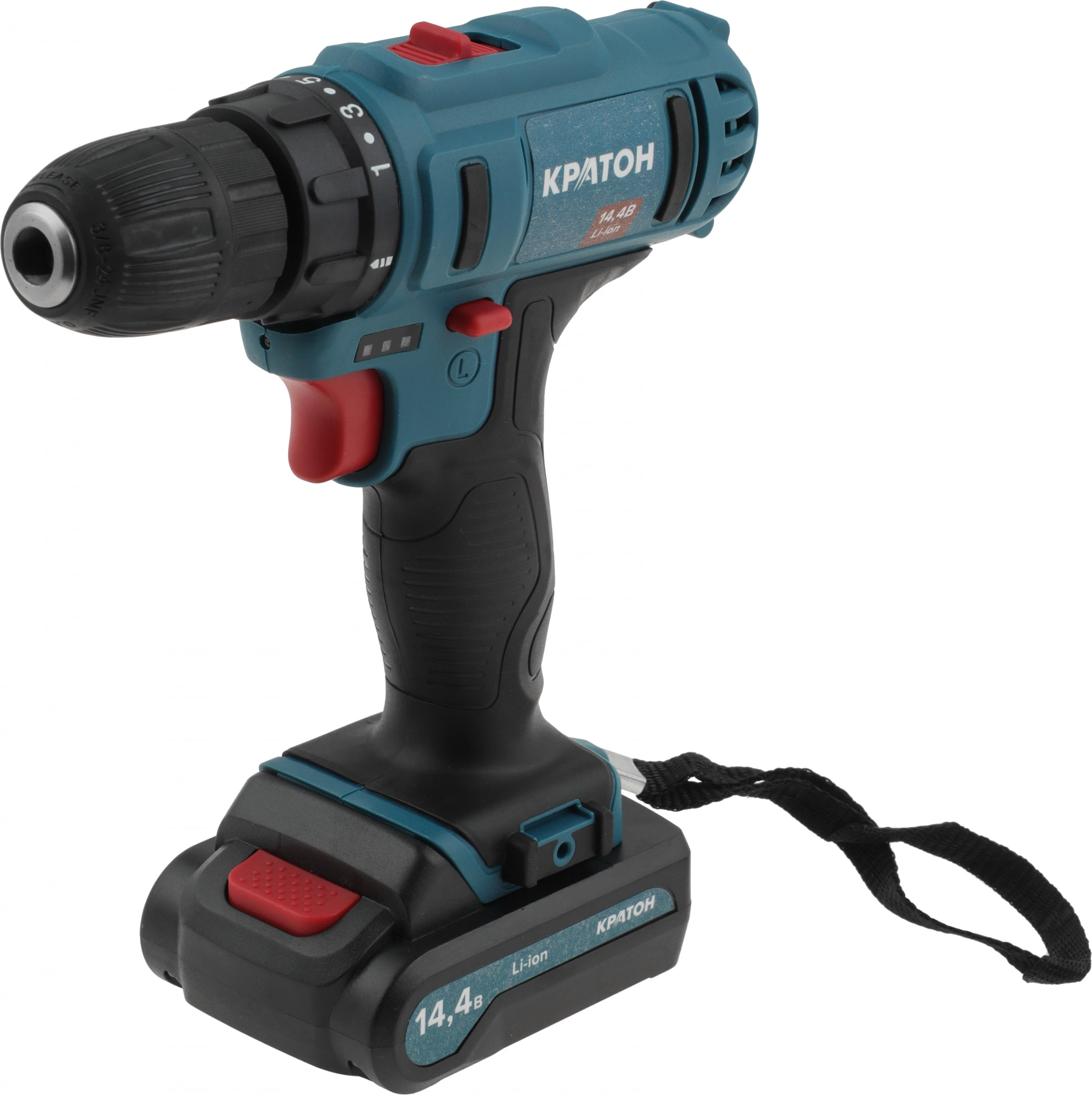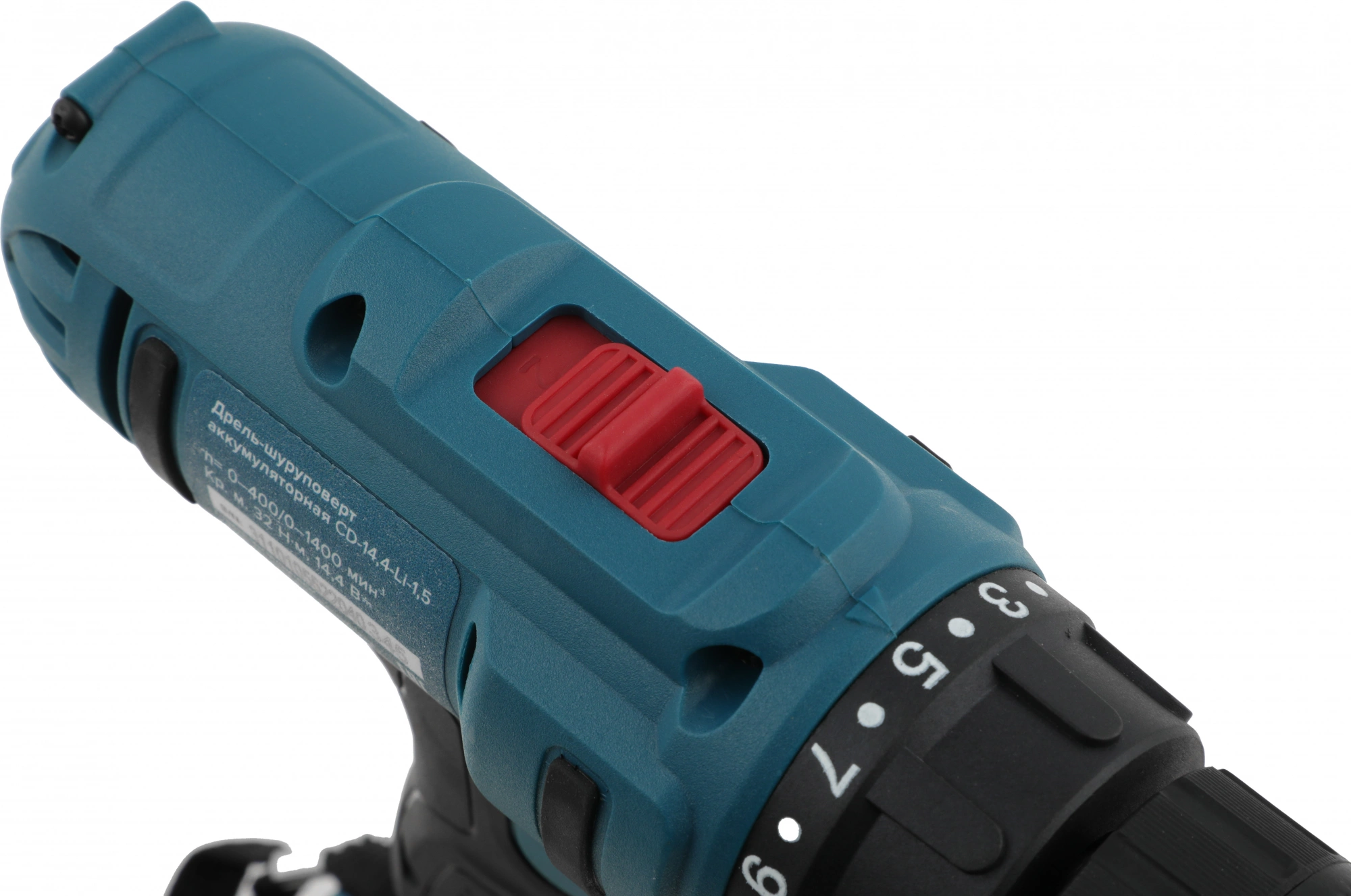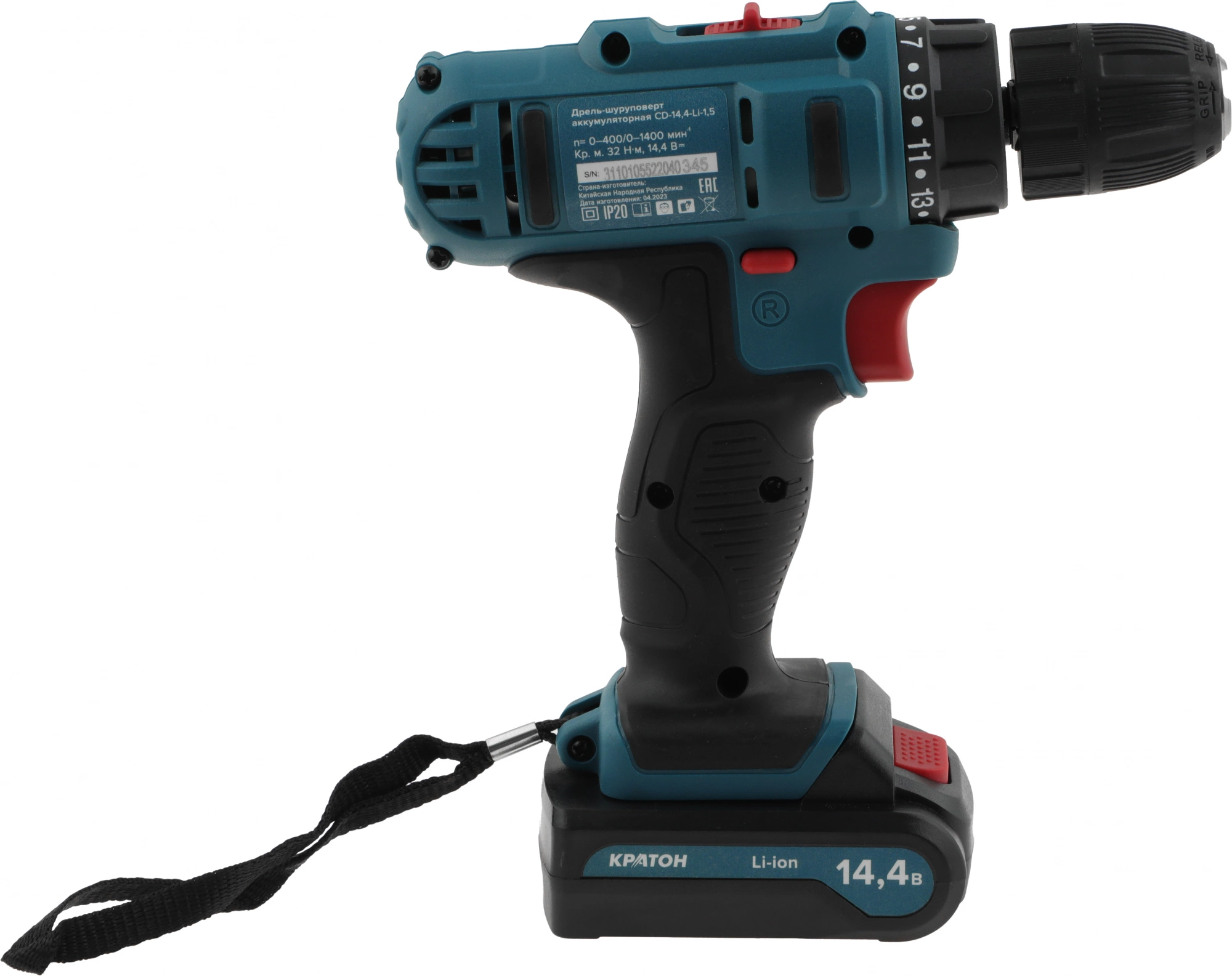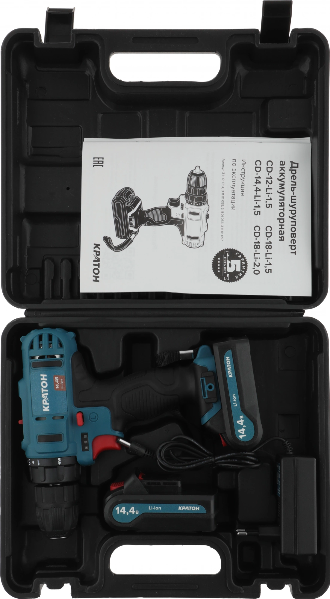 Дрель-шуруповерт, зарядное устройство, батарея аккумуляторная Li-ion, 14 В, 1,5 А·ч - 2 шт., сверло HSS 1,5; 2,5; 3; 4; 5; 6 мм - 6 шт., держатель бит магнитный, L = 60 мм., CR-V биты (насадки отверточные), 25 мм., 3; 4; 5; 6; PH1; PH2; T15; T20; H4; H5 - 10 шт., скоба.
